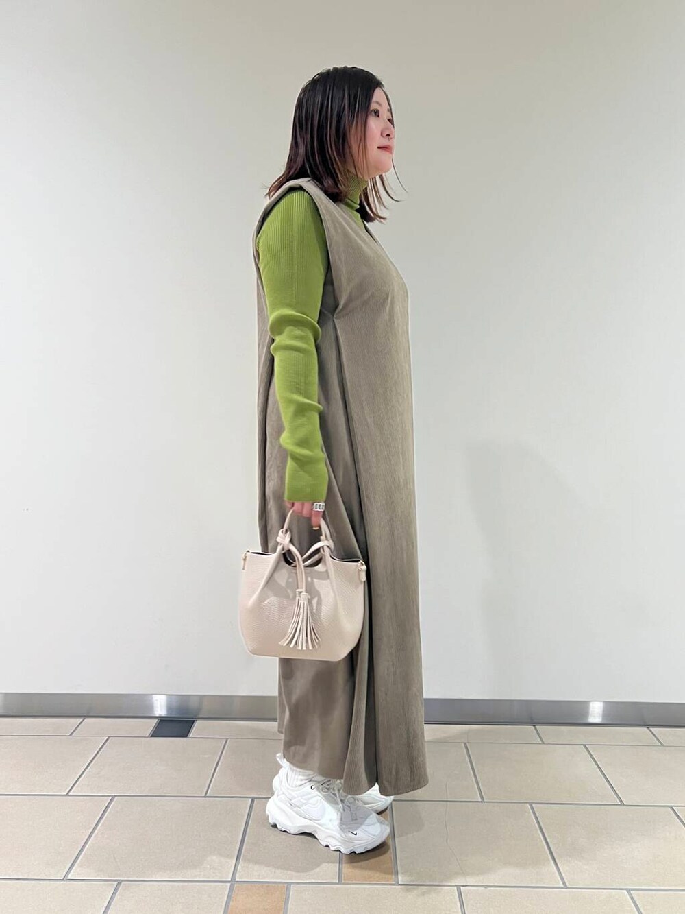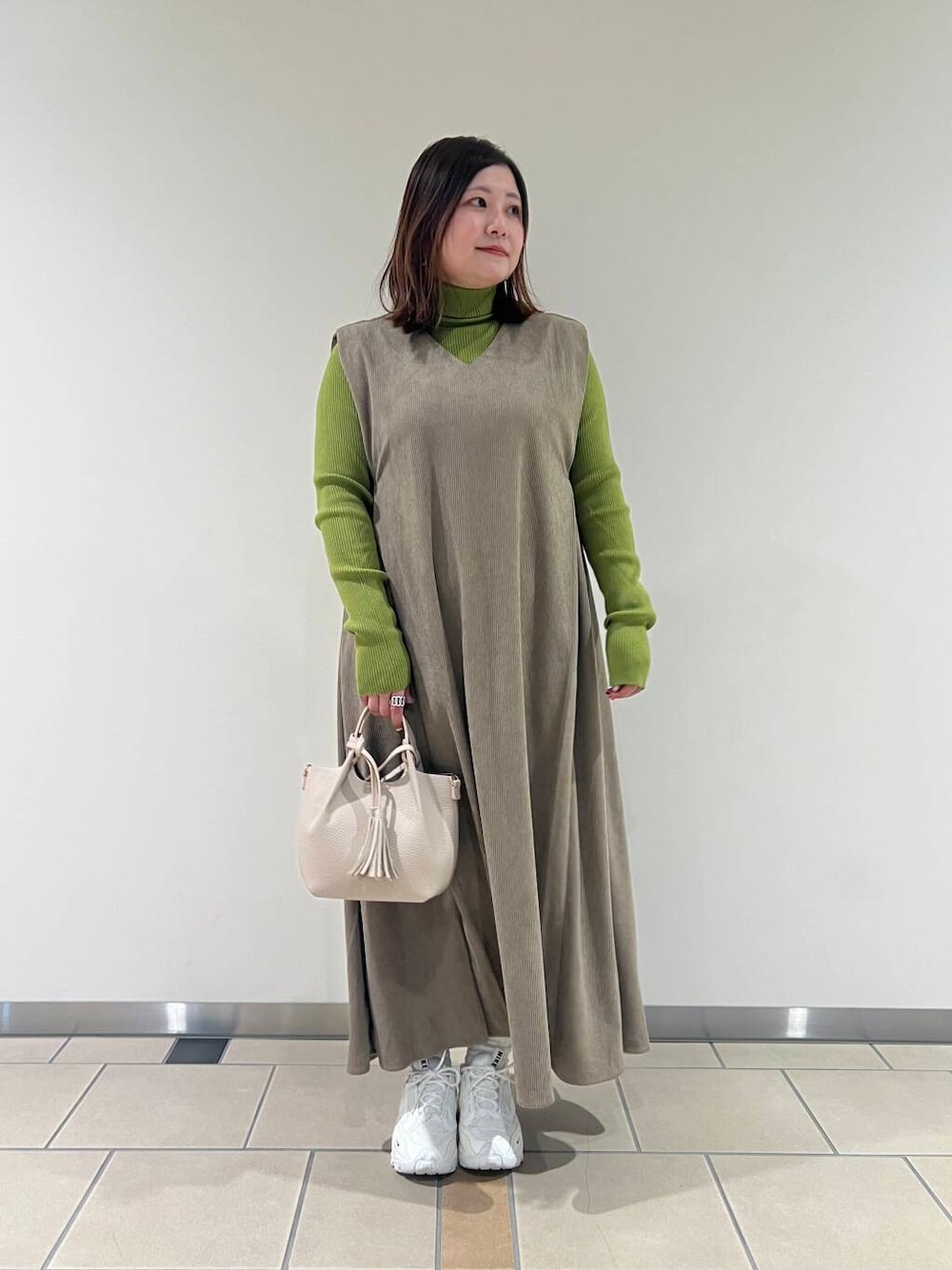 コーデュロイワンピースに薄手のハイネックニットを合わせた秋コーデです🍂