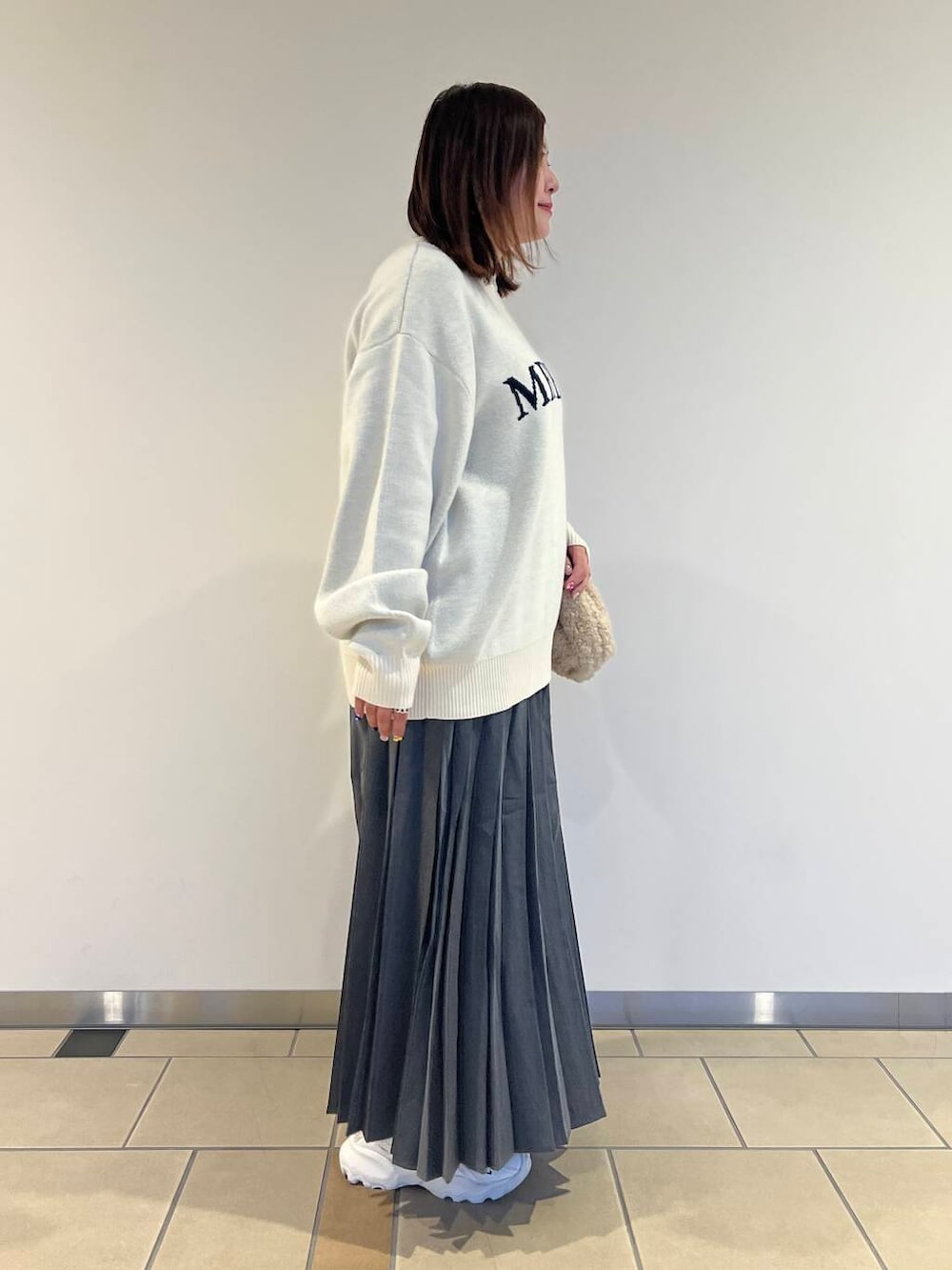 ゆったりとしたシルエットのロゴニットにプリーツスカートを合わせたカジュアルコーデです☺️