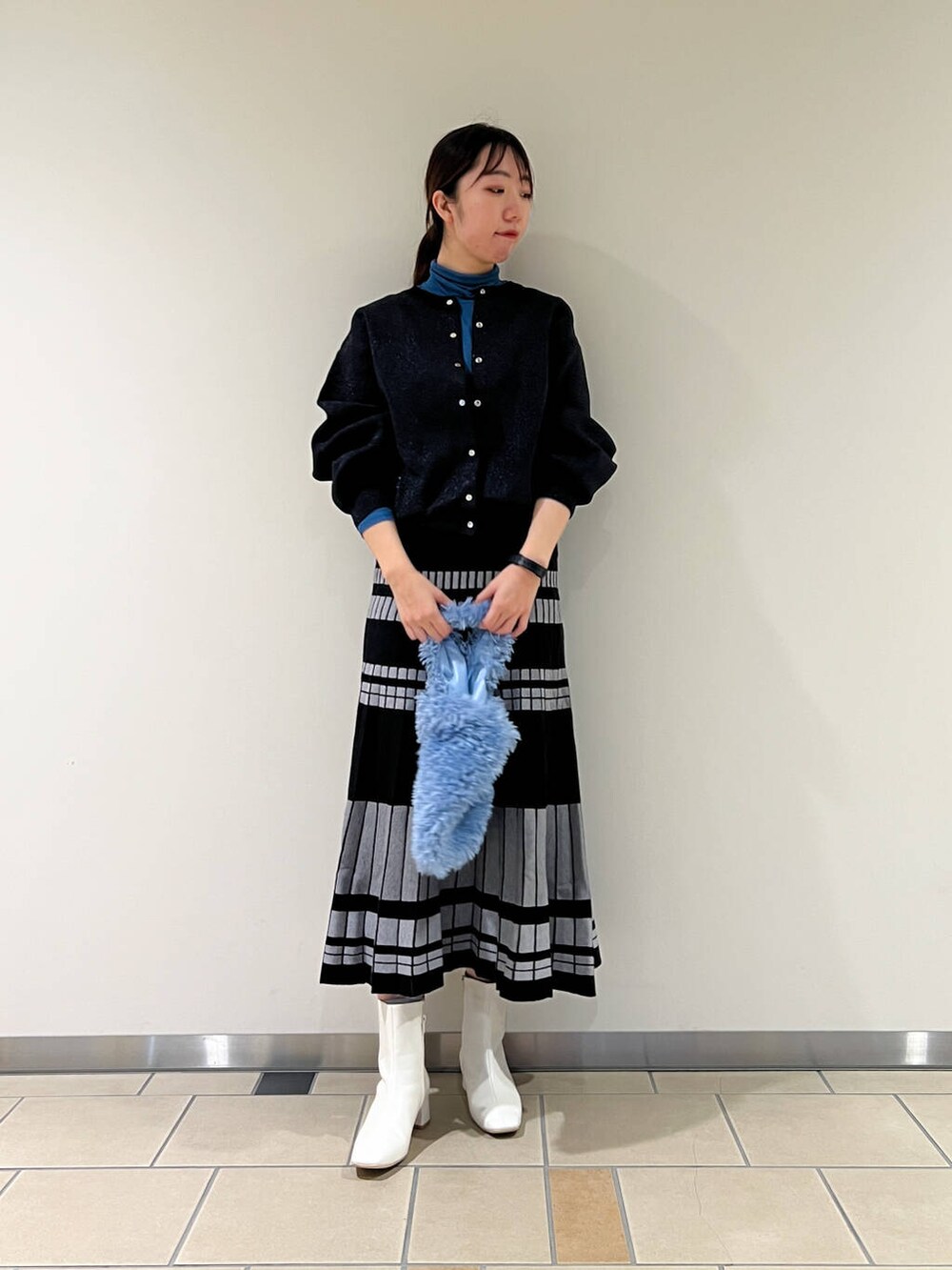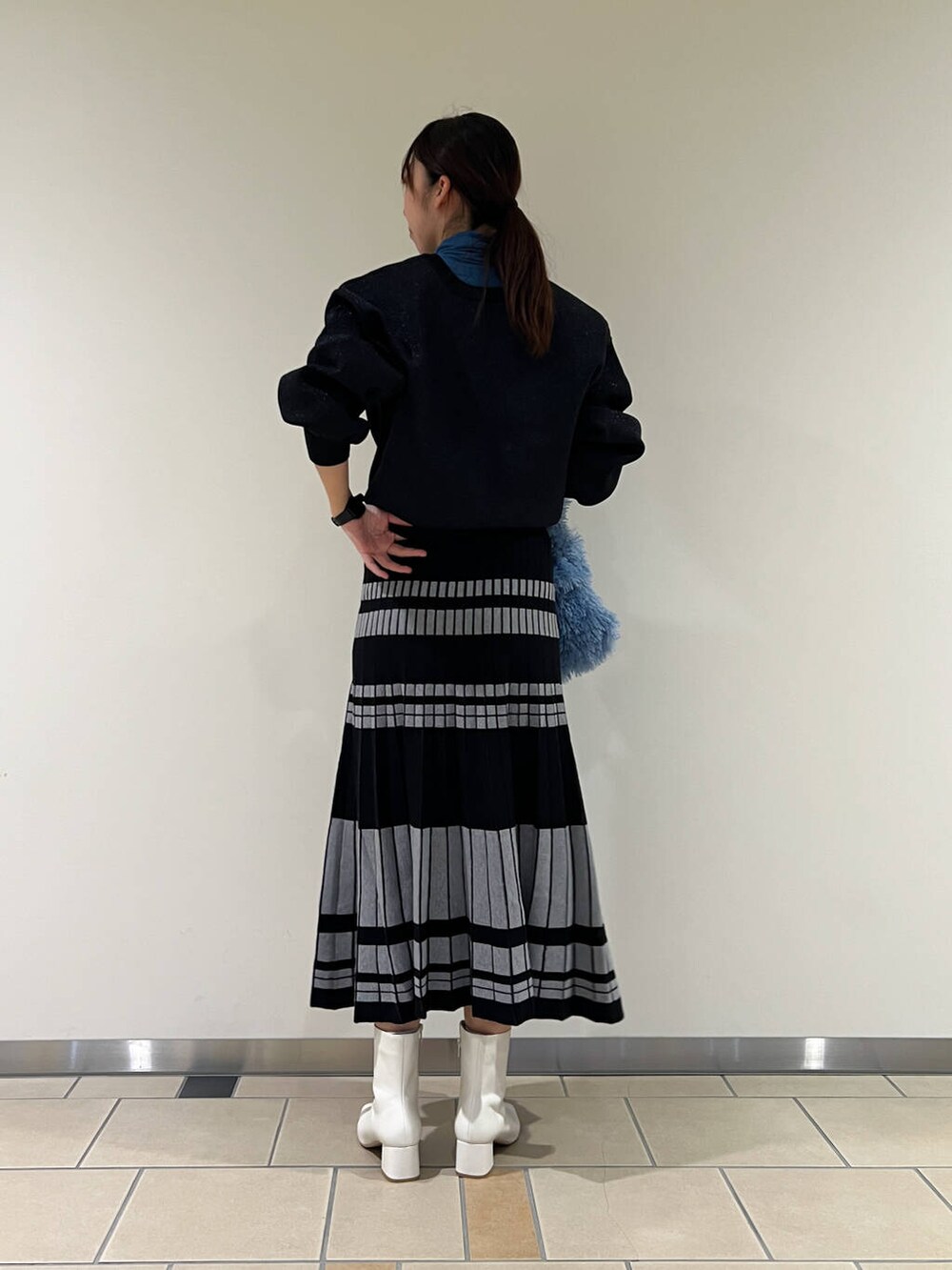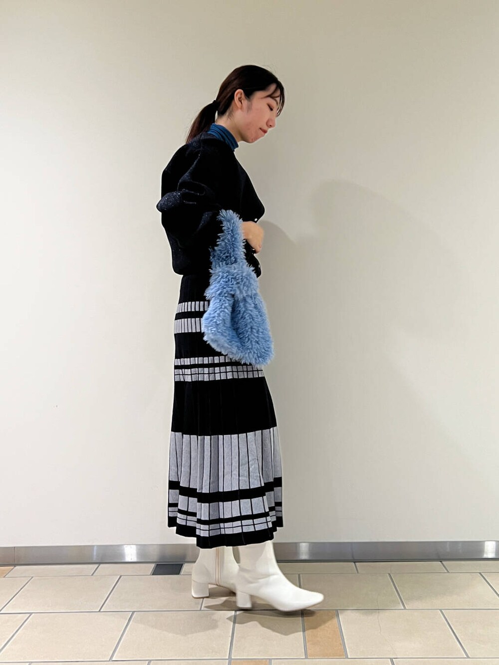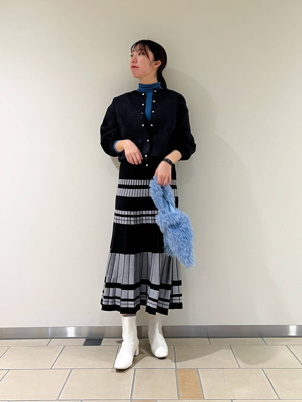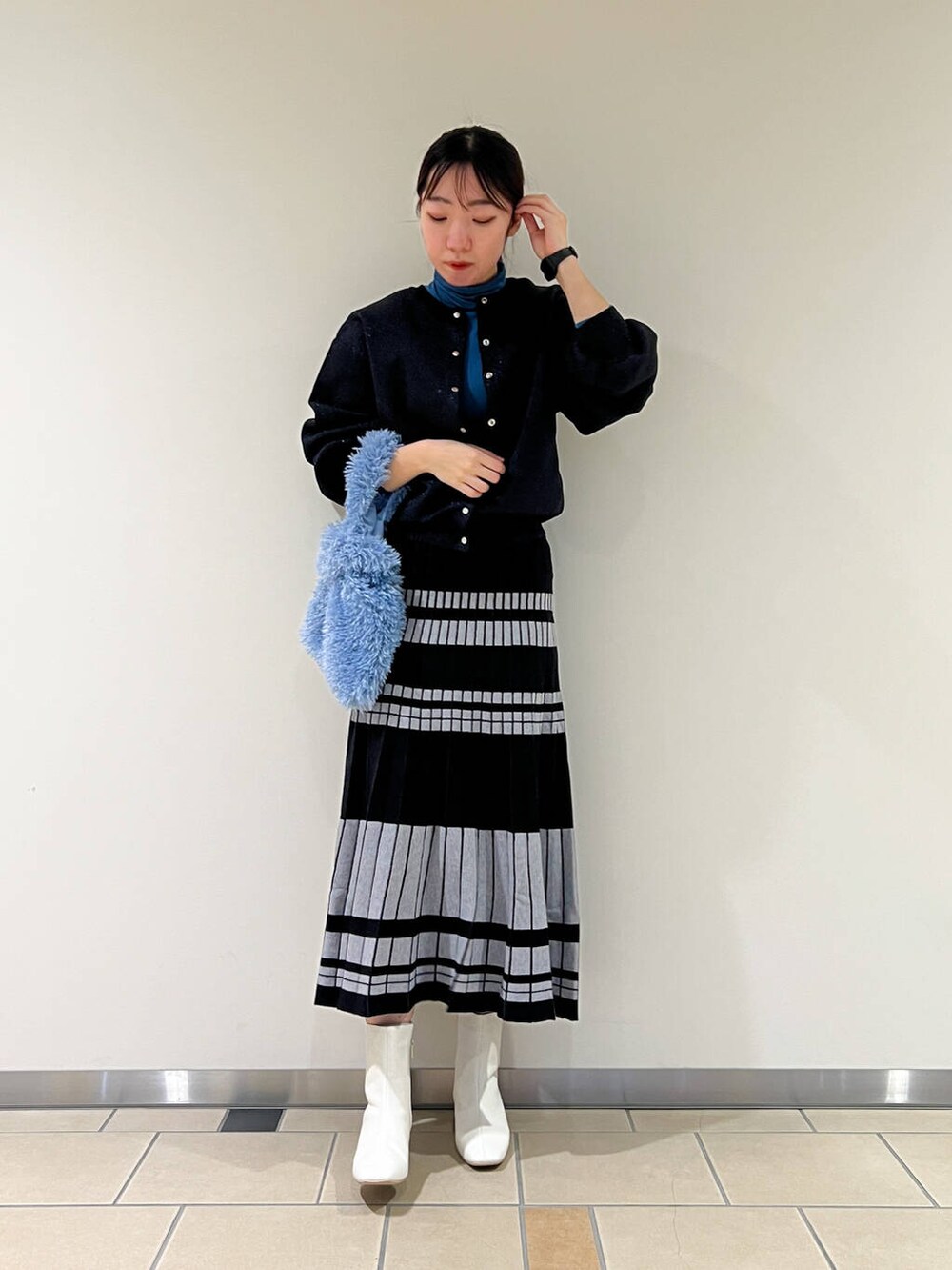ラメに青みが入っていたので鮮やかなブルーのカットソーを合わせました!伸縮性があるので柔らかく着やすいです!