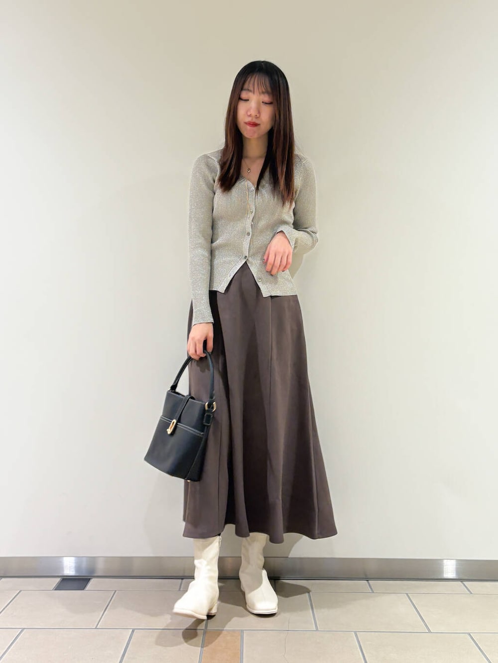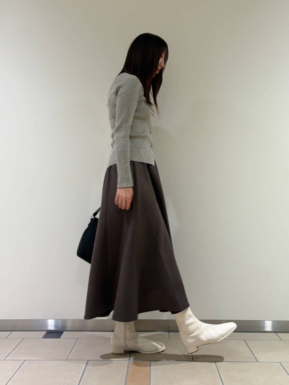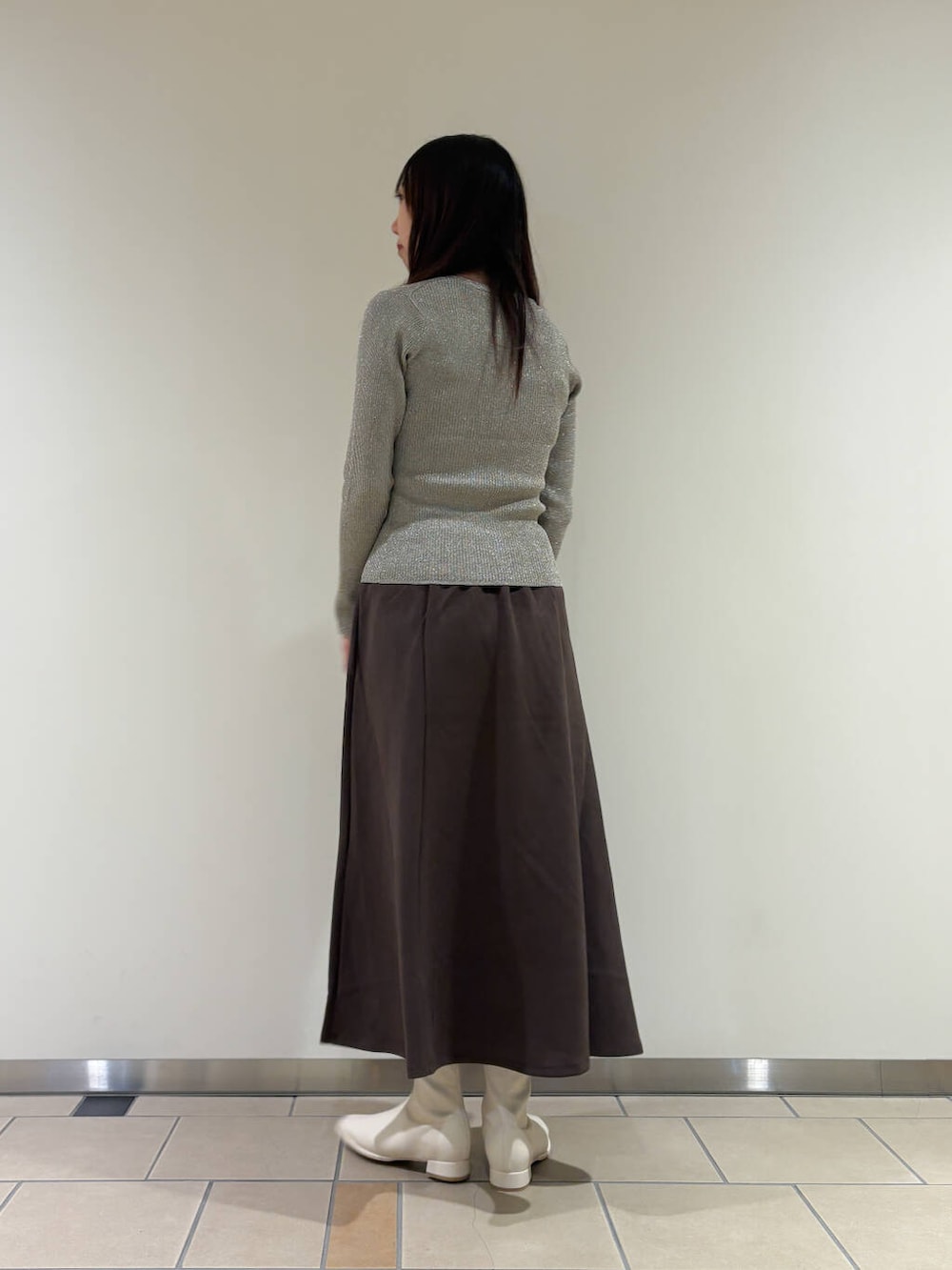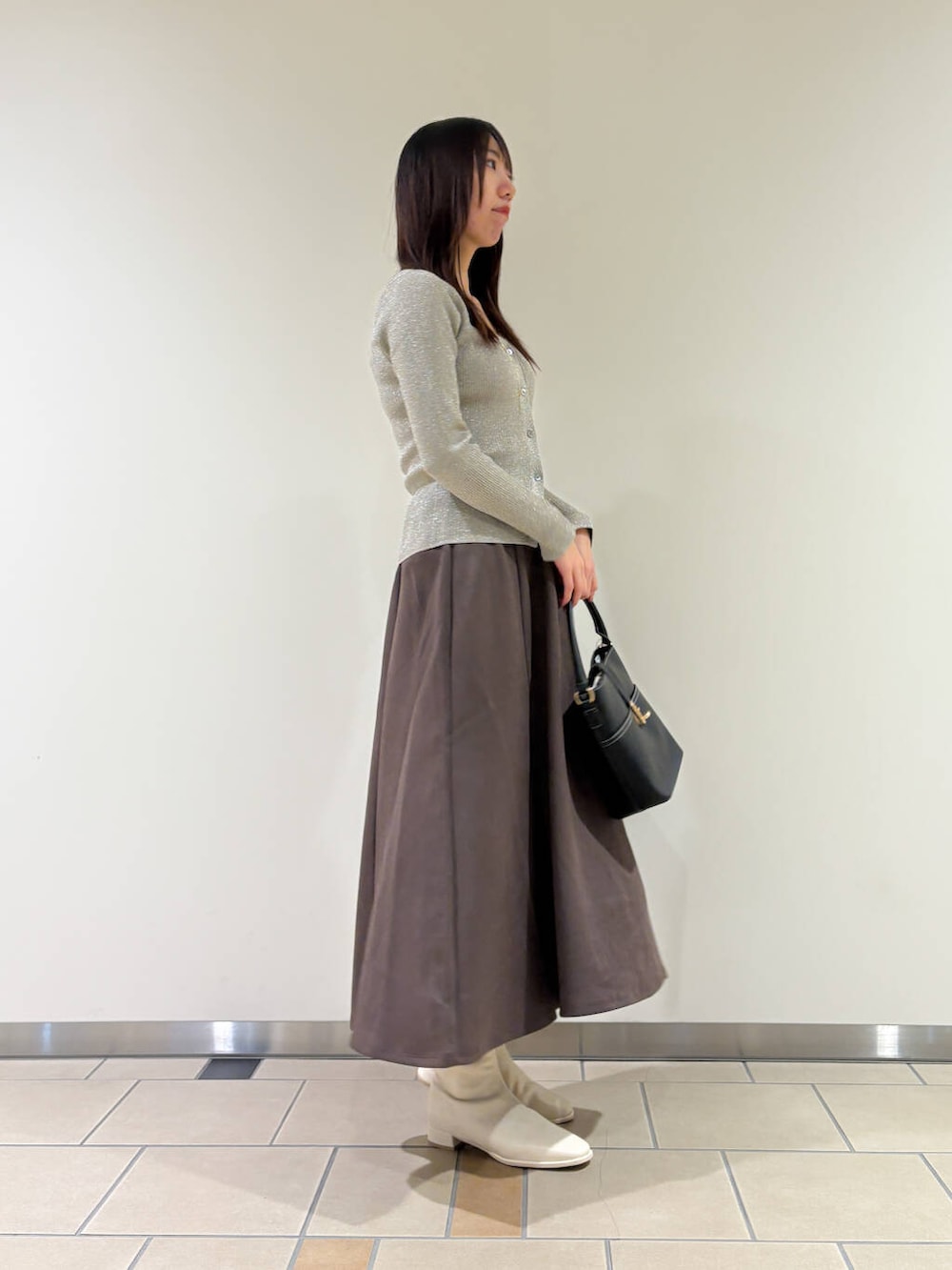 ボトムにはフレアスカートを合わせた綺麗めスタイルにしました!フェイクスエードなのでご自宅での手入れも可能です。カジュアルに着るならデニムもおすすめですよ♩