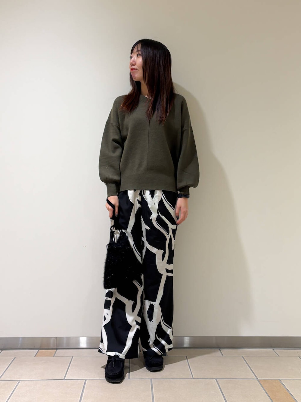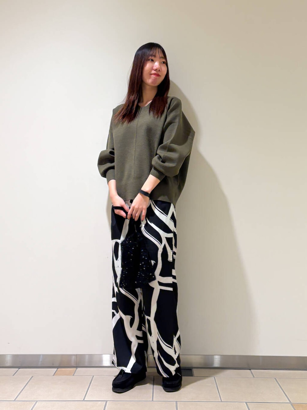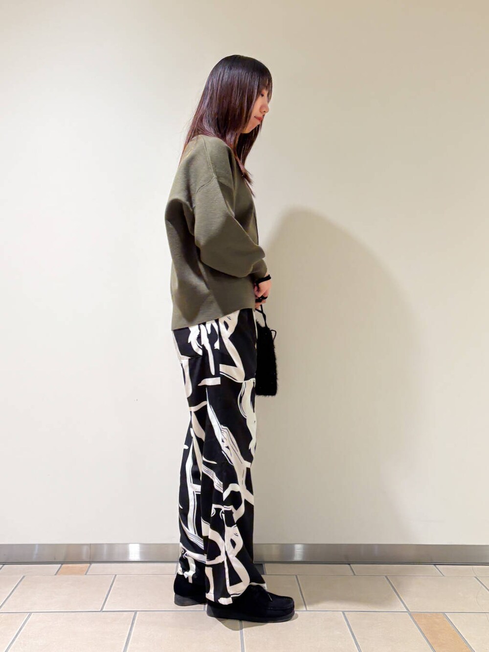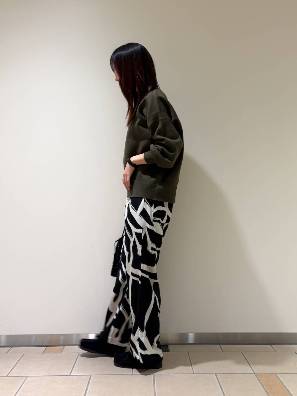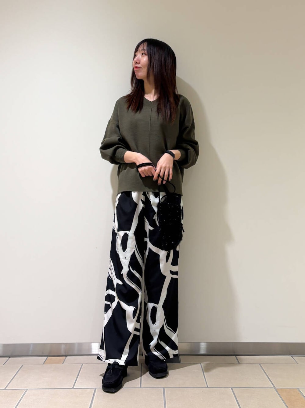 大きめ柄のイージーパンツとニットを合わせた大人コーデです◎