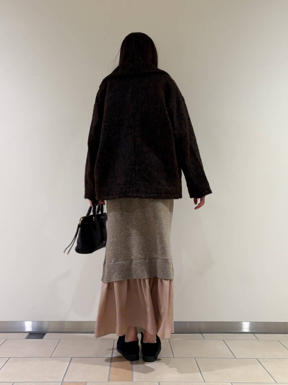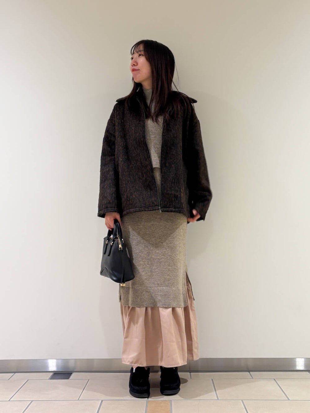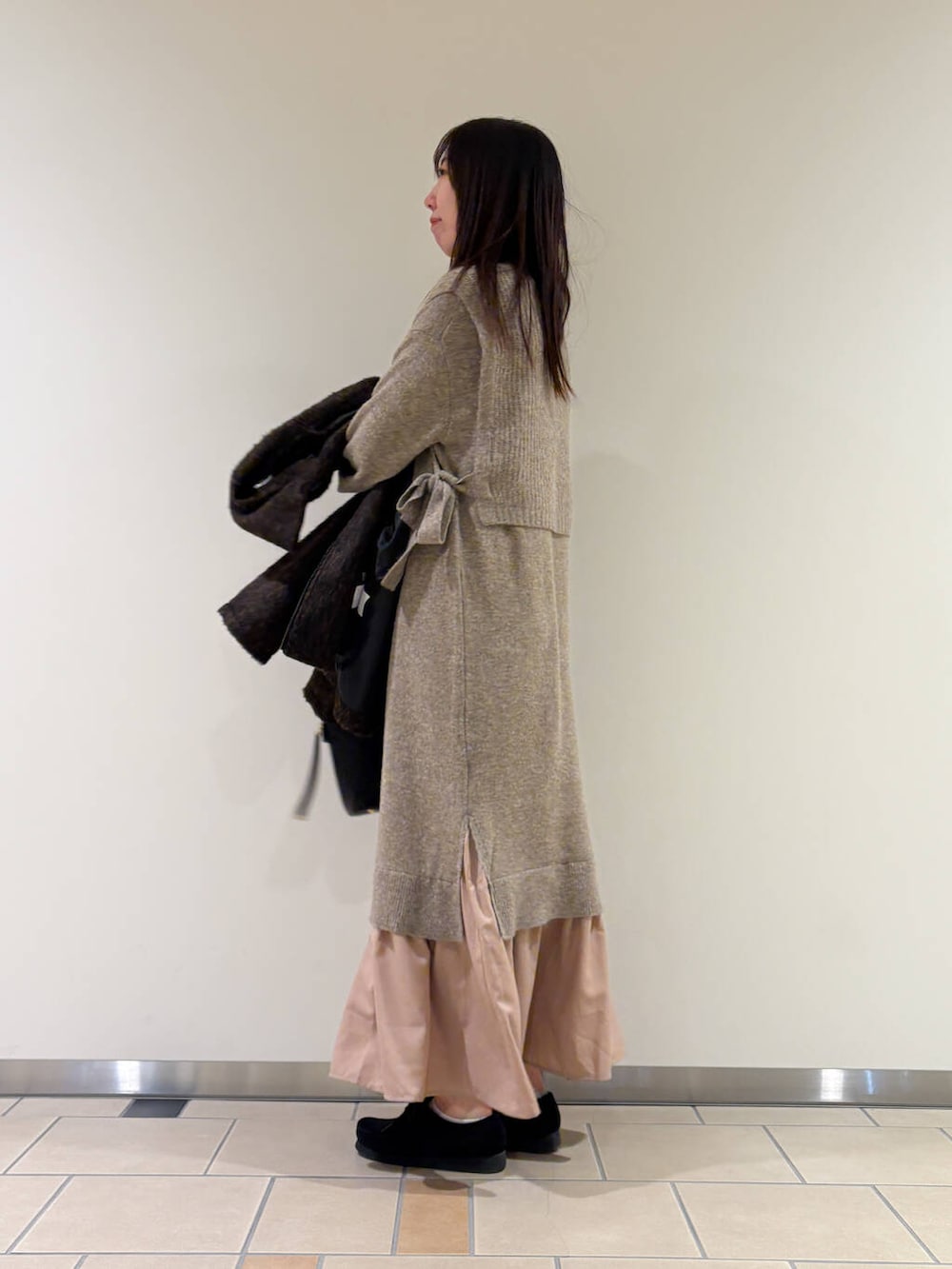 ニットベスト付きのワンピースにシャギーアウターを合わせた冬の綺麗めコーデです!
