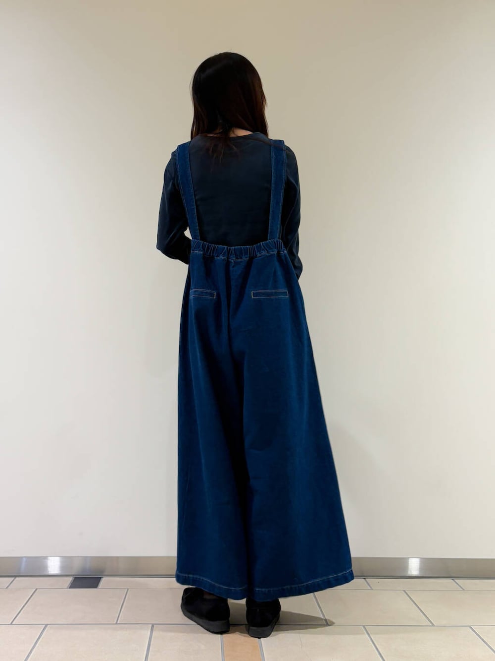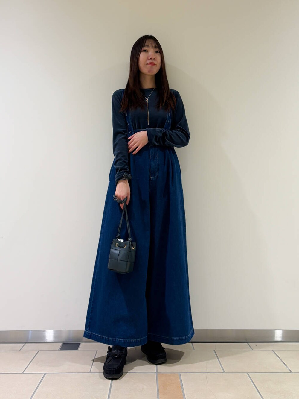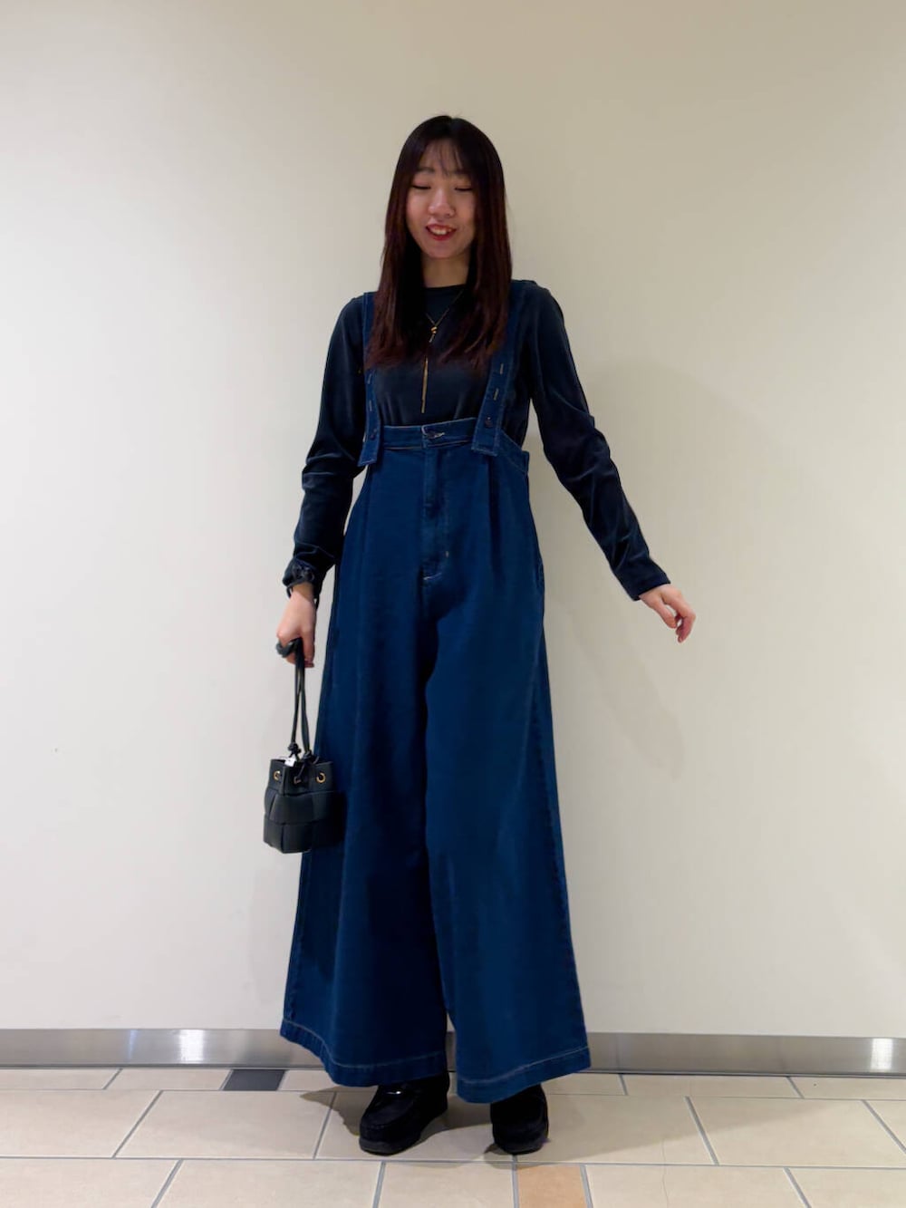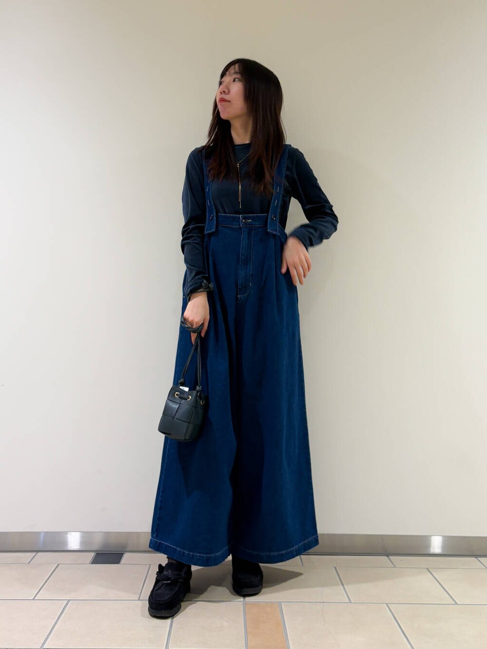 サロペットは子供っぽく見えがちですが、こちらだとウエストから紐があるのとワイドシルエットで大人見えします!そしてデニムにしてはとても軽い着心地でした◎
