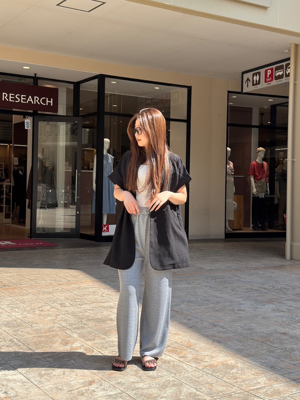 ボトムスにはライトグレーのカットイージーワイドパンツを取り入れ、ゆったりとしたシルエットで快適さとトレンド感を出して足元は黒のサンダルで軽快さをプラス!
