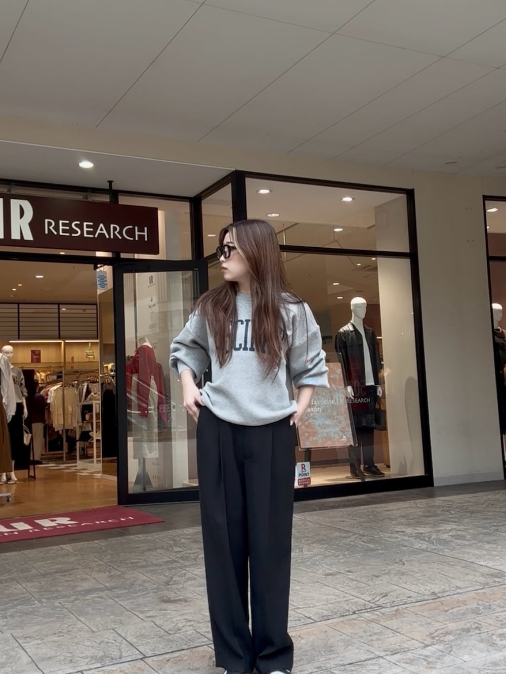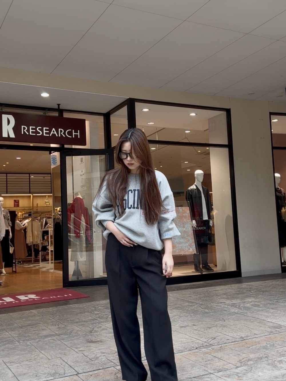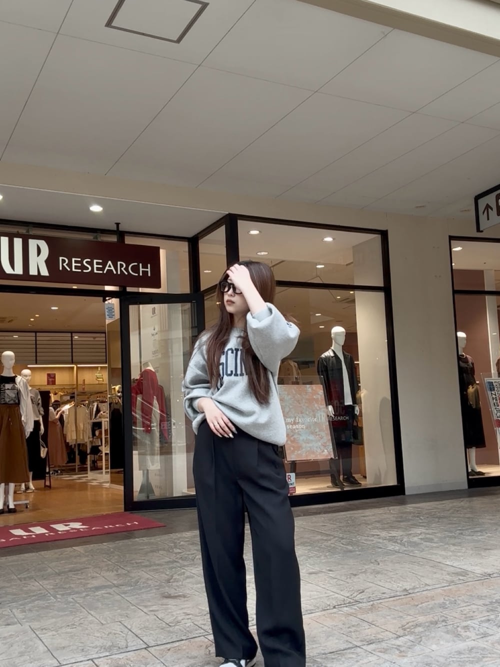 グレーのスウェットロゴニットに黒のワイドパンツを合わせ、モノトーンコーデ