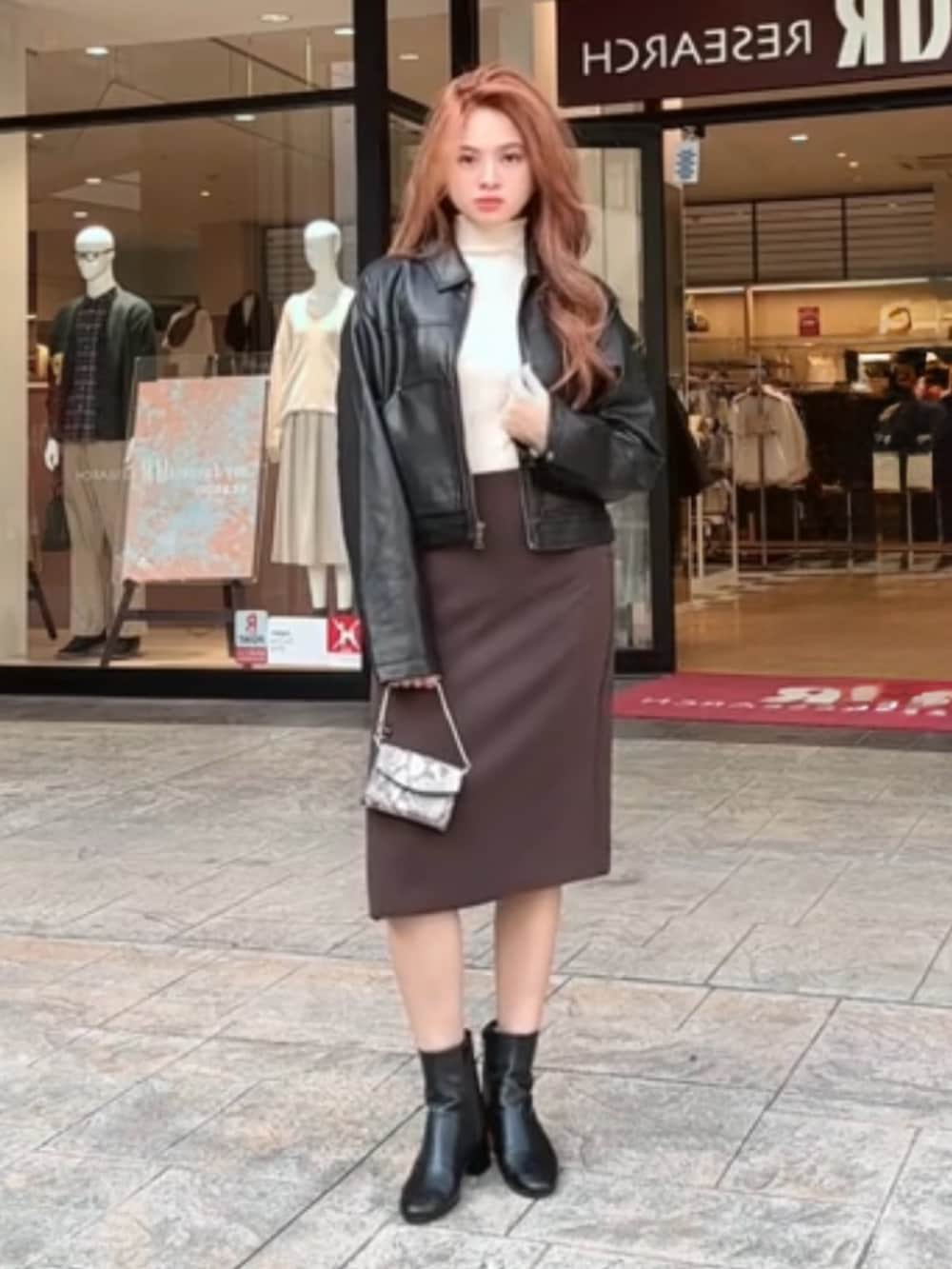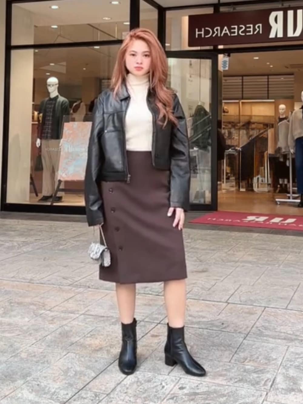ショートレザージャケットでスタイルアップを狙いながら、ブーツで季節感を演出。