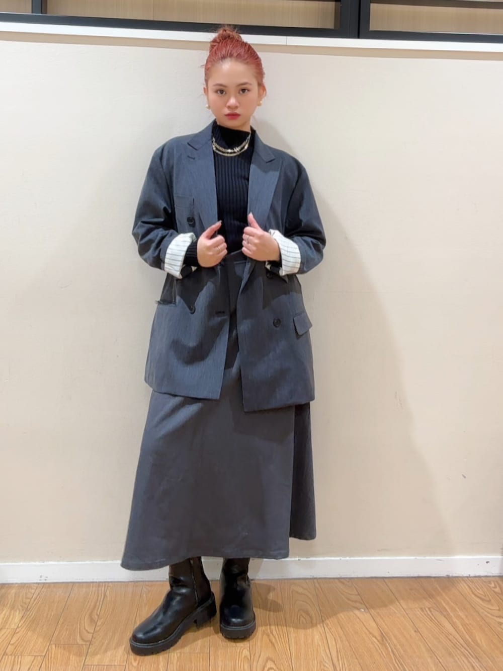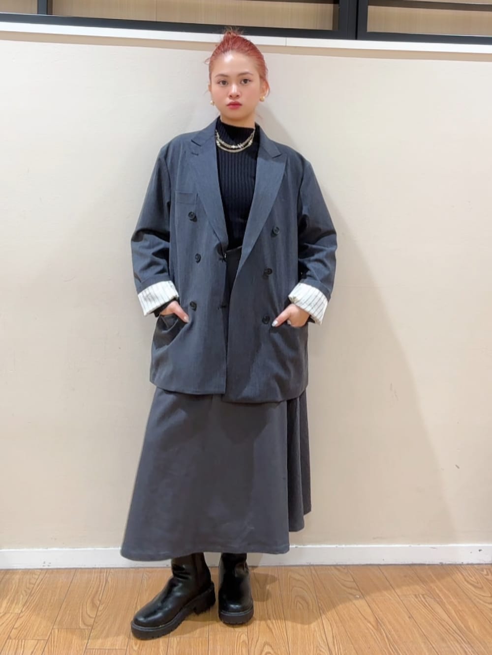 完声スフレ素材のフレアスカートが動くたびにきれいなシルエットを演出してくれて、ブーツ合わせで程よく抜け感もプラス。