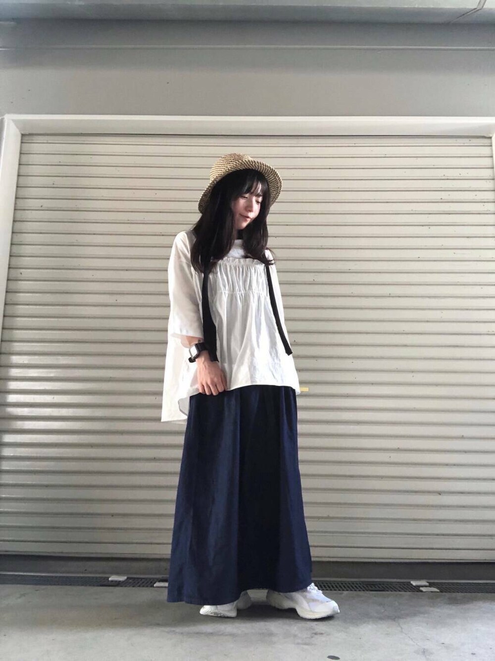 ギャザードッキングハンソデTシャツにデニムスカートで綺麗めカジュアルコーデにしました☺️