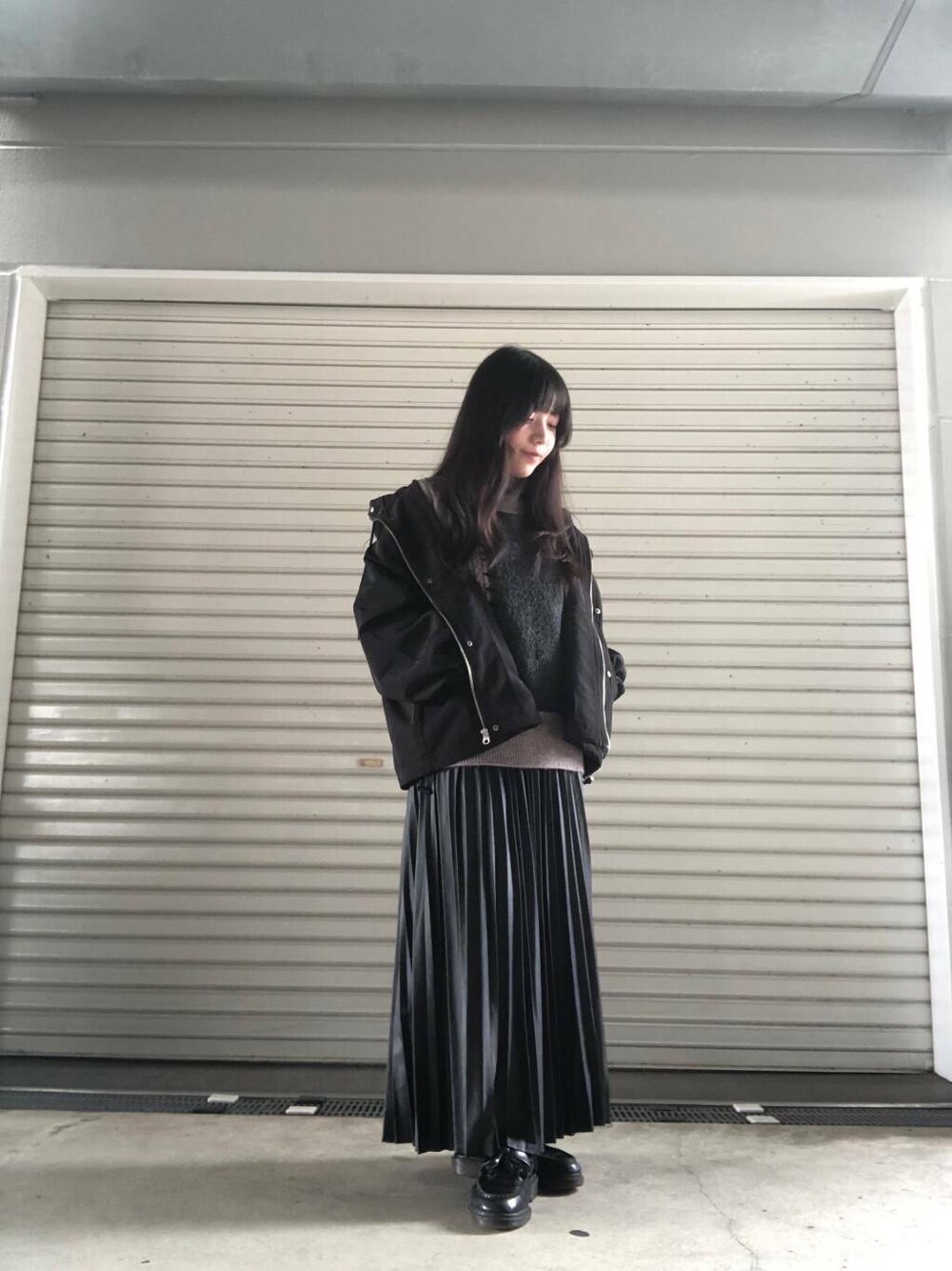 パッチワークデザインが目を引くニットにフェイクレザースカートで大人カジュアルコーデにしました☺️
