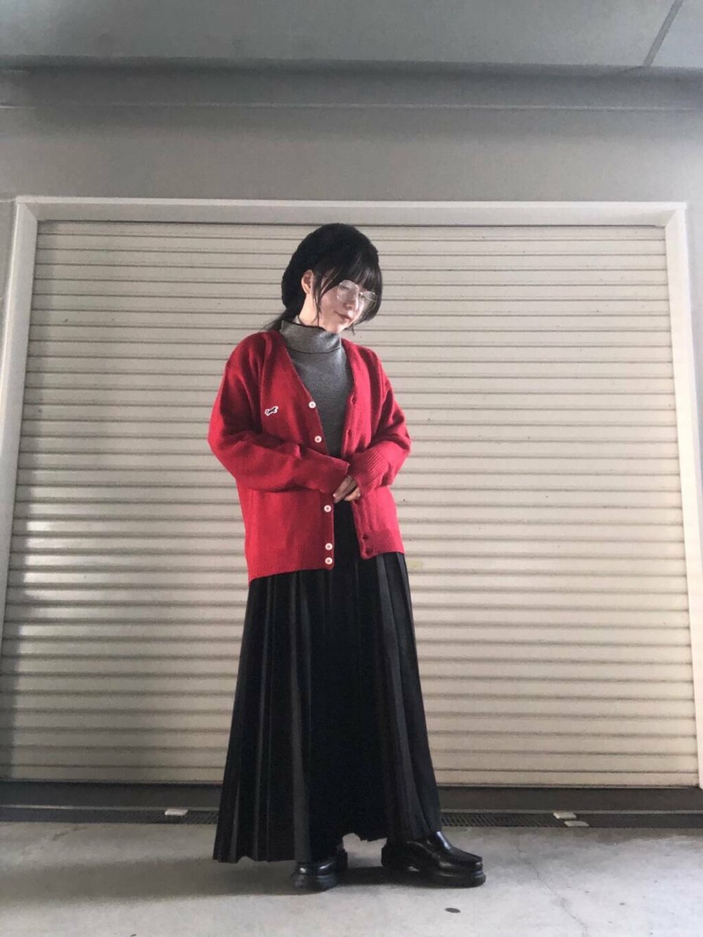 赤のFOXニットカーディガンは暗くなりがちなシンプルコーデの差し色に◎