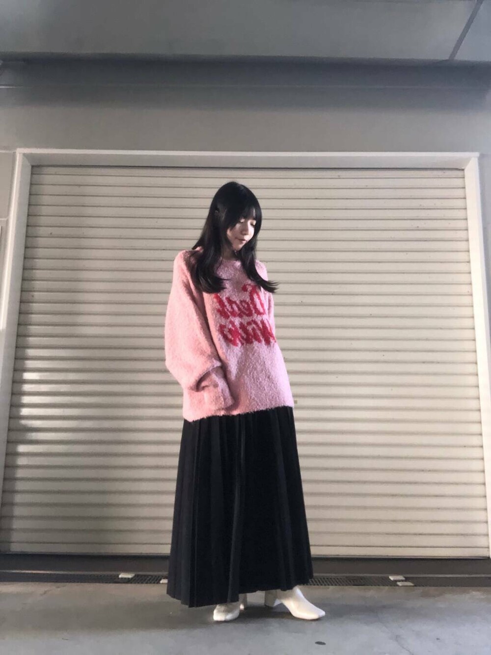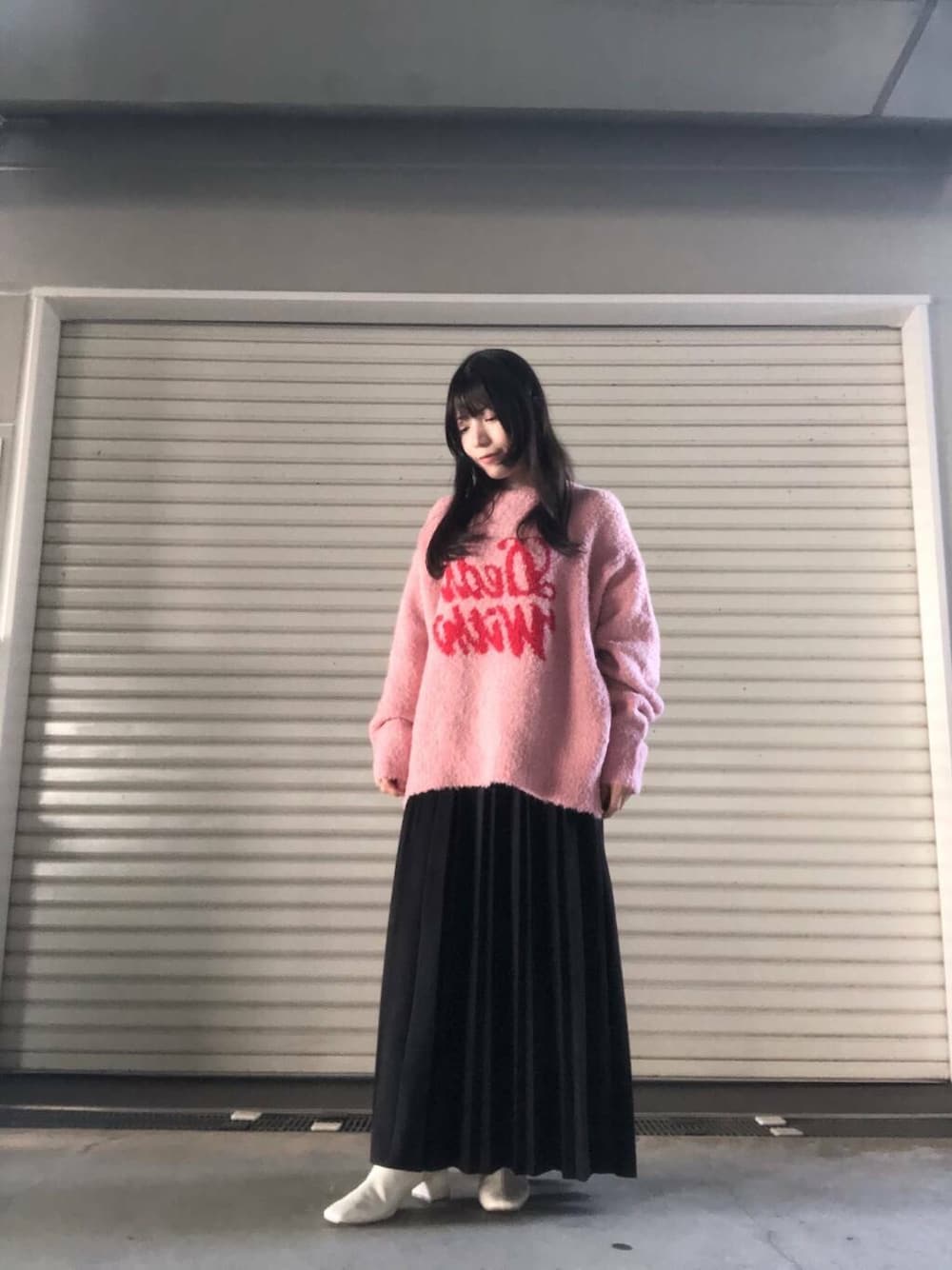 ピンクに赤文字の配色が可愛いニットにフェイクスエードプリーツスカートで楽ちんゆるコーデにしました♪