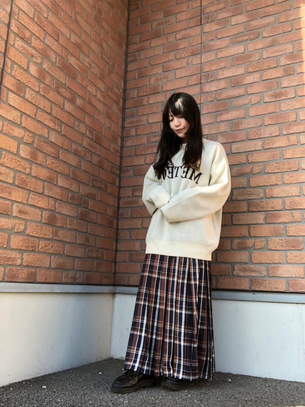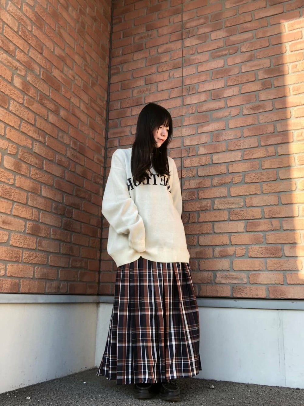ゆったりシルエットのスウェットライクロゴニットにチェックプリーツスカートで楽ちんカジュアルコーデにしました☺️