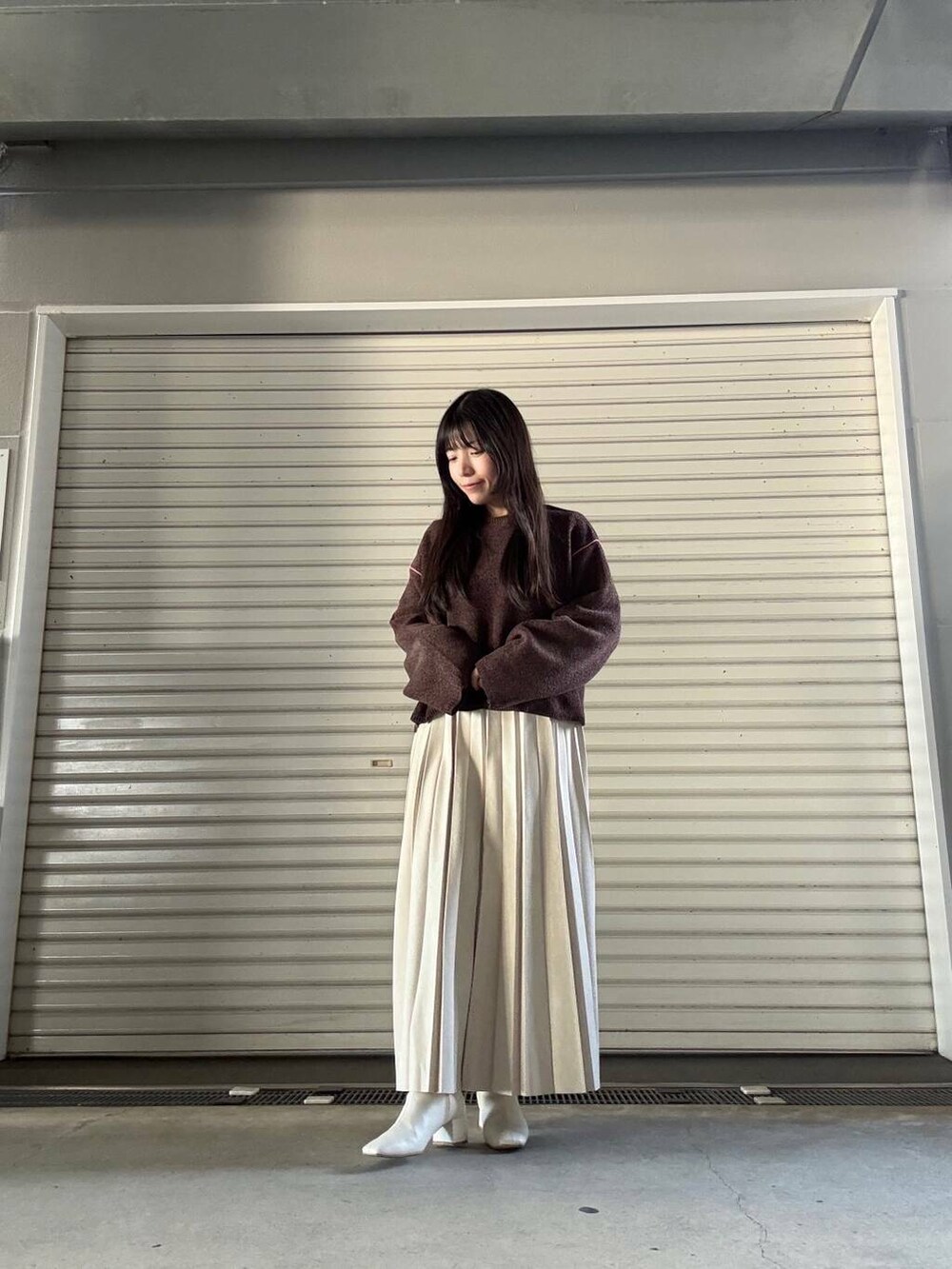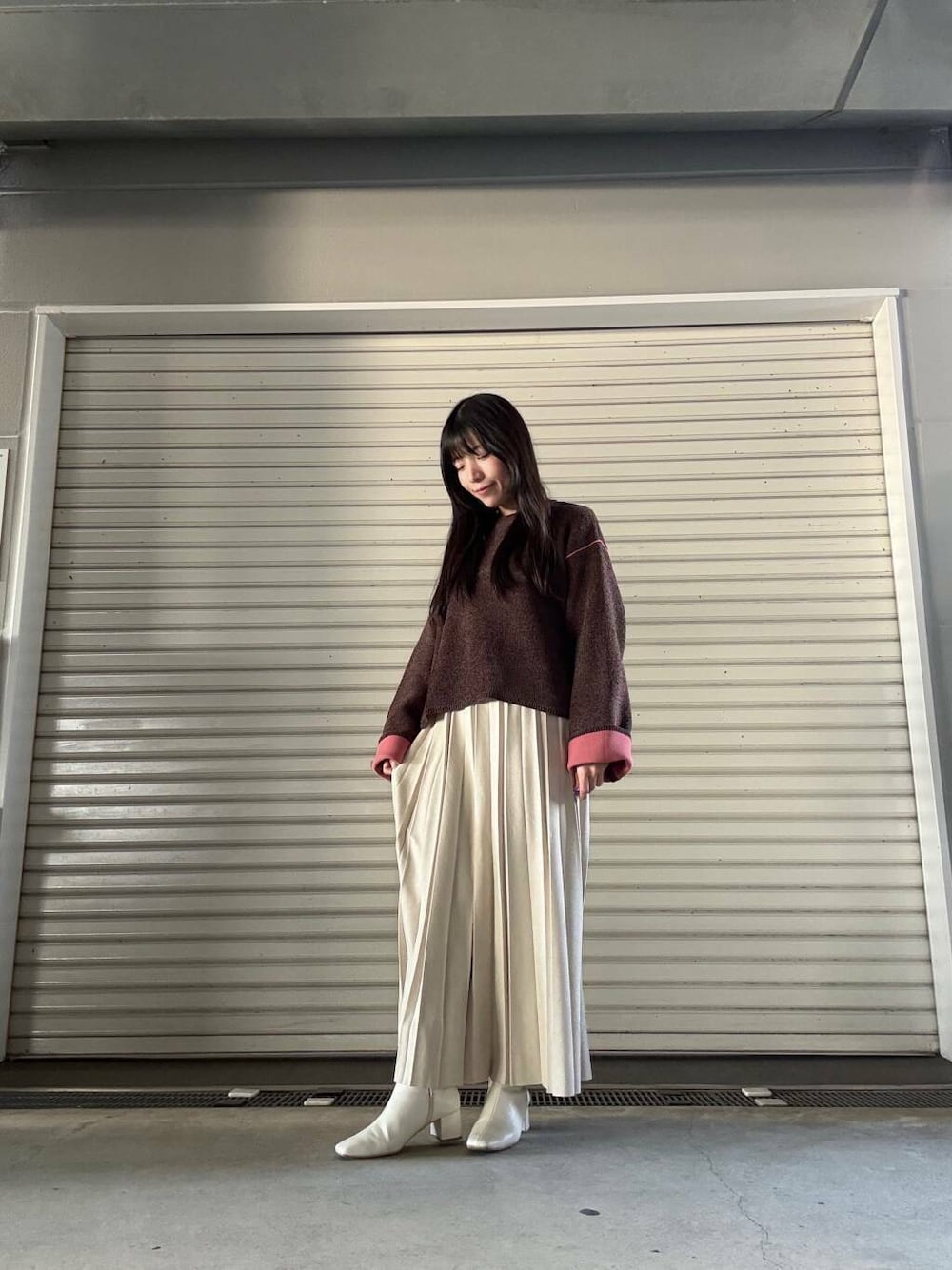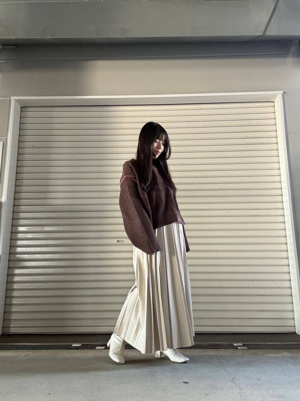 ライトベージュのプリーツスカートはあわせやすくて着回しにも◎