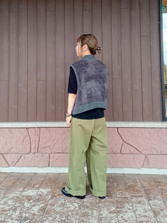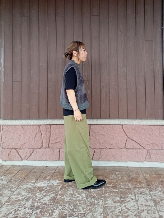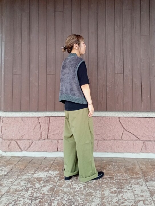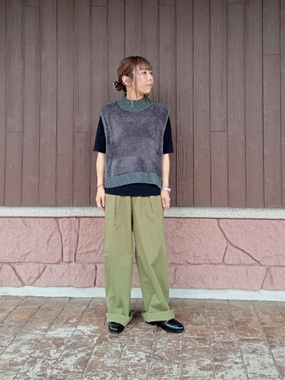 半そでニットとタックパンツを合わせて晩夏コーデに。