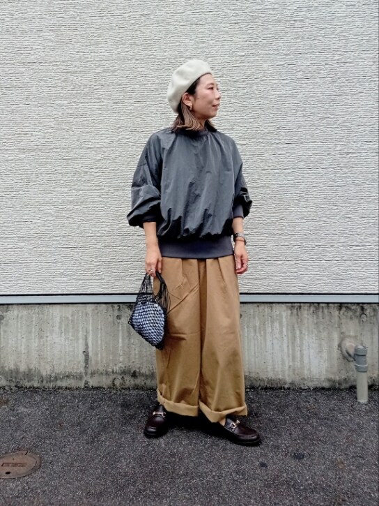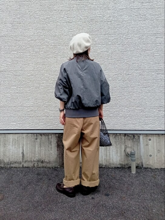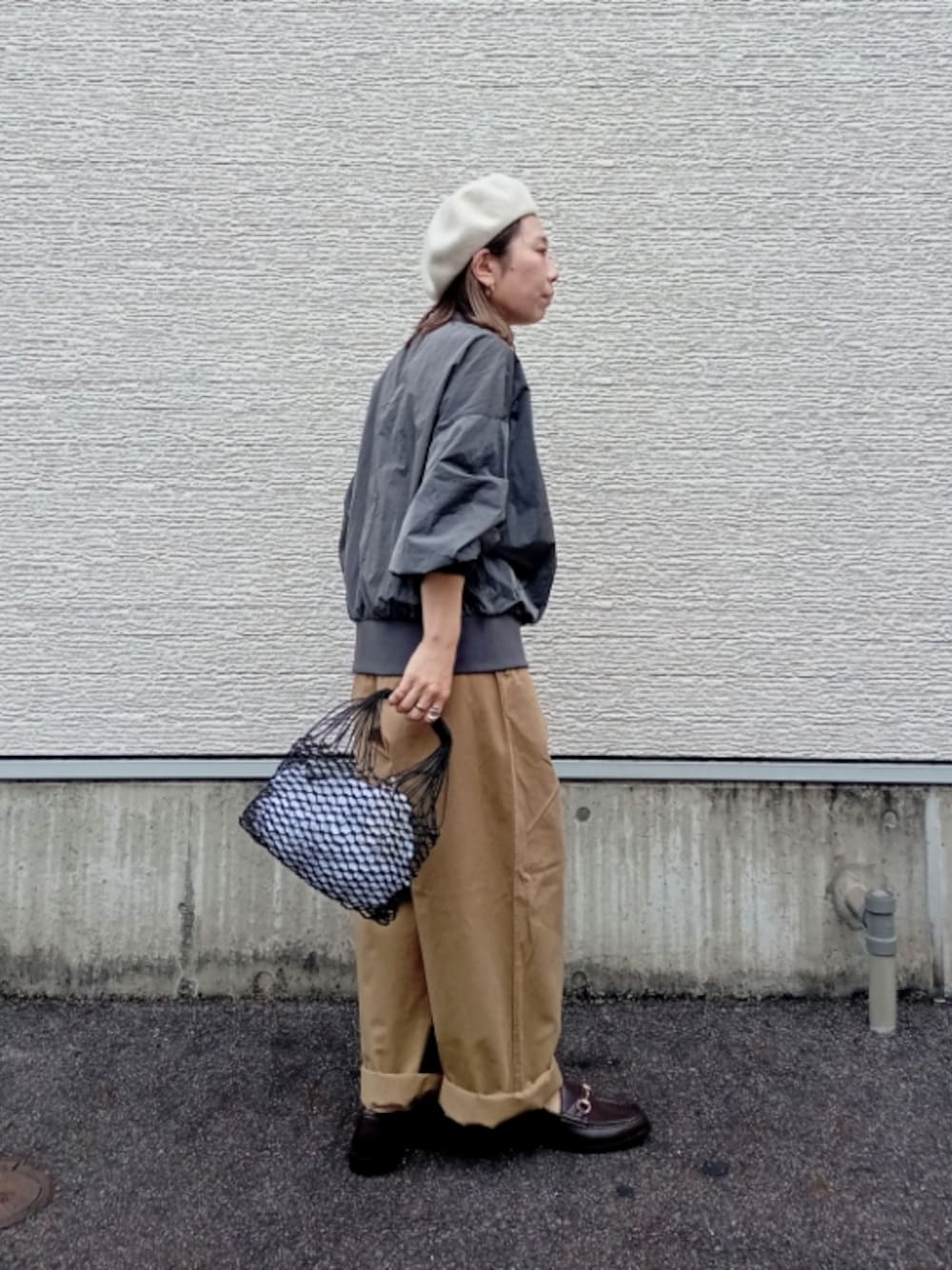 タックの入ったチノパンはルーズなシルエットで動きやすくておすすめ。