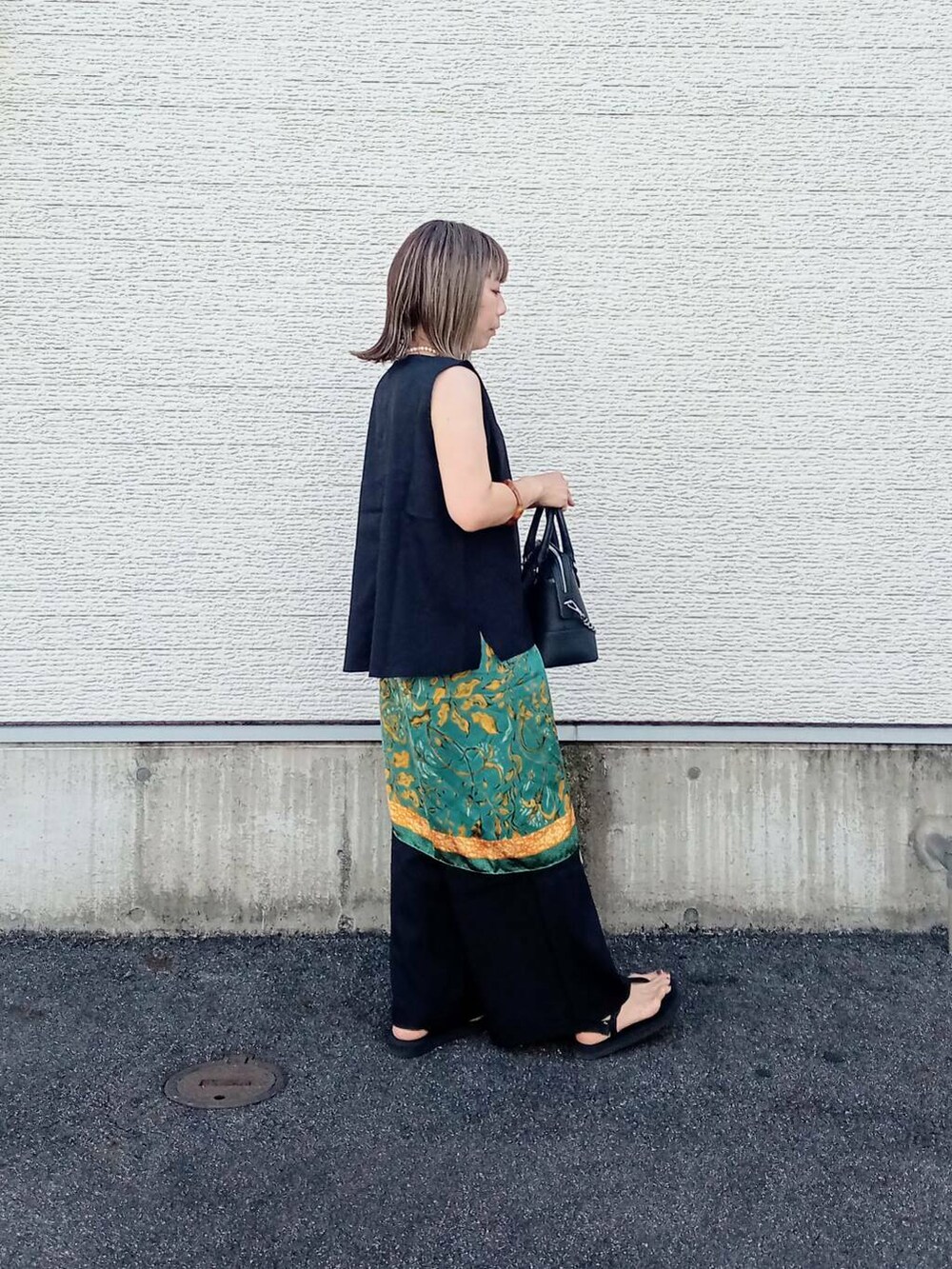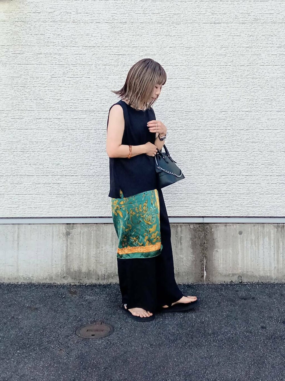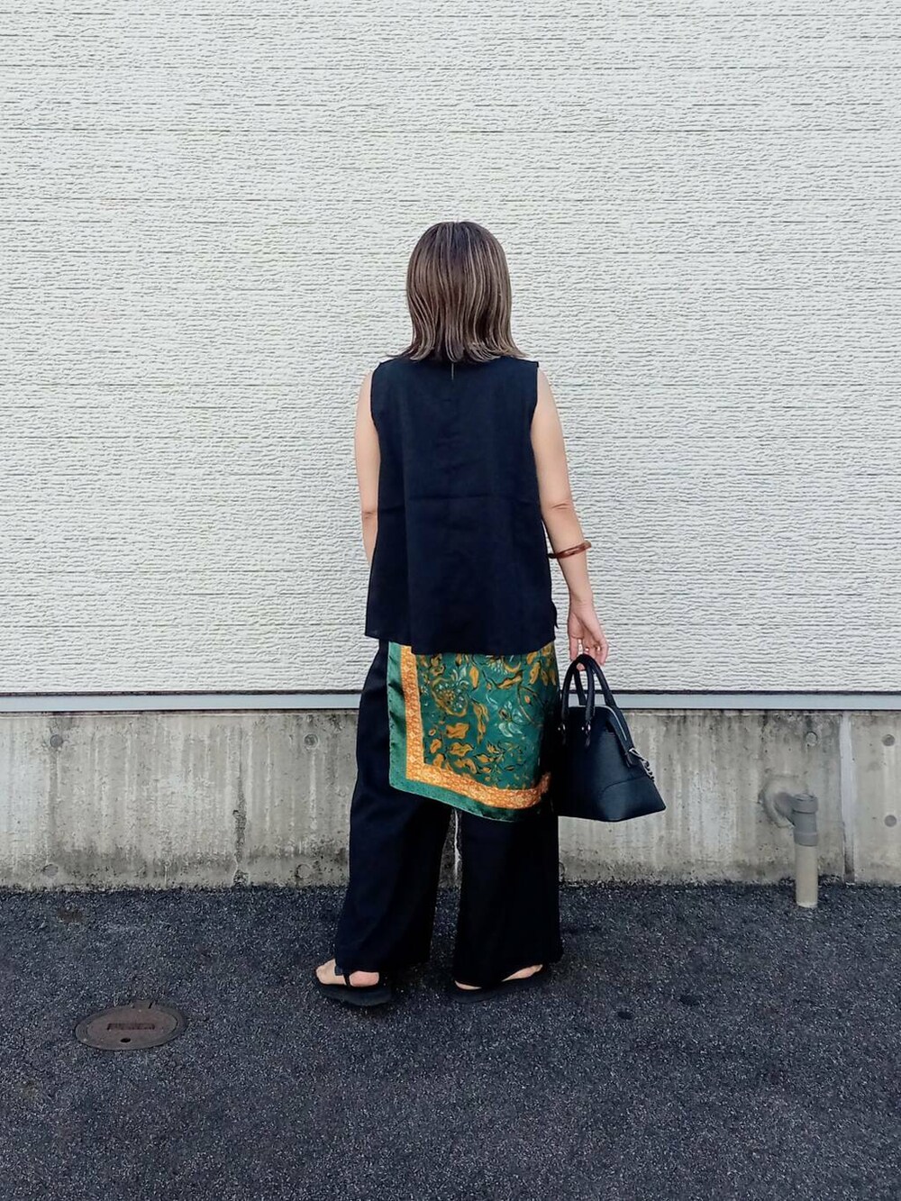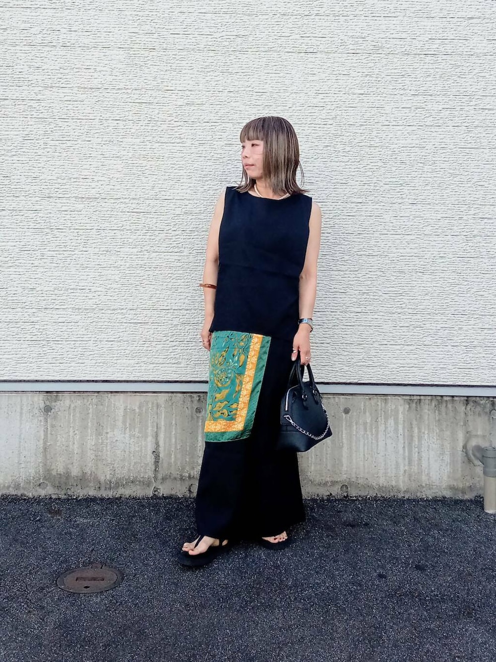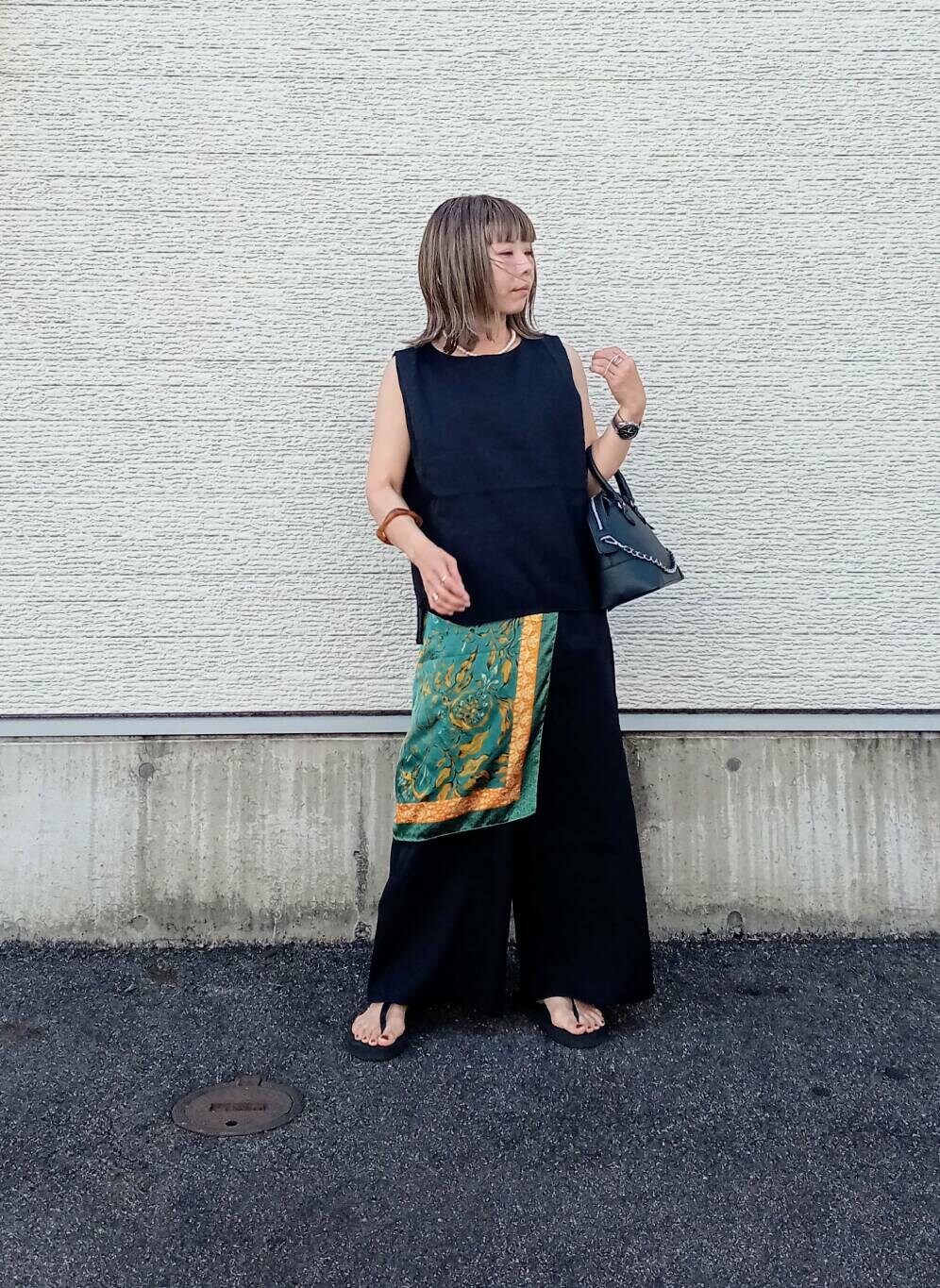 シンプルなデザインなのでスカーフを腰に巻いてアクセントに。