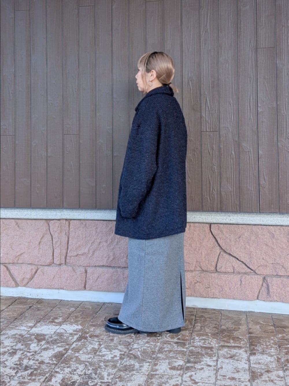 身長150センチの私には少し長めの作りです。羽織ったジャケットはラメ糸が編み込まれており華やかさをプラスしてくれます✨️オーバーサイズで着脱も楽です。