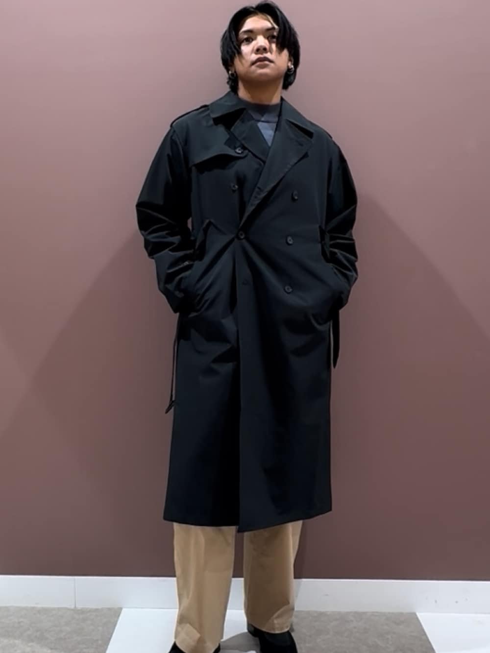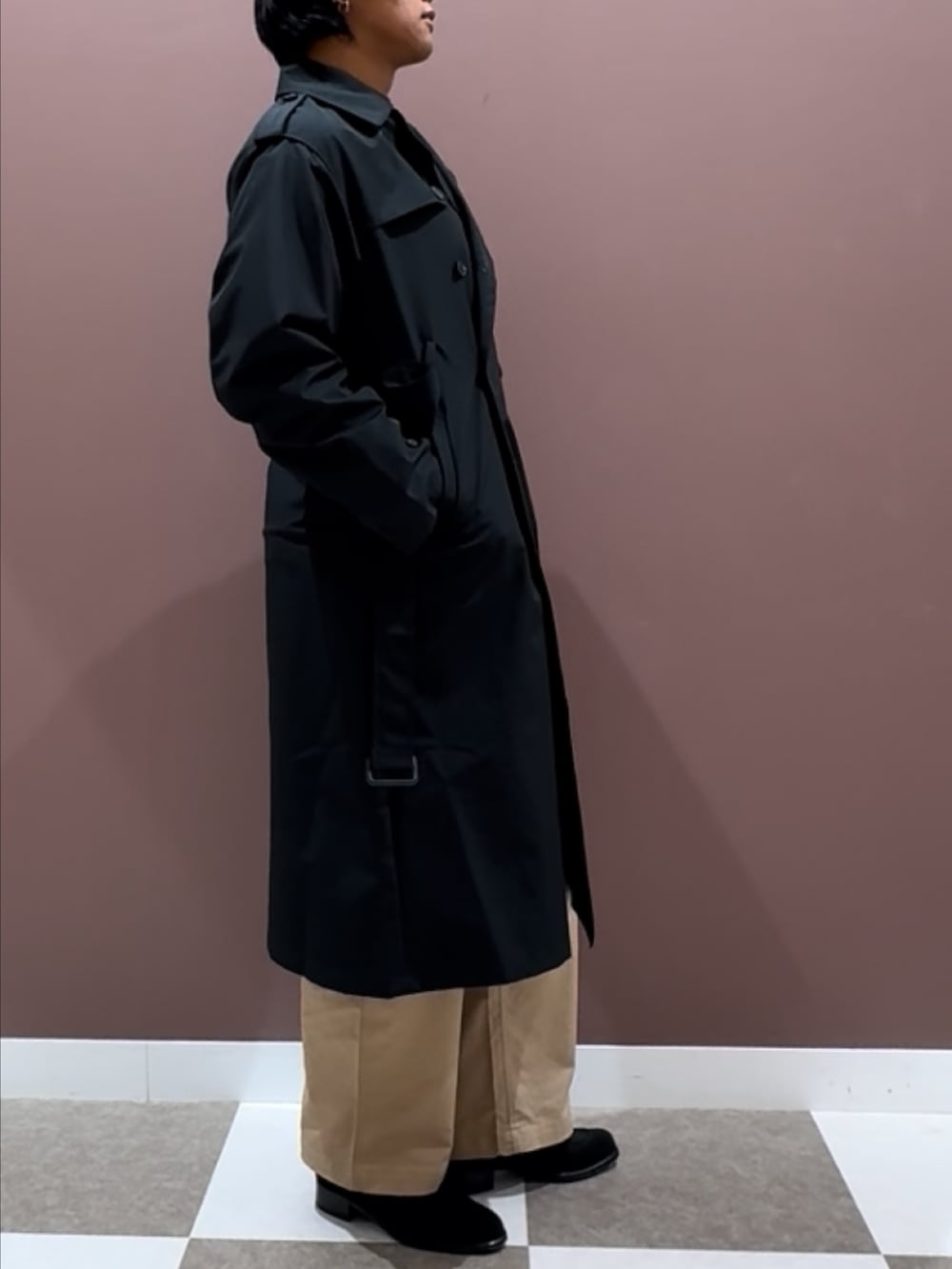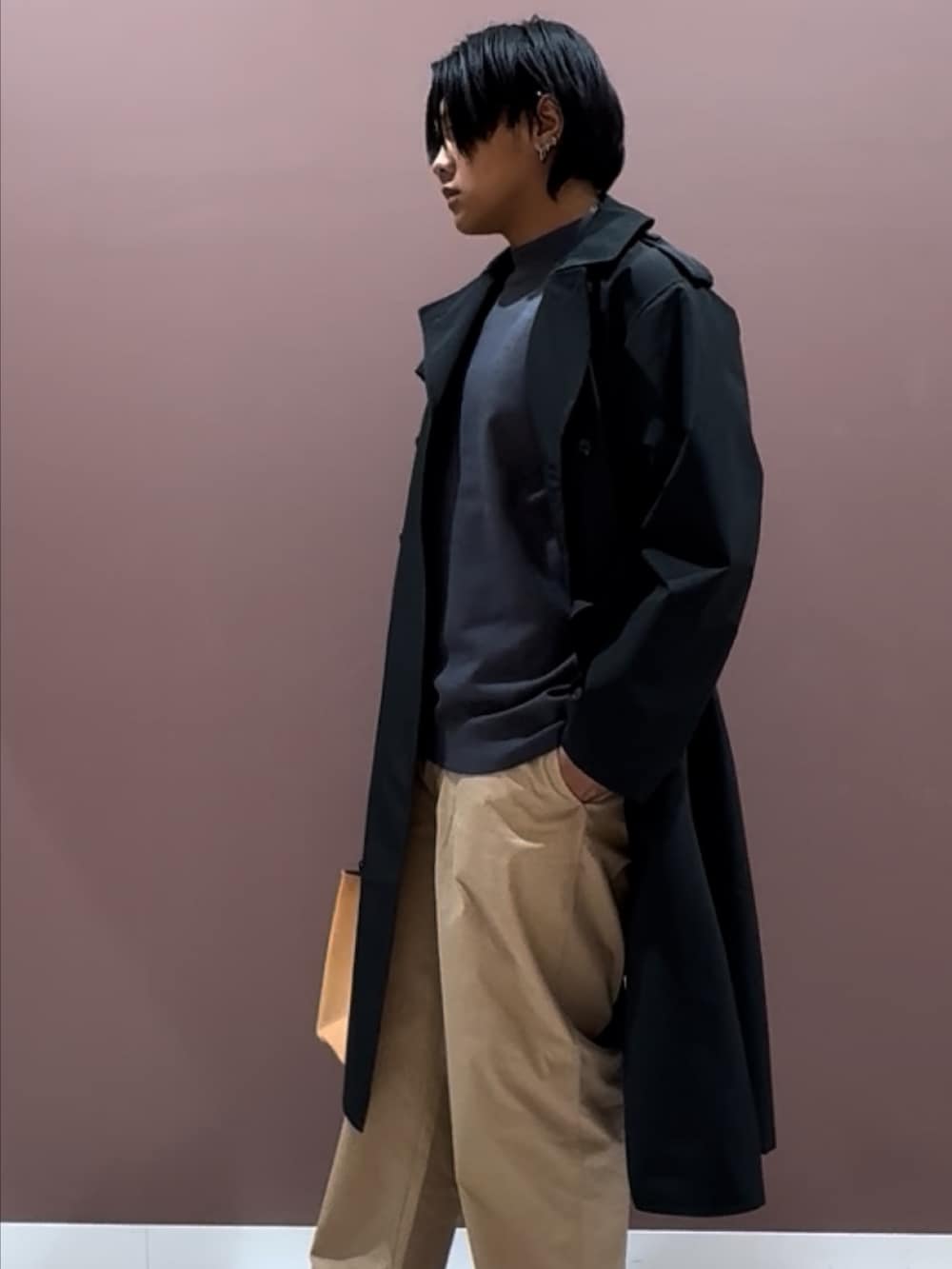 ボトムには柔らかな色味のベージュパンツをセレクト。シンプルなアイテムながら、上品さと抜け感のあるカラーがスタイリング全体をやわらかくまとめてくれます。ブラックのコートとのコントラストも美しく、シーズンを問わず活躍する万能な一本です。