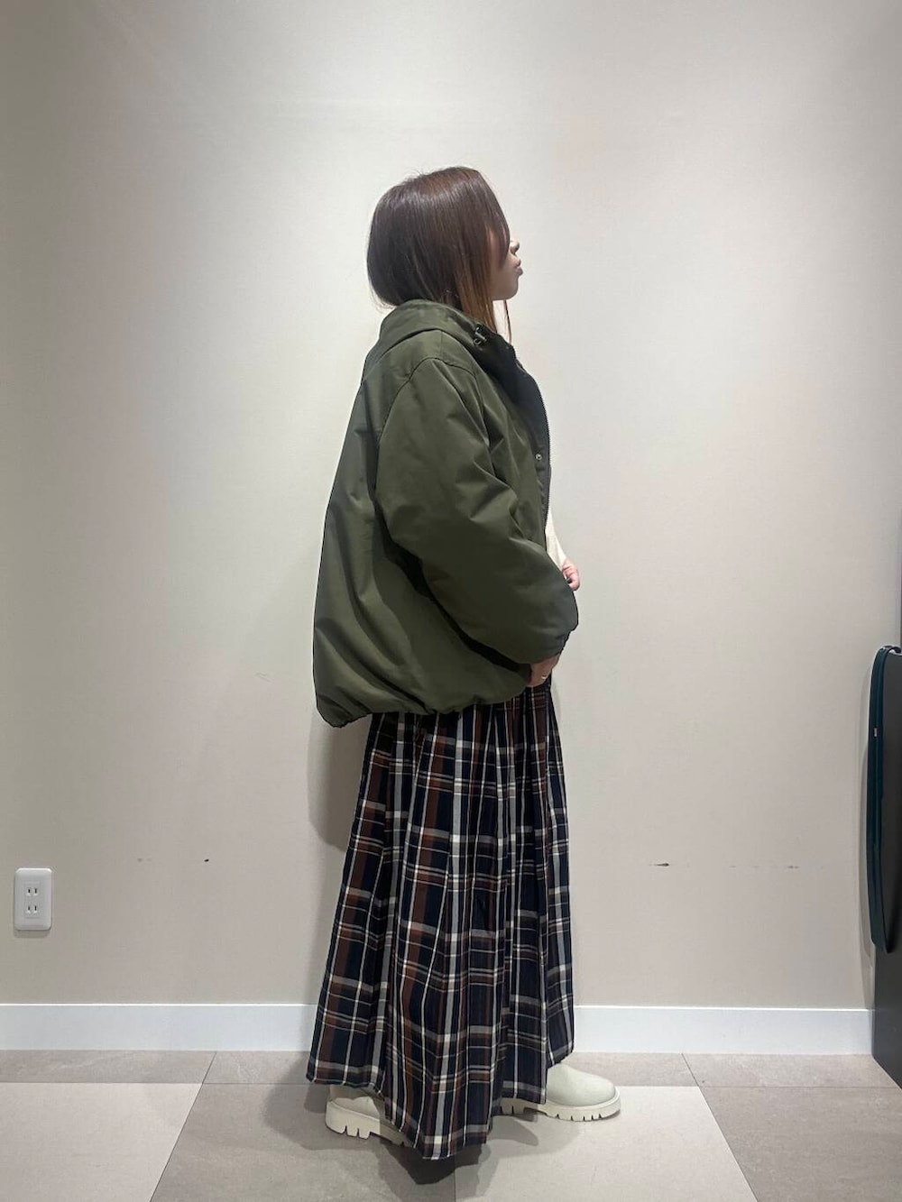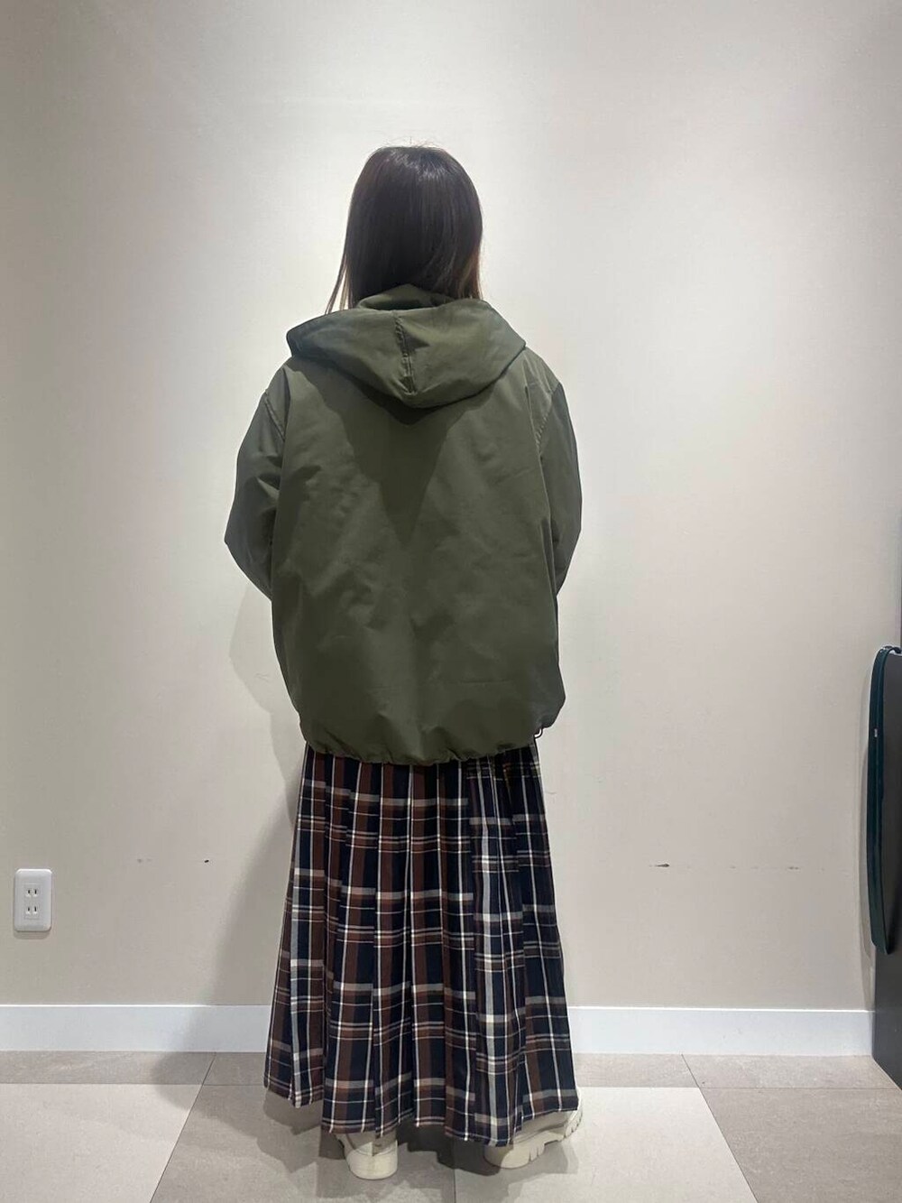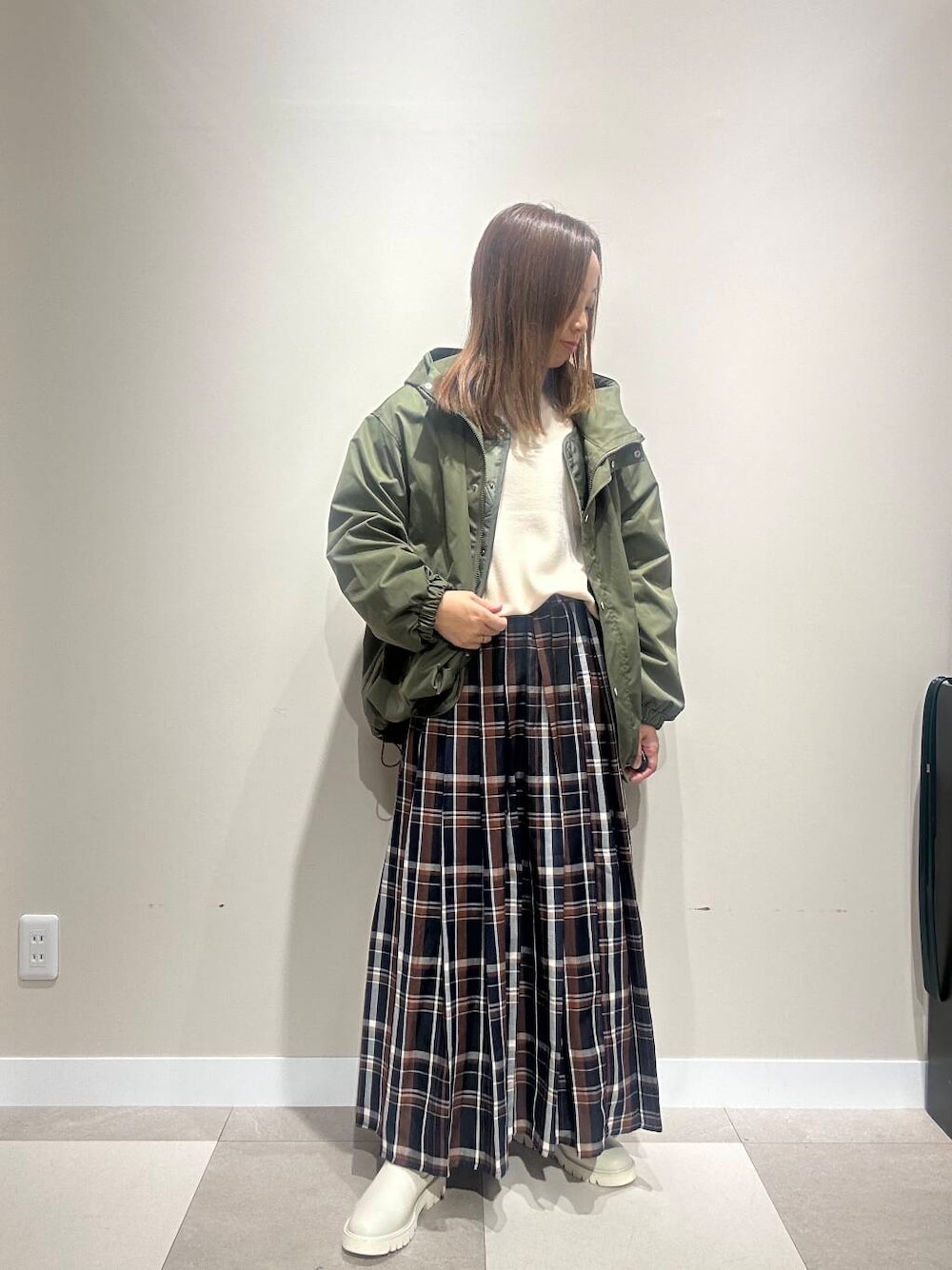 カジュアルなマンパに、甘めなチェックスカートを