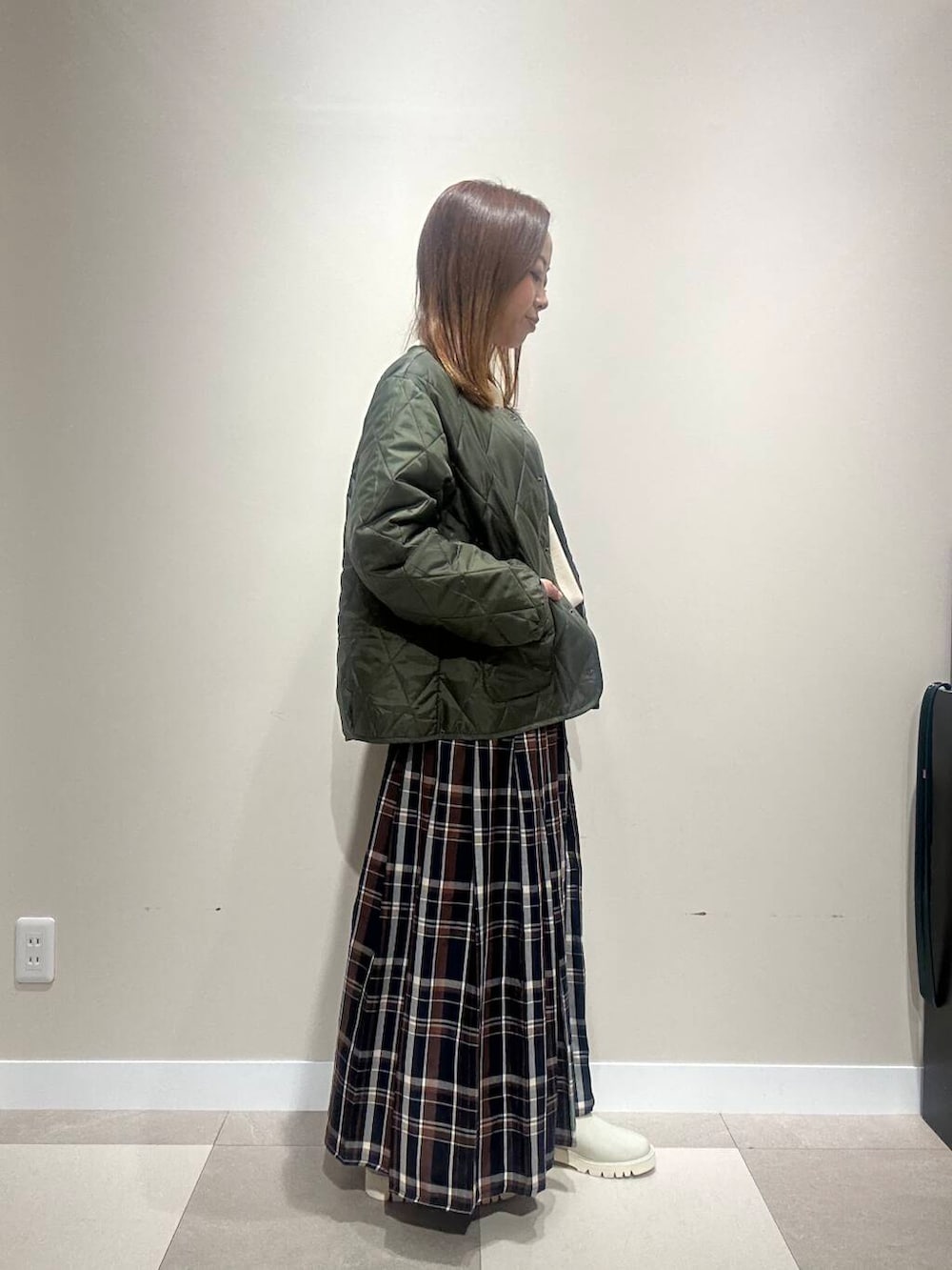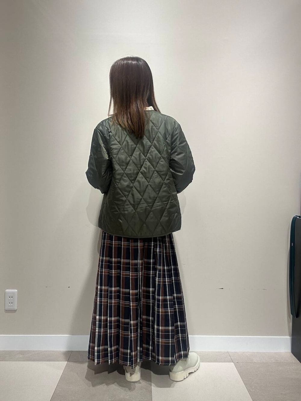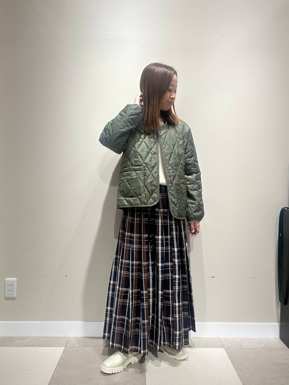 カジュアルなマンパに、甘めなチェックスカートを