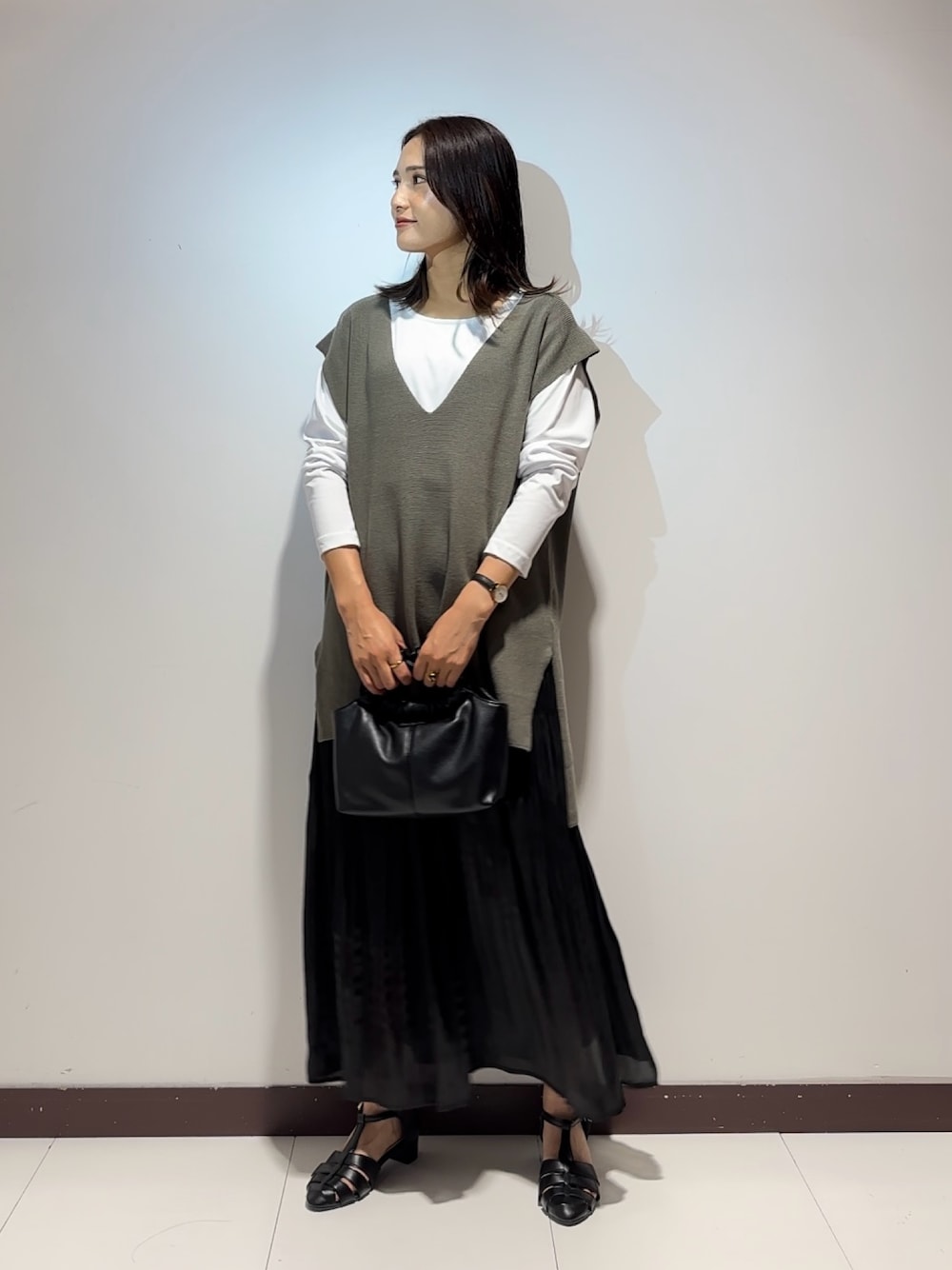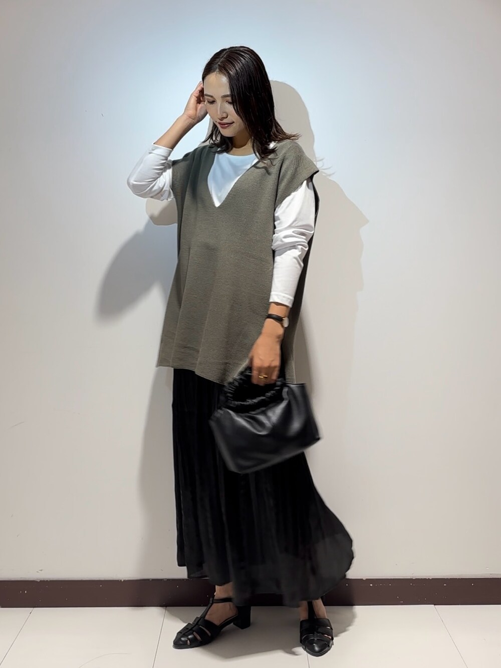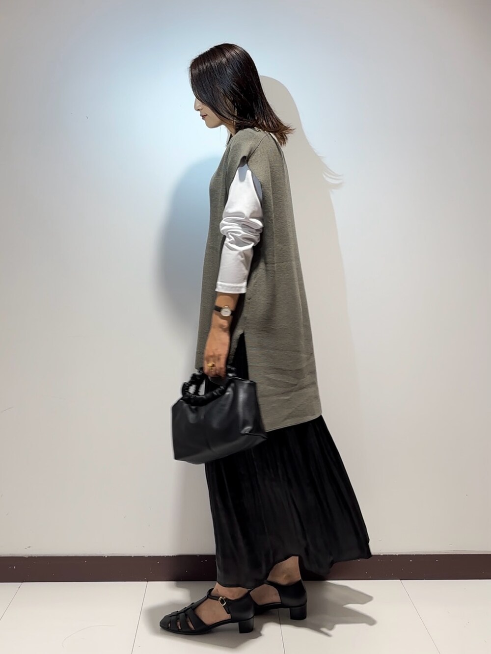 スカートは光沢感と落ち感があるキレイめなスカートです!