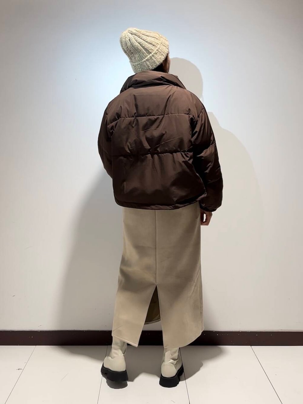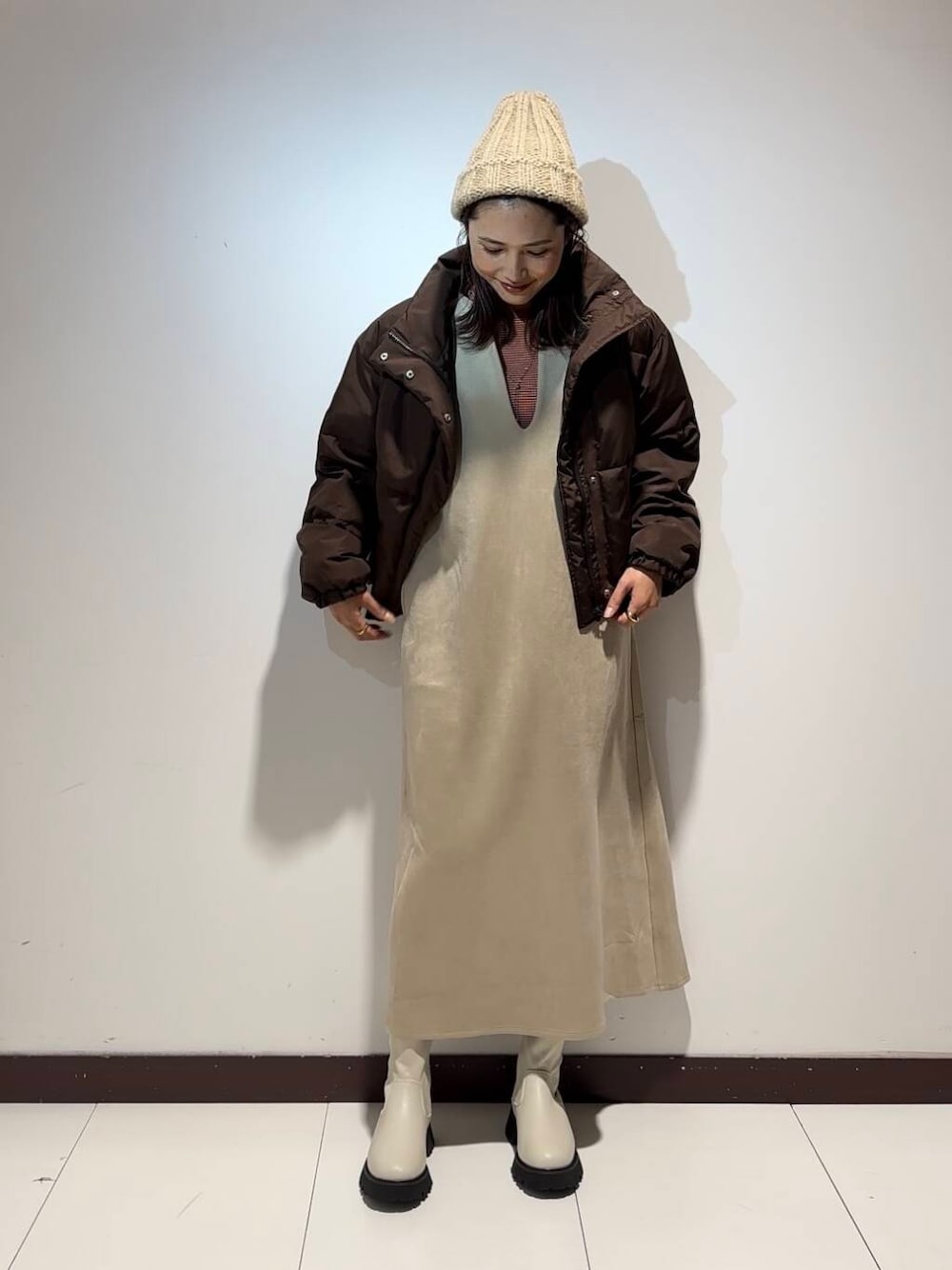 ふんわりと軽い中綿ジャケットは、ショート丈でワンピースとの相性も◎