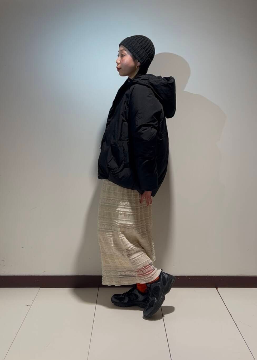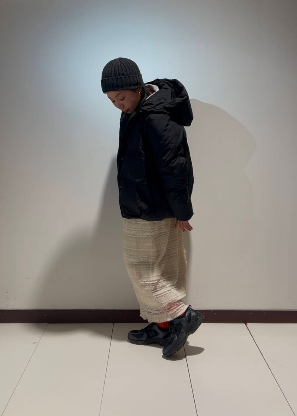 ワンピースが可愛らしいので、ダウンのカラーを黒にしたり、ニット帽やスニーカーなどカジュアルなアイテムをプラスして、甘すぎず・自分らしいコーディネートにしました〜〜♩