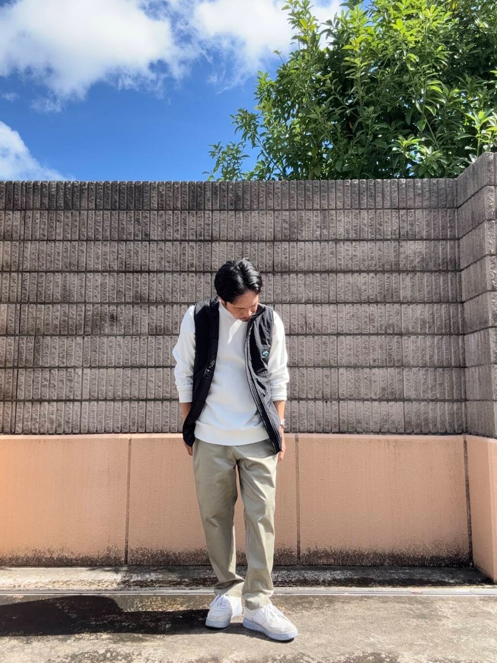 ゆとりがある作りなので少し厚手のスウェット、ニットなどの合わせもおすすめです。