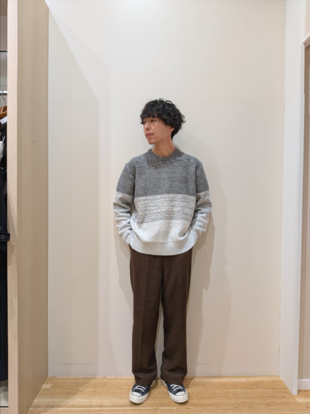 インナーのニットはグラデーションになっておりさりげないお洒落見えが店頭でも人気です。