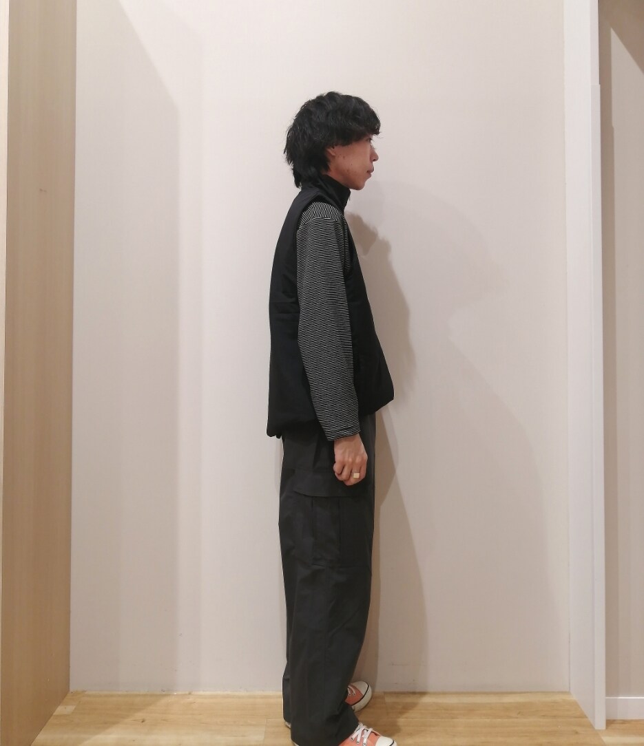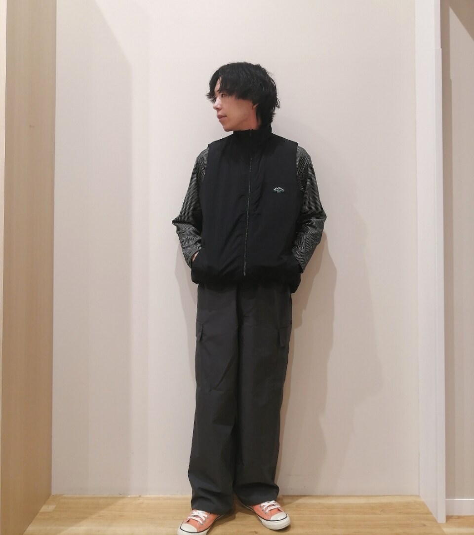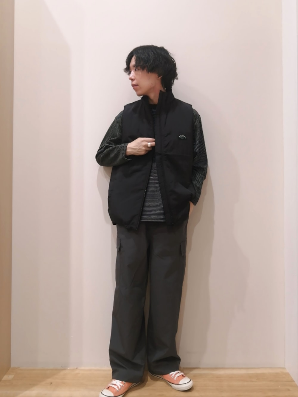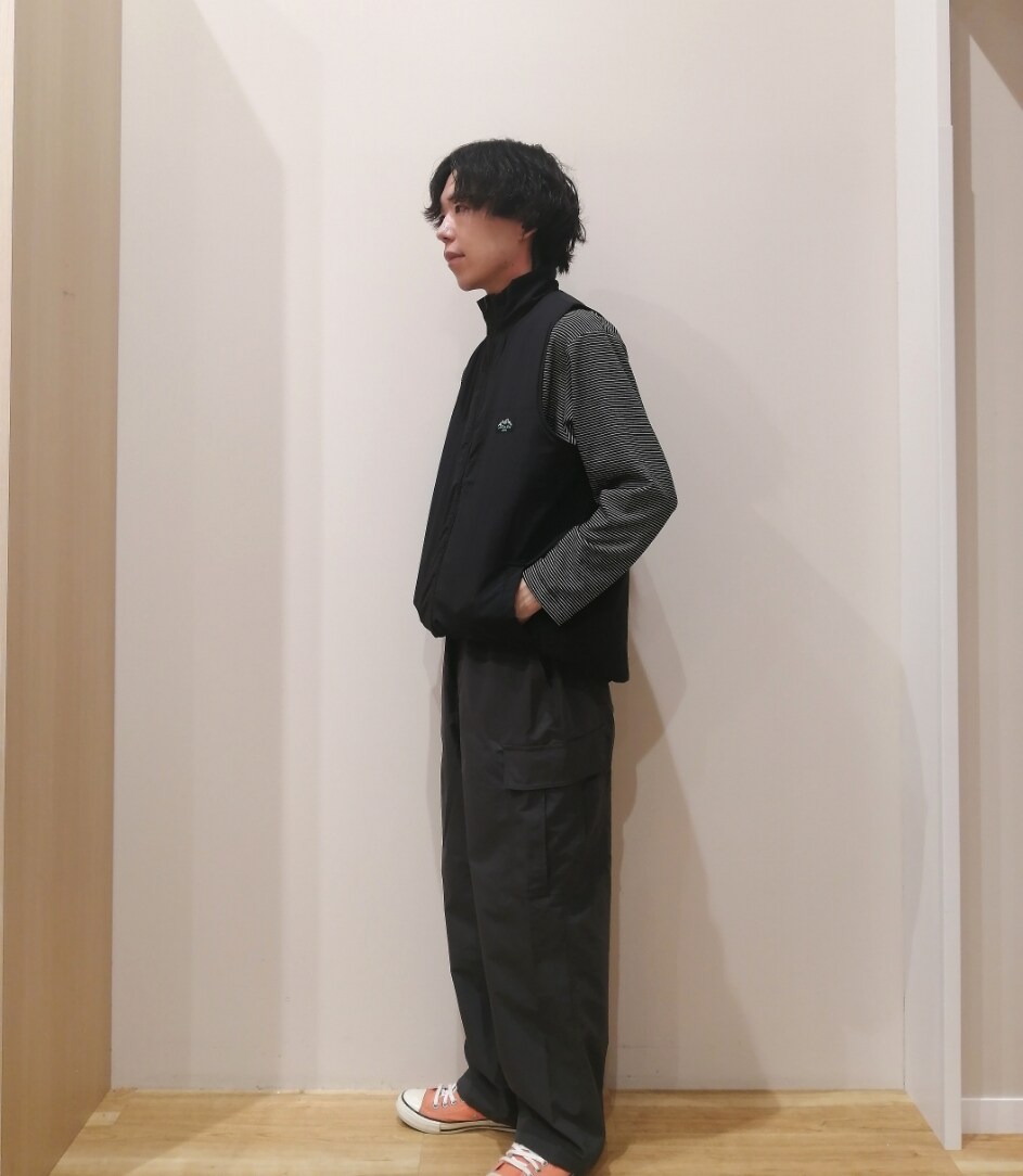 全体的にダークトーンでまとめて、インナーのボーダーTシャツとスニーカーでアクセントを加えました。