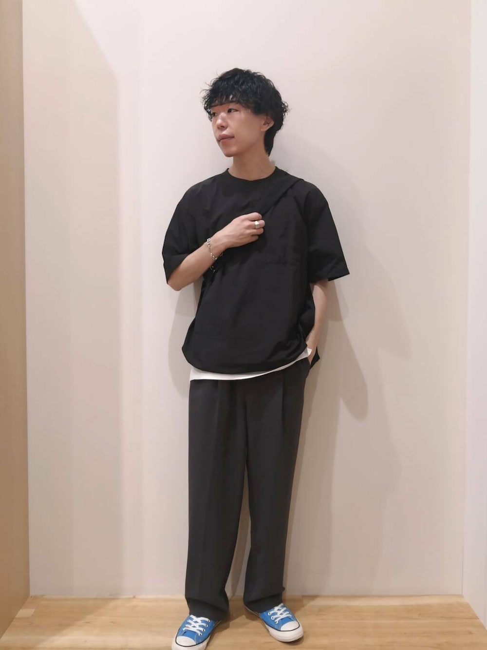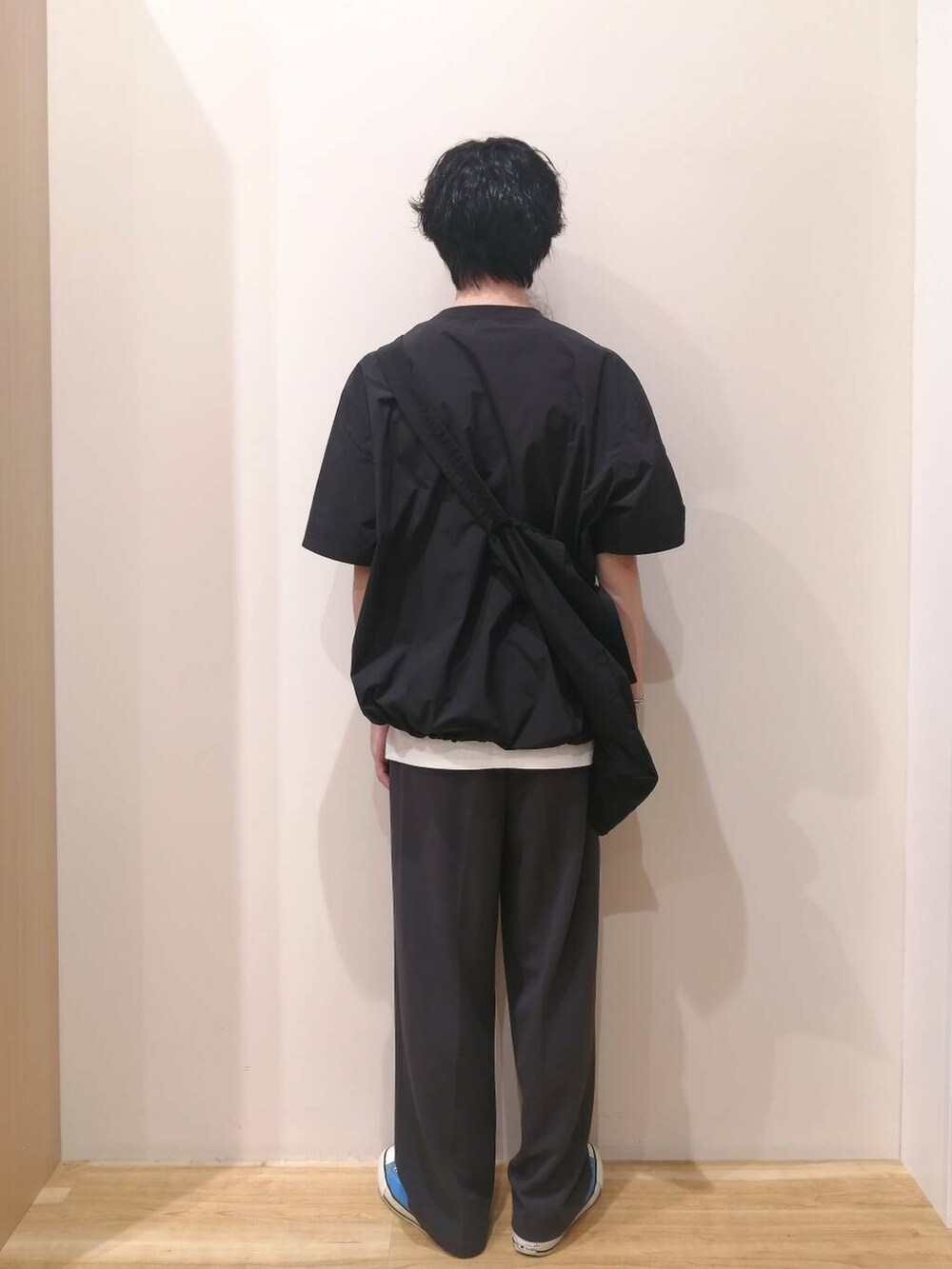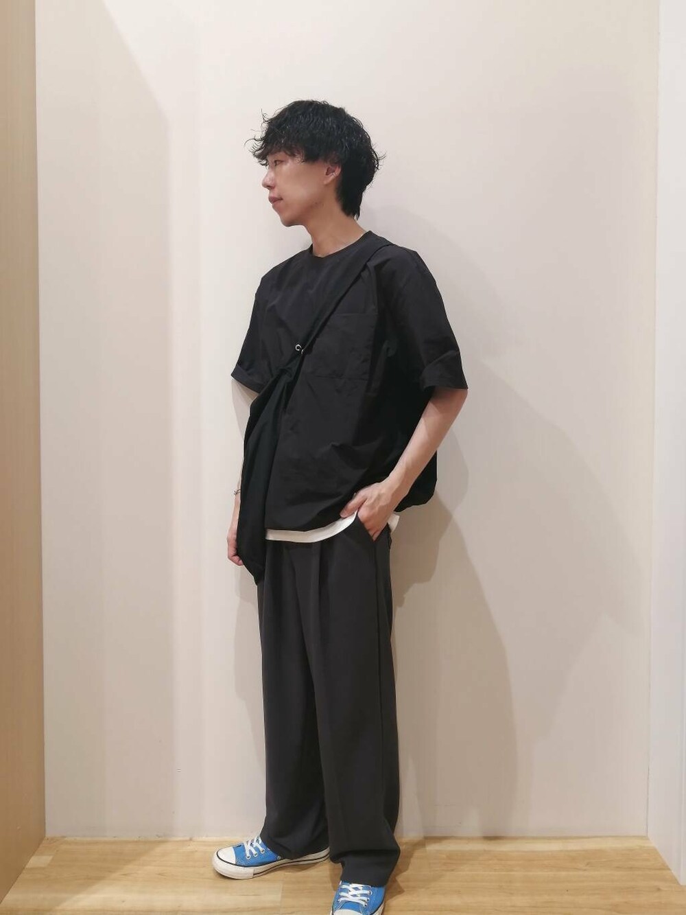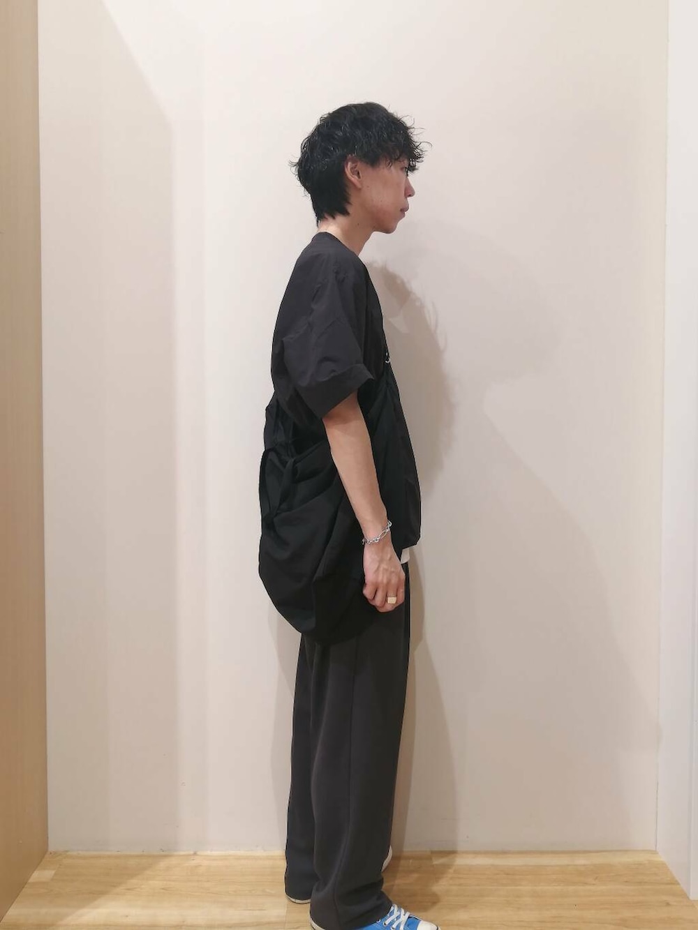 トップスはMサイズ、パンツはLサイズを着用しております。