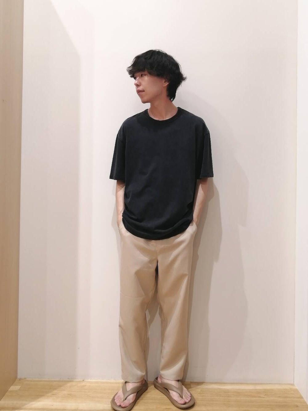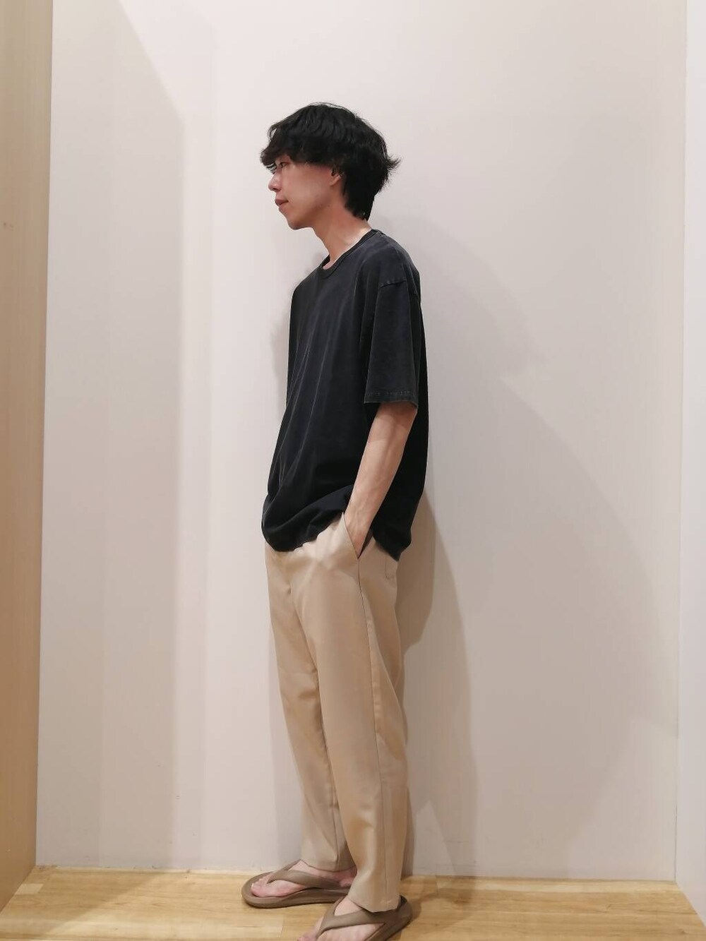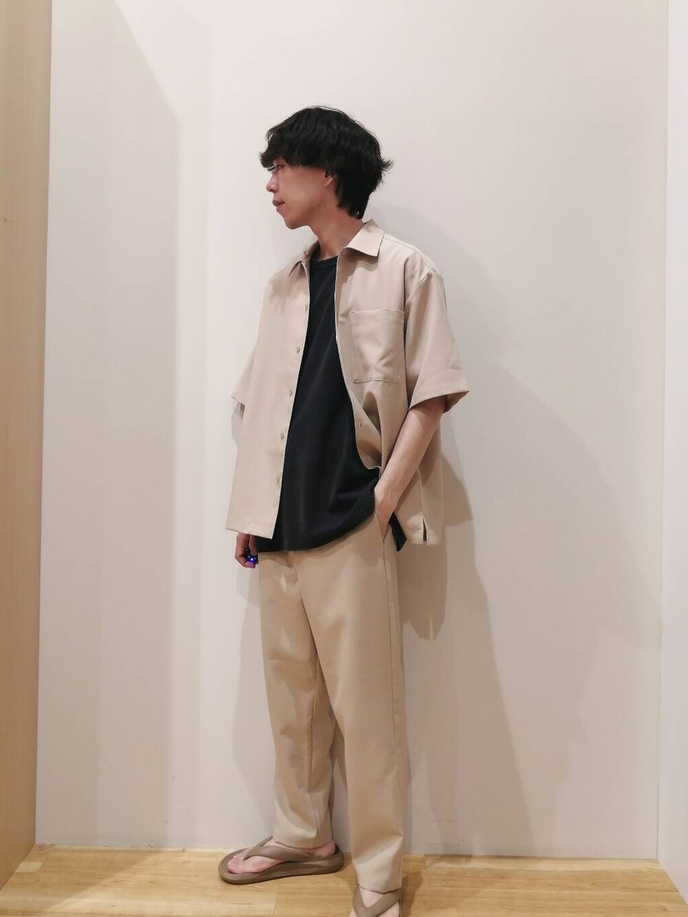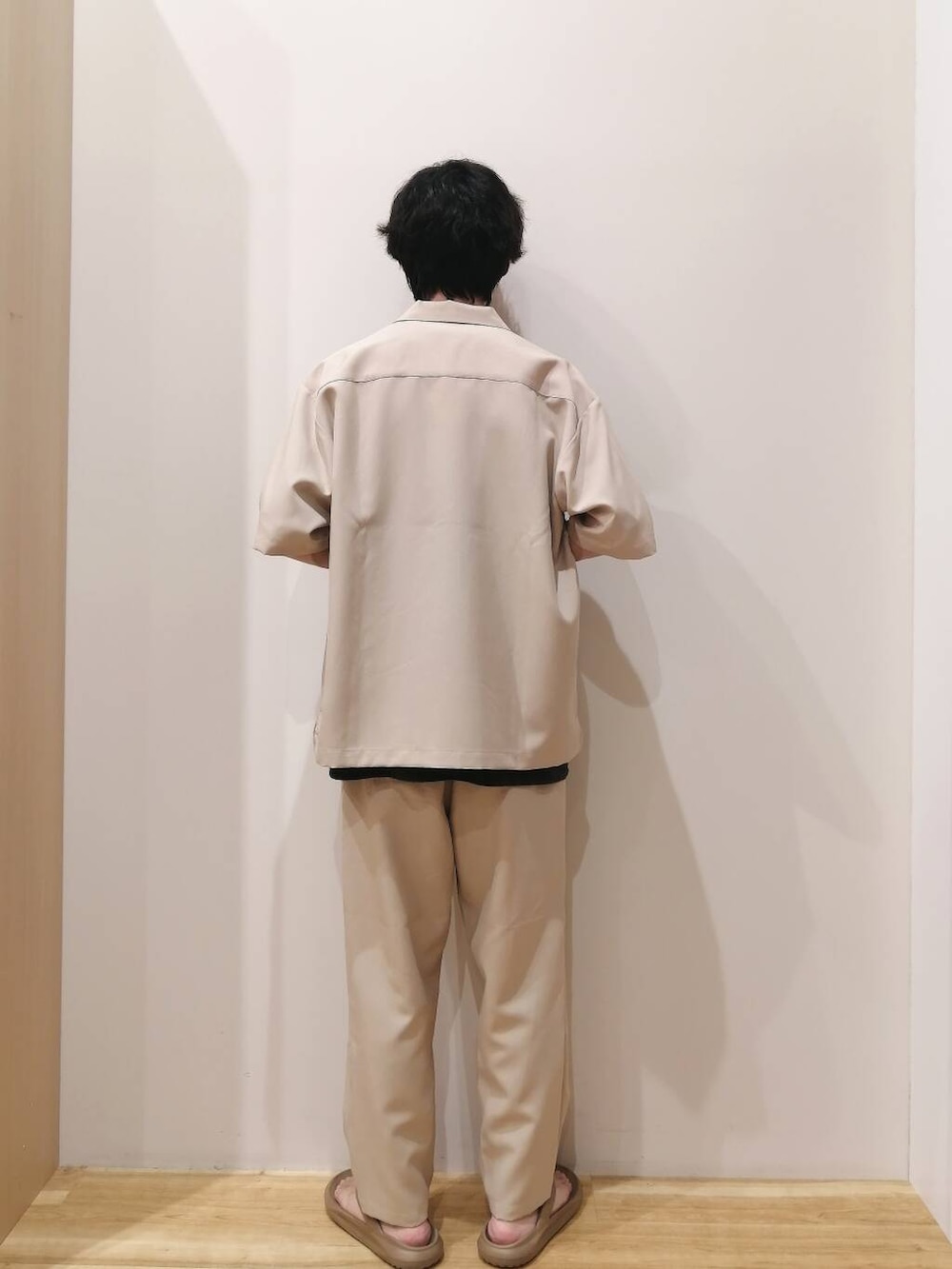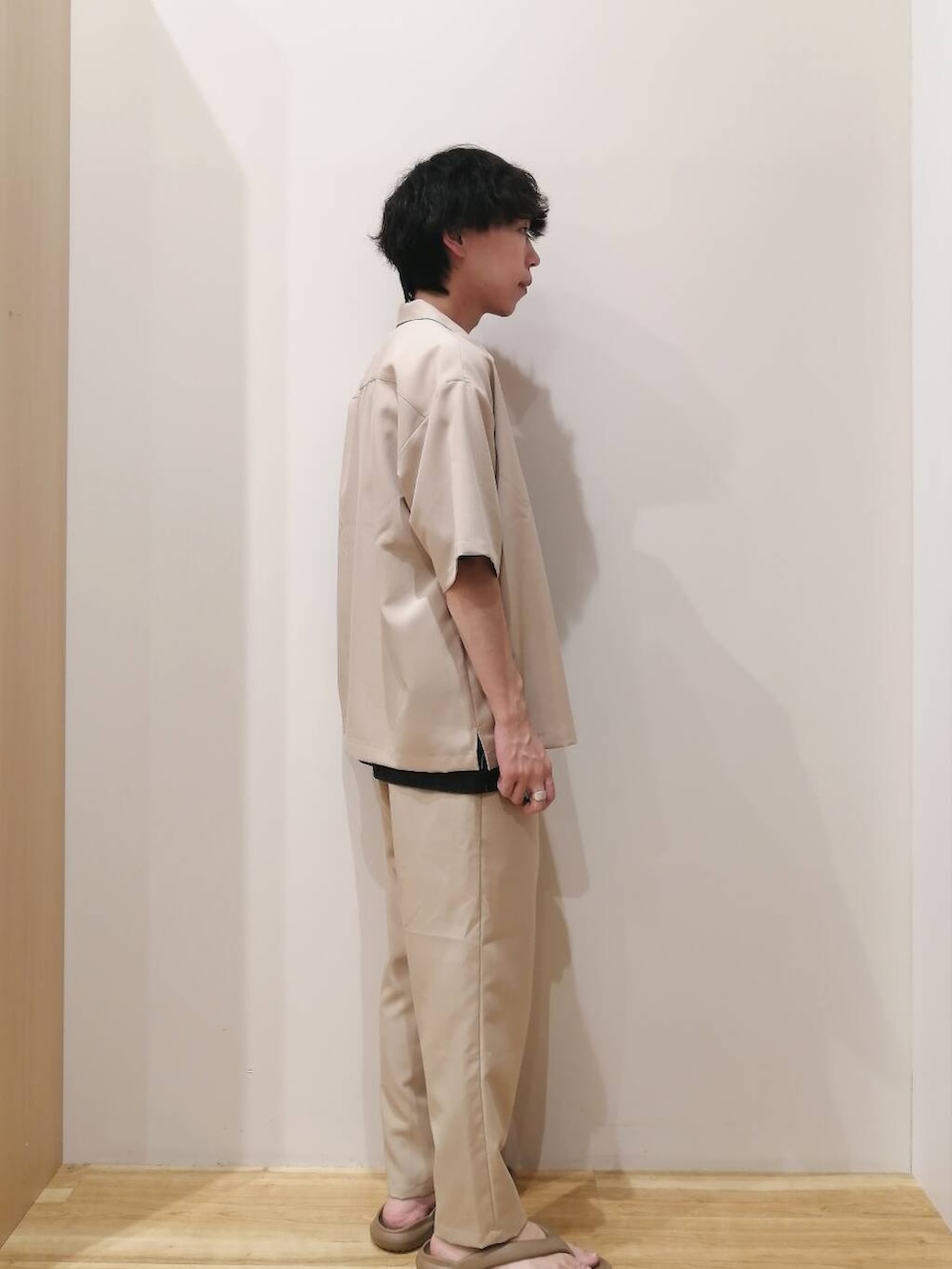 シャツとパンツはLサイズ、TシャツはMサイズを着用しております。
