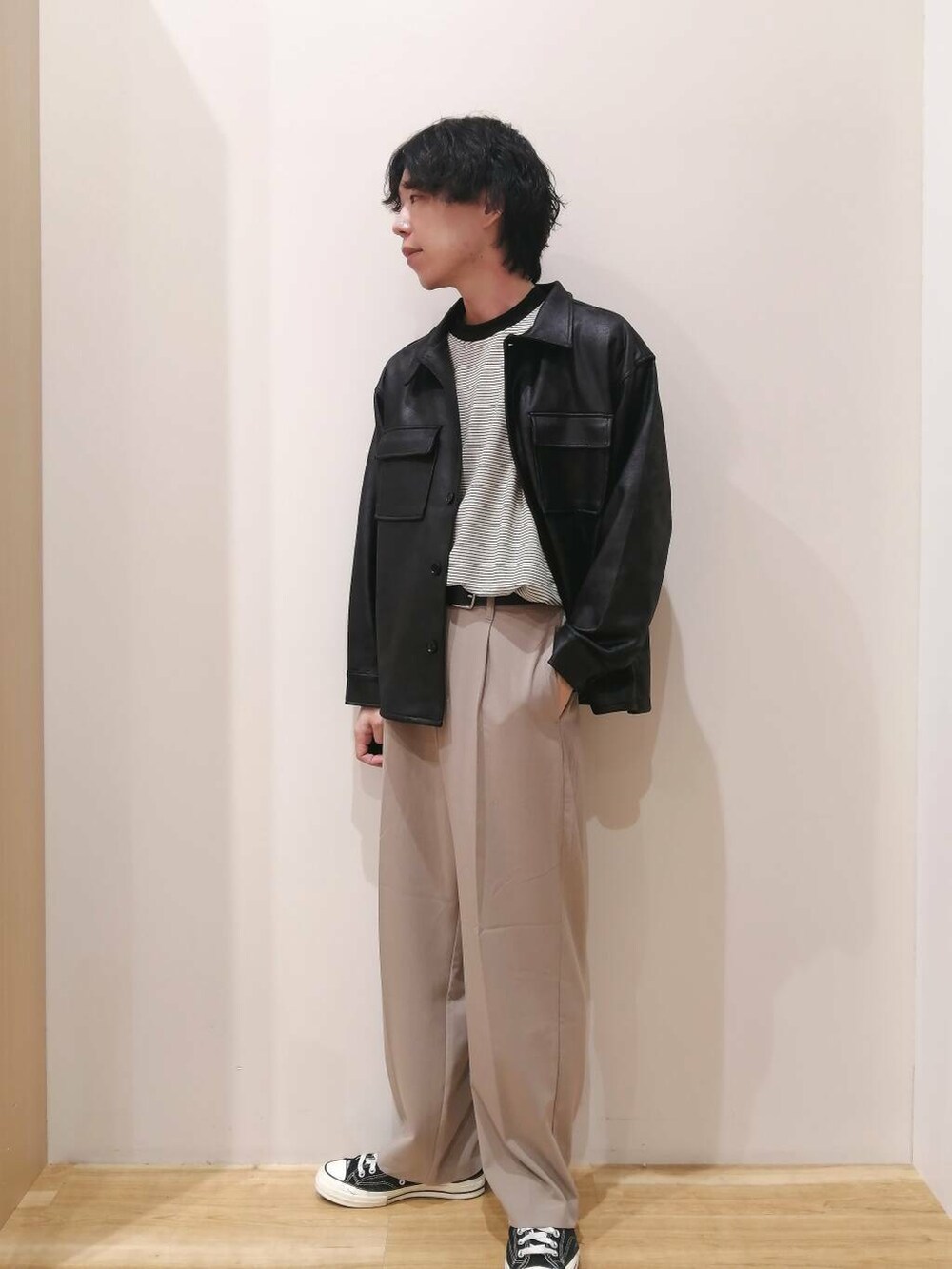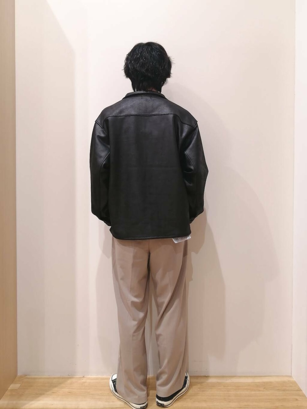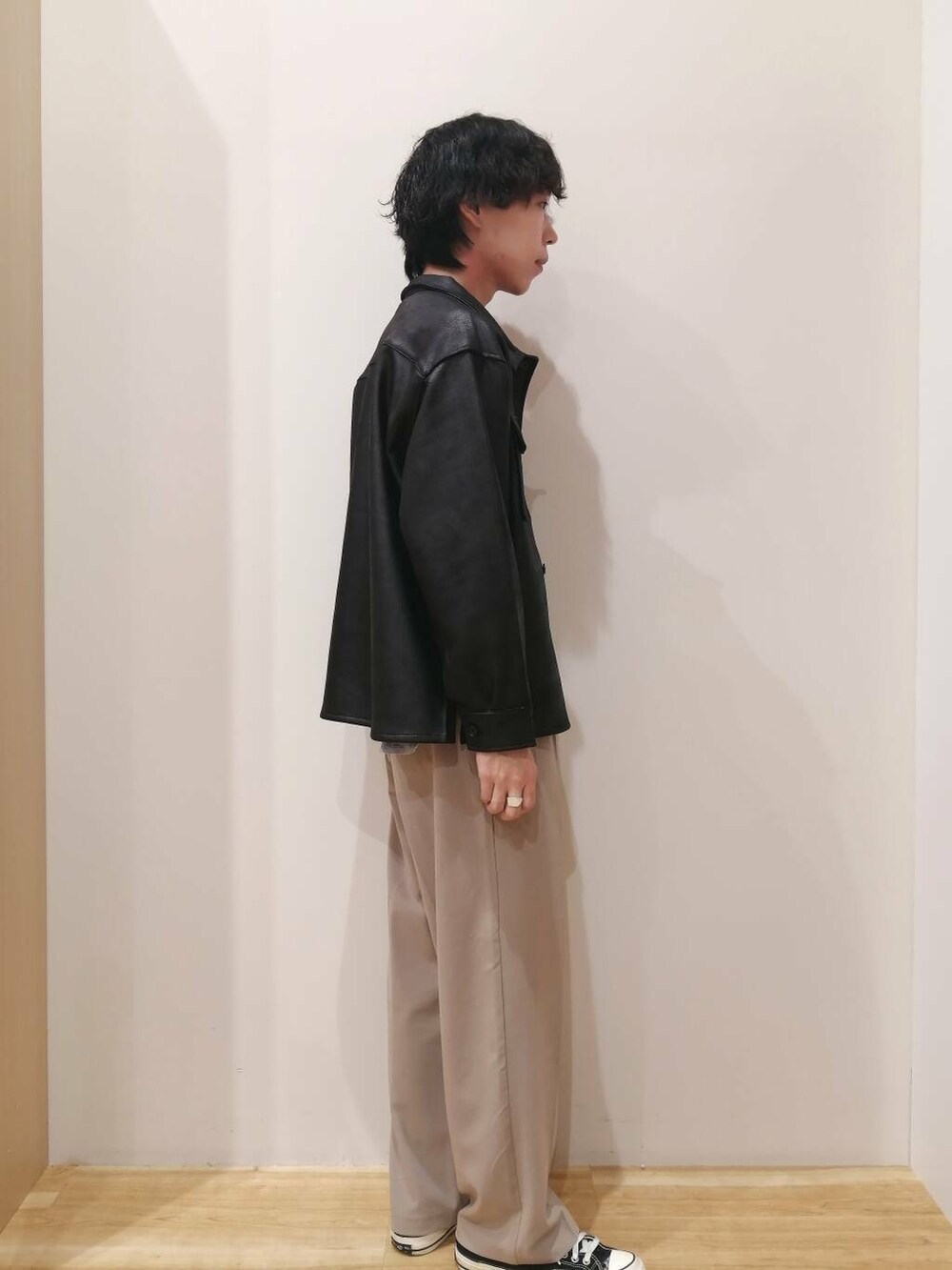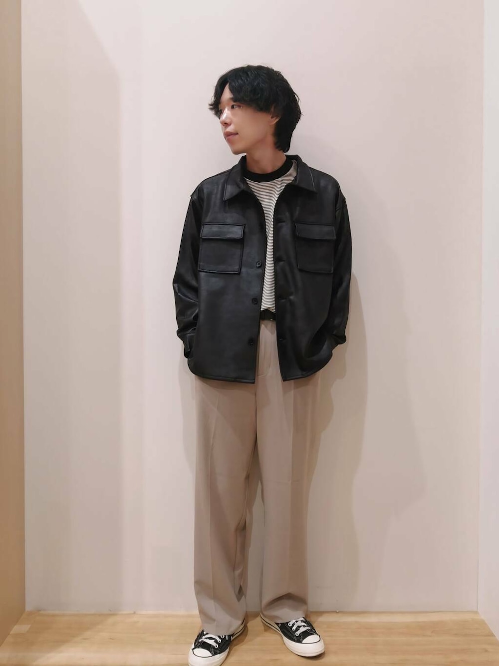 アウターは今季トレンドのレザージャケットになります。