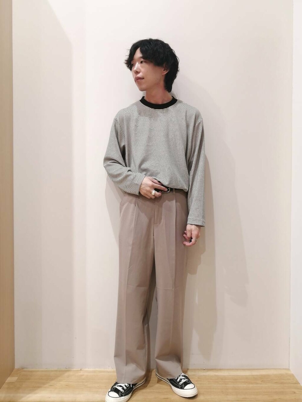 アウターとパンツはMサイズ、TシャツはLサイズを着用しております。