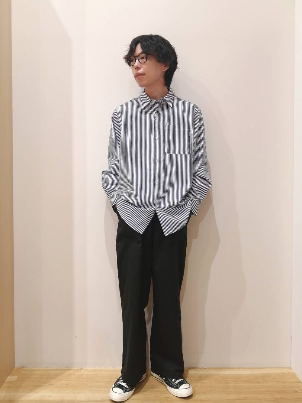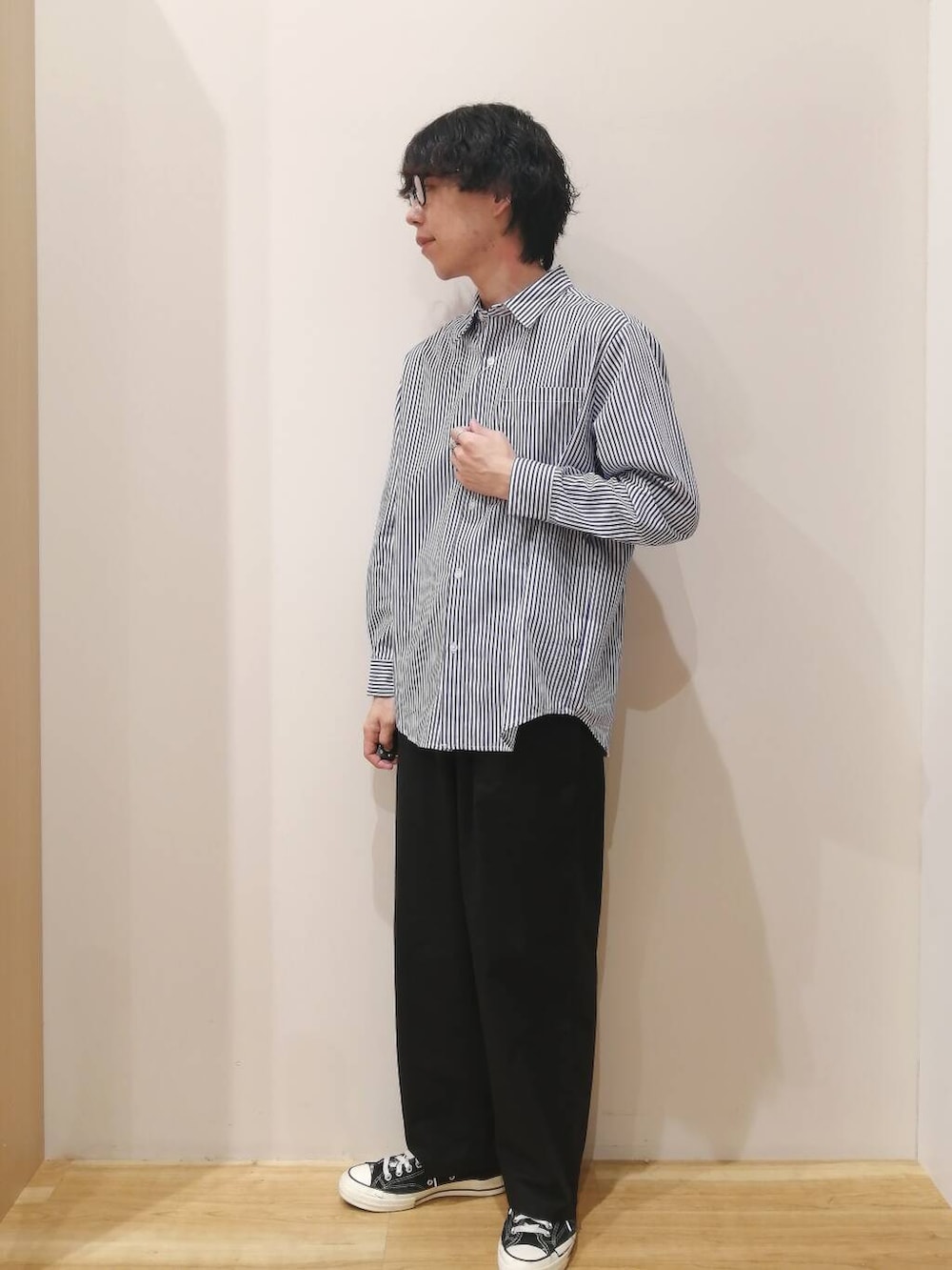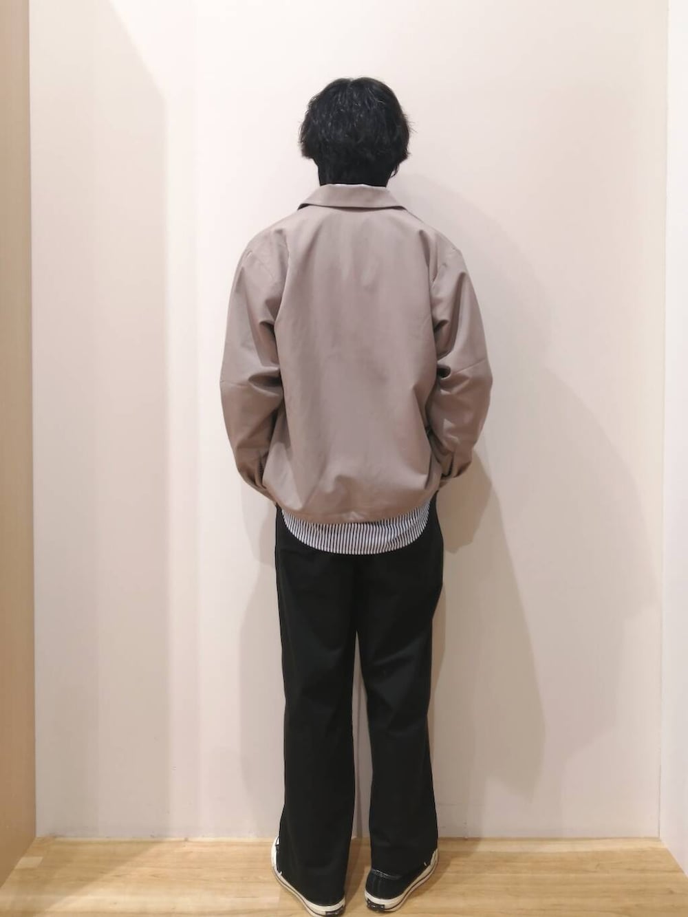 ジャケットとシャツはMサイズ、パンツはLサイズを着用しております。