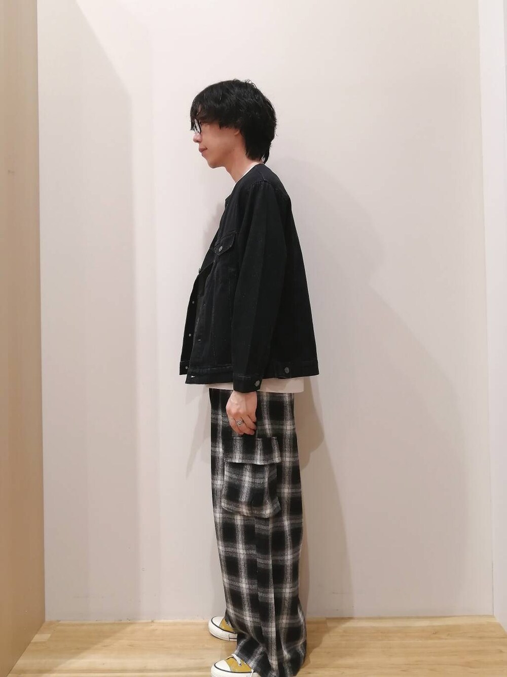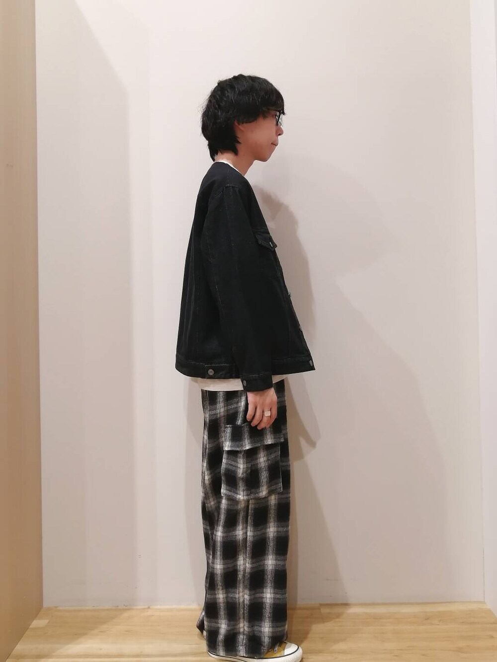 着丈短め、身幅広めのシルエットなのでスウェットやニットなど厚い生地のアイテムとも相性良いです。