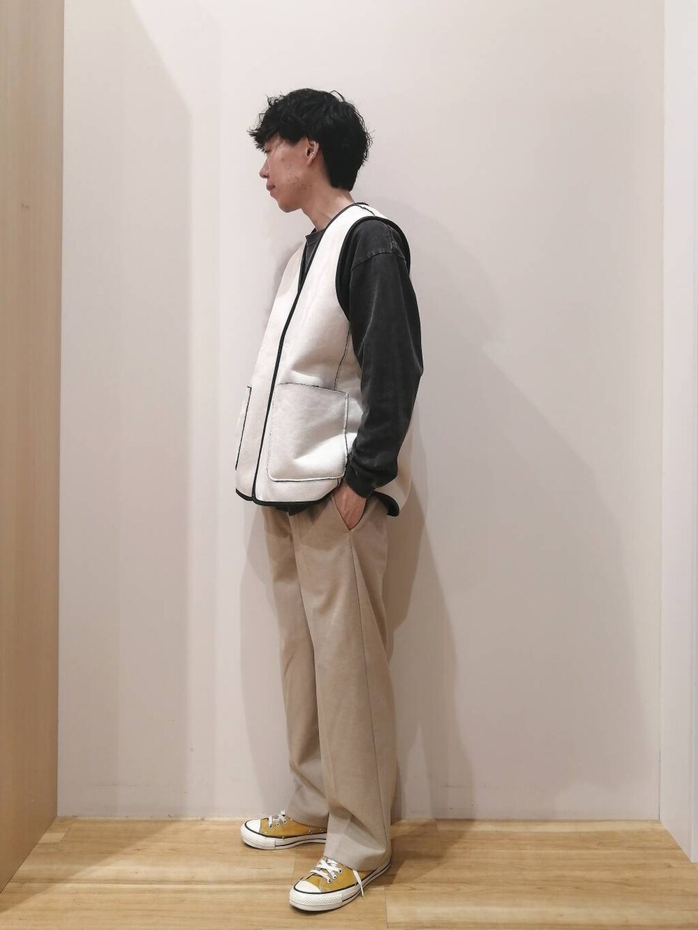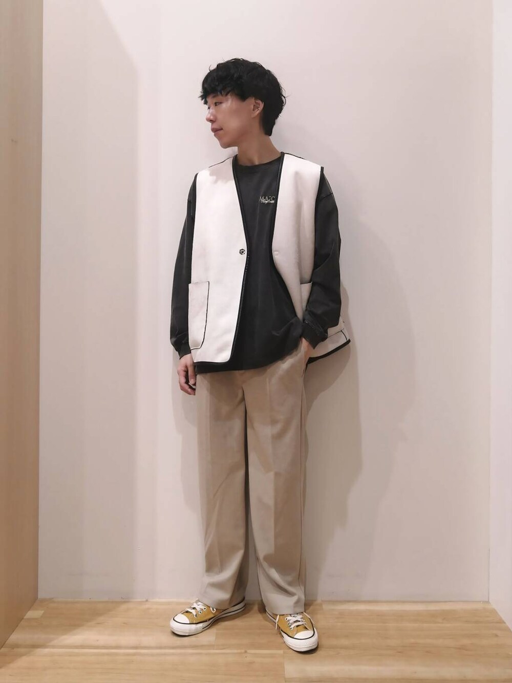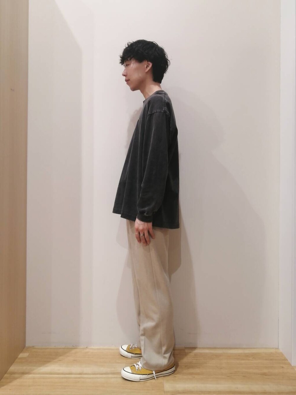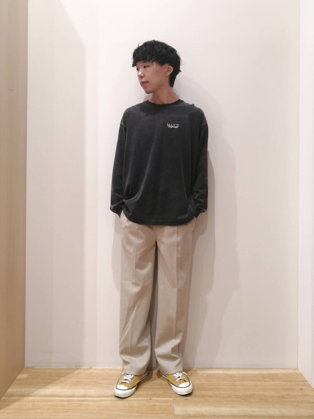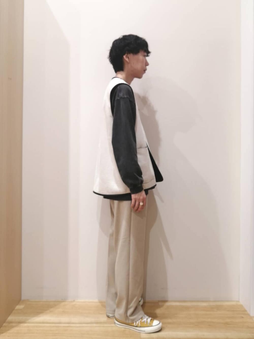 アウターとパンツはMサイズ、TシャツはLサイズを着用しております。