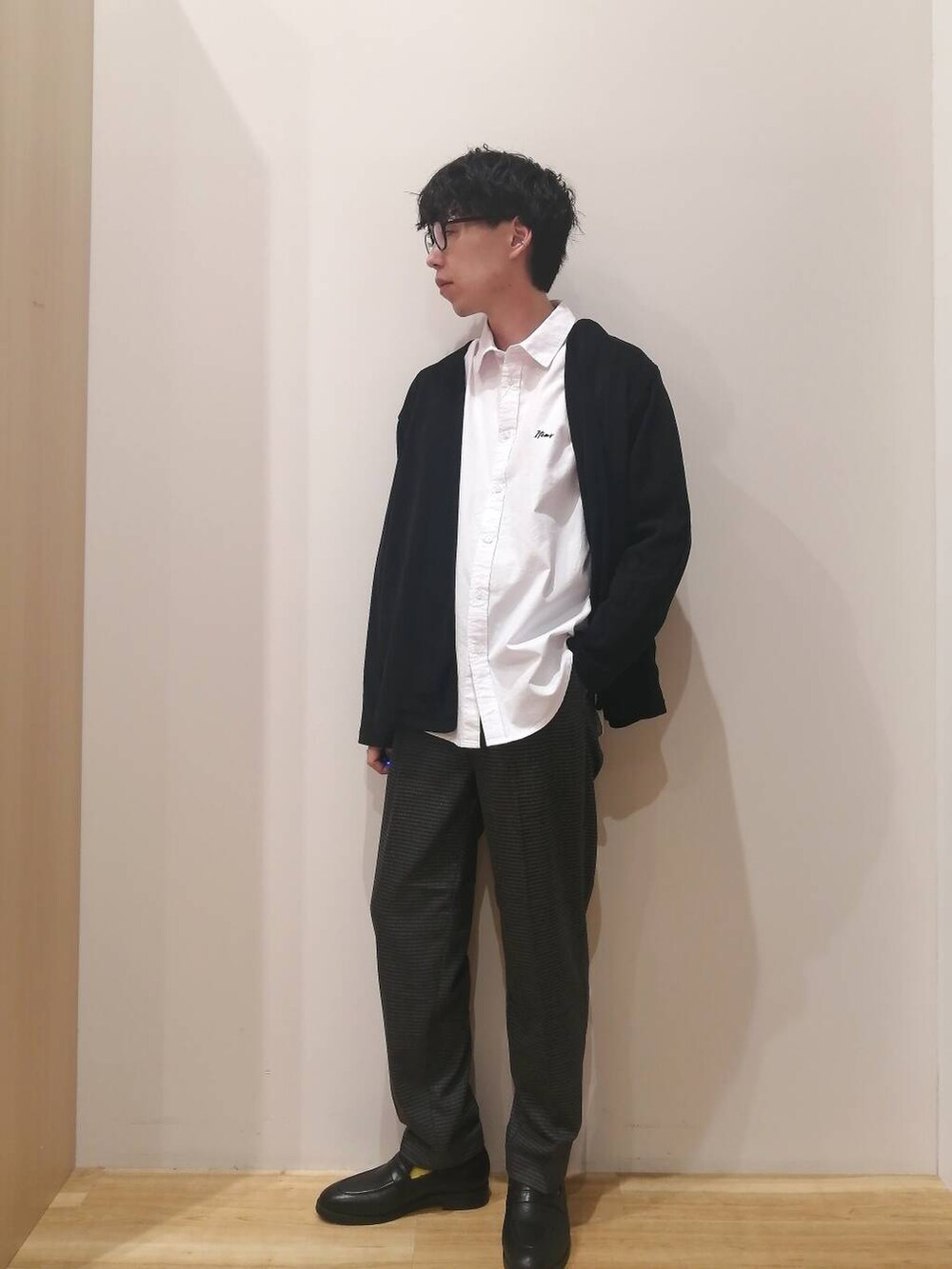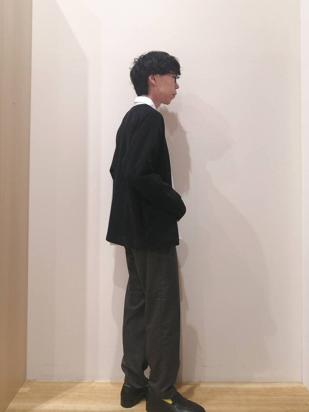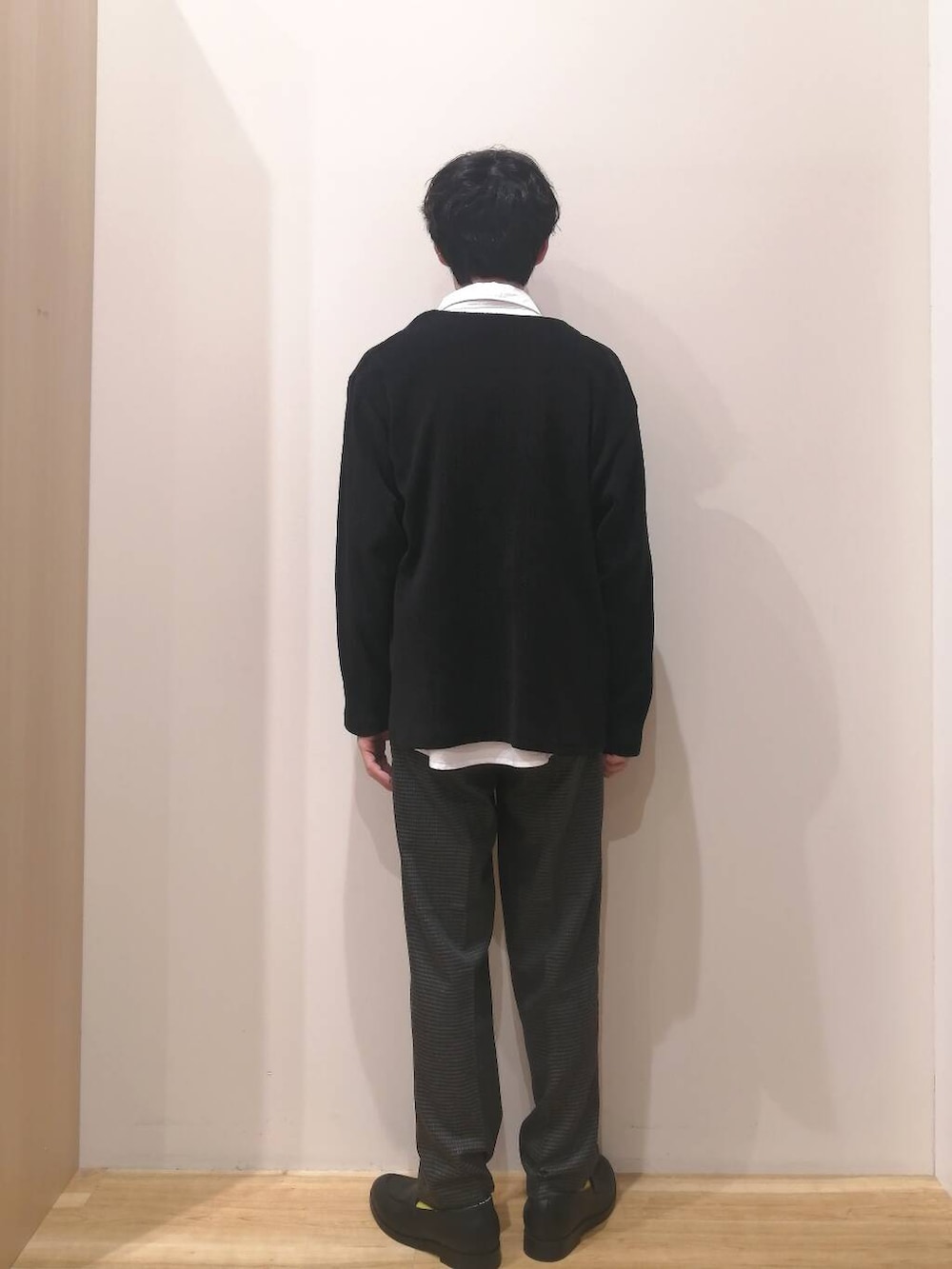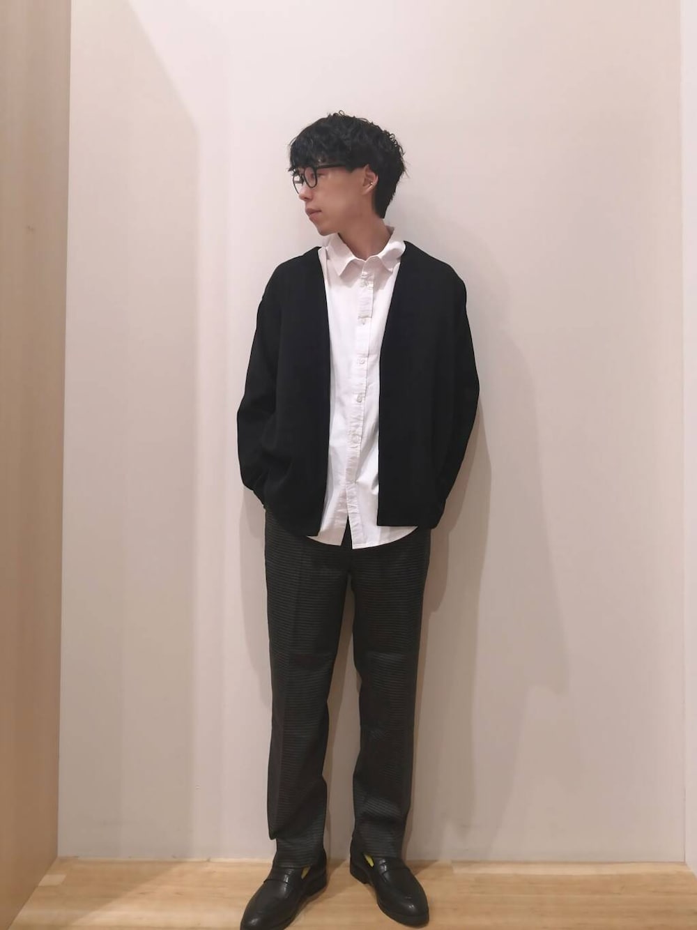 カーディガン、シャツ、パンツすべてMサイズを着用しております。