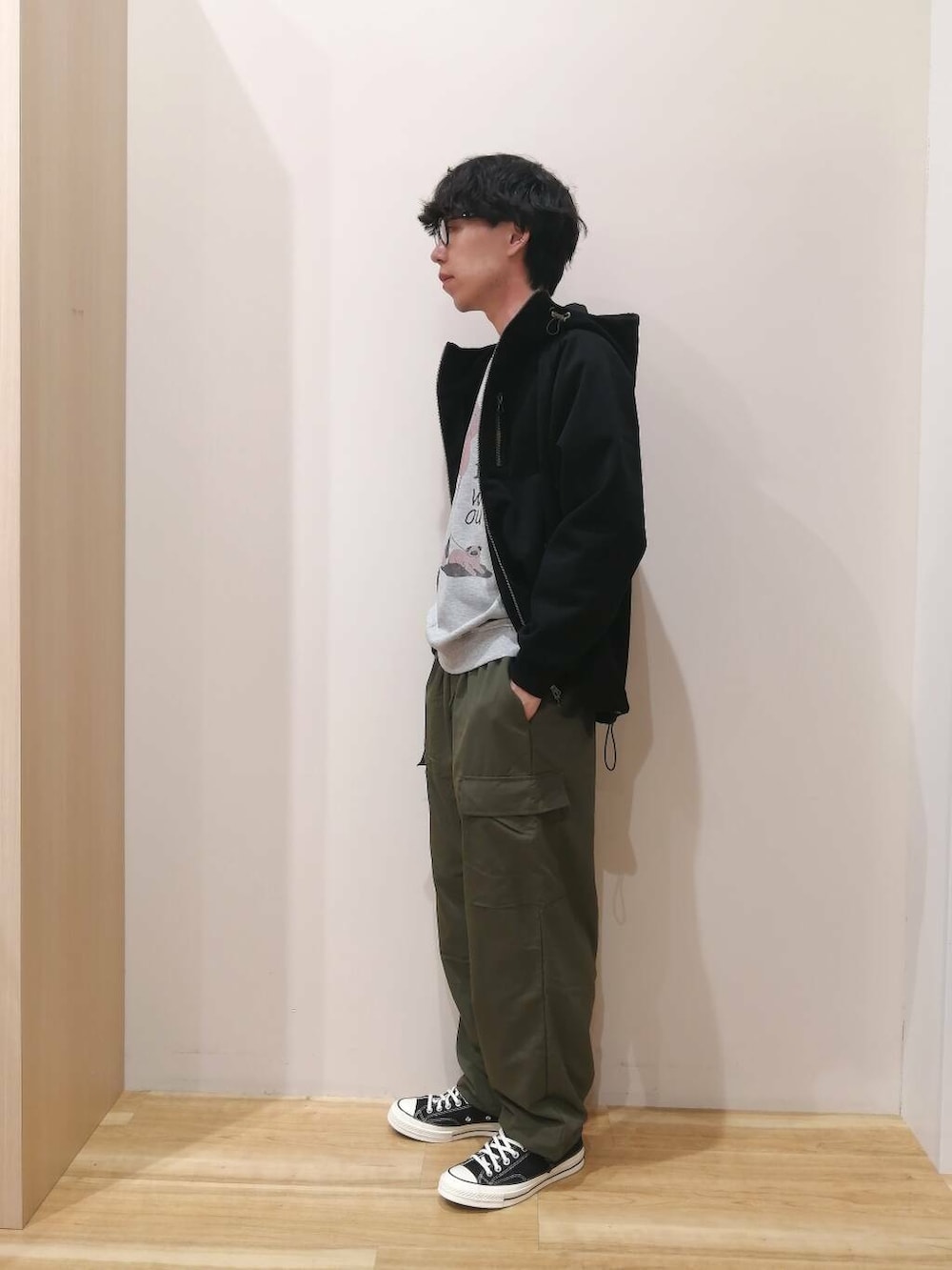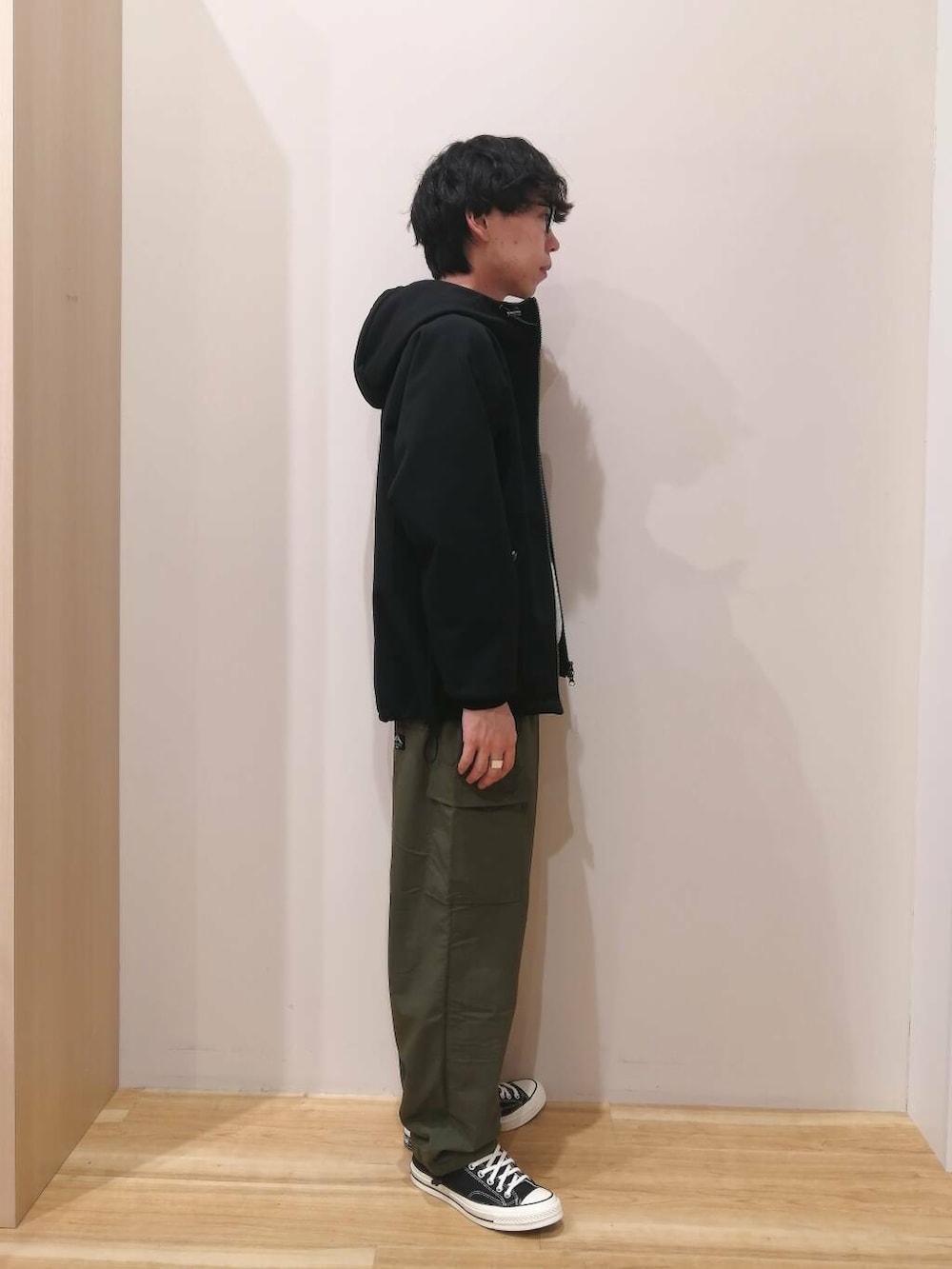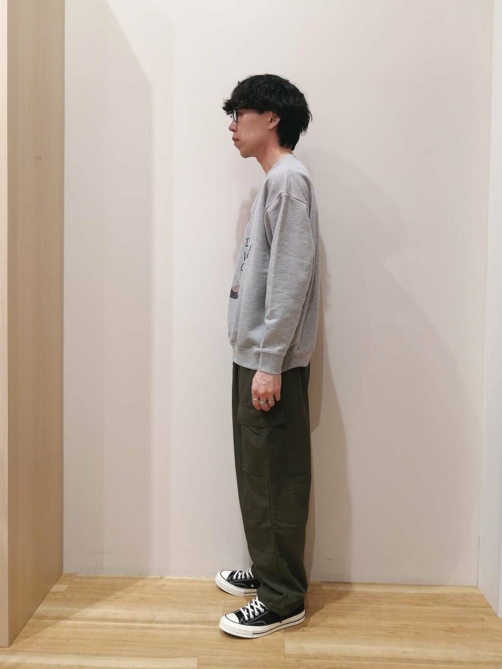 アウター、スウェットはMサイズ、パンツはLサイズを着用しております。