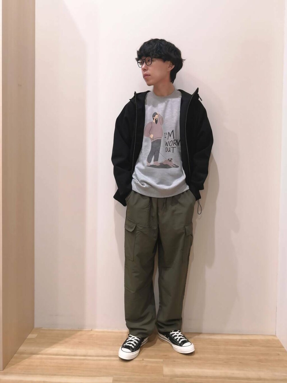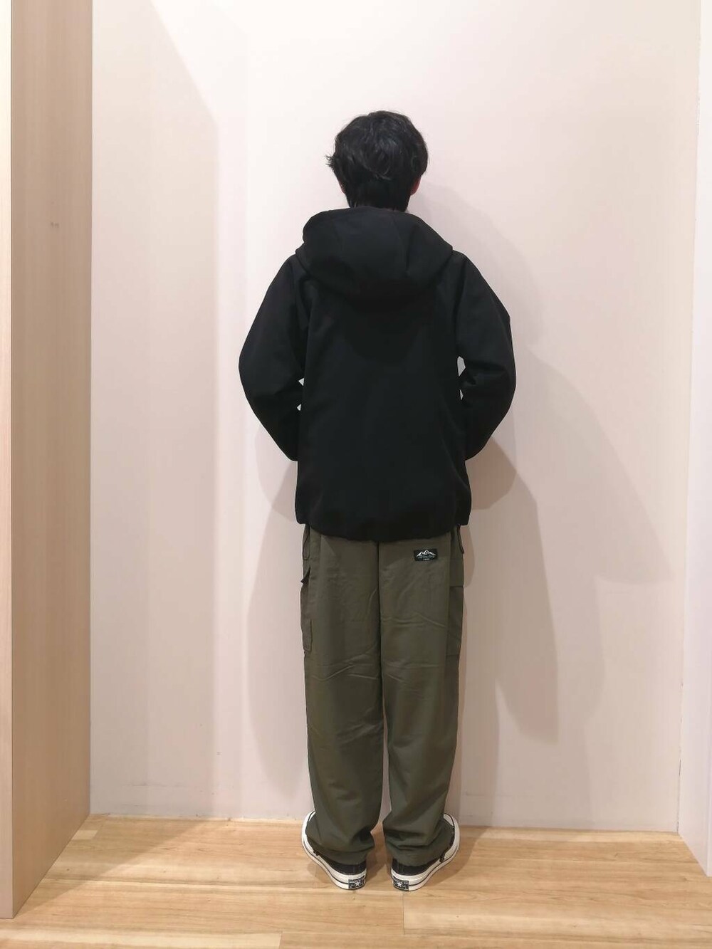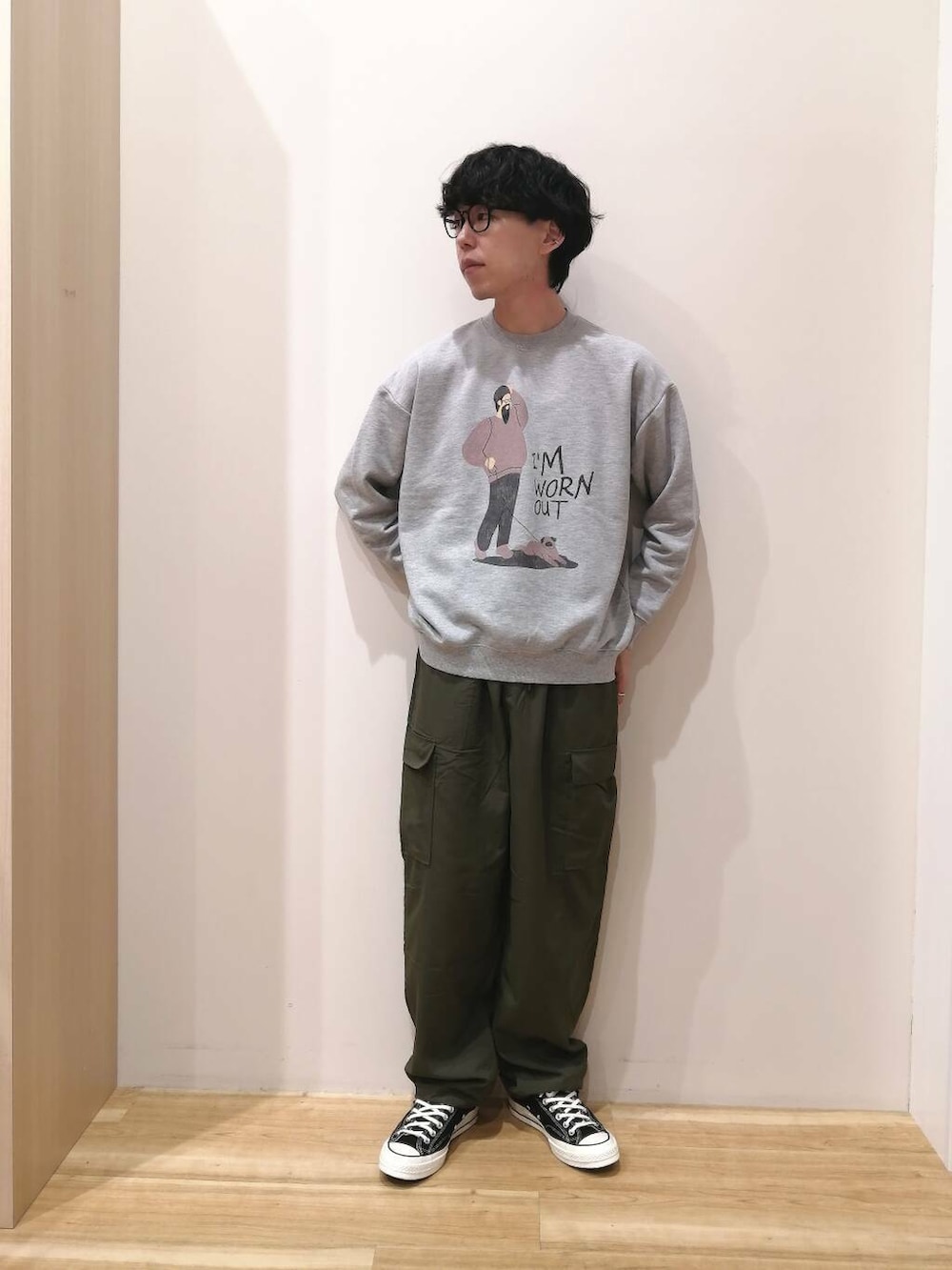 アウター、スウェットはMサイズ、パンツはLサイズを着用しております。