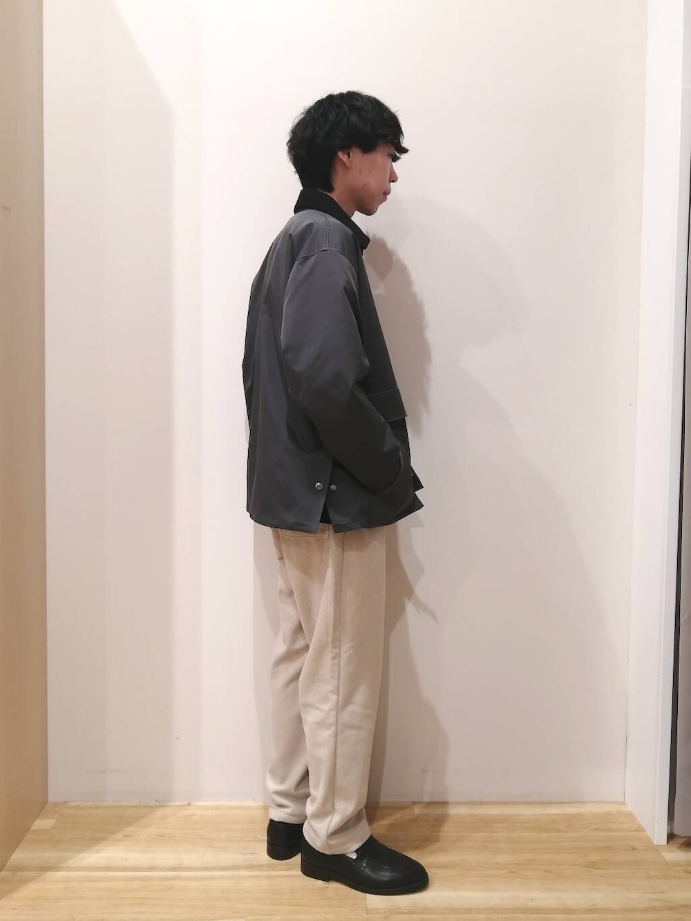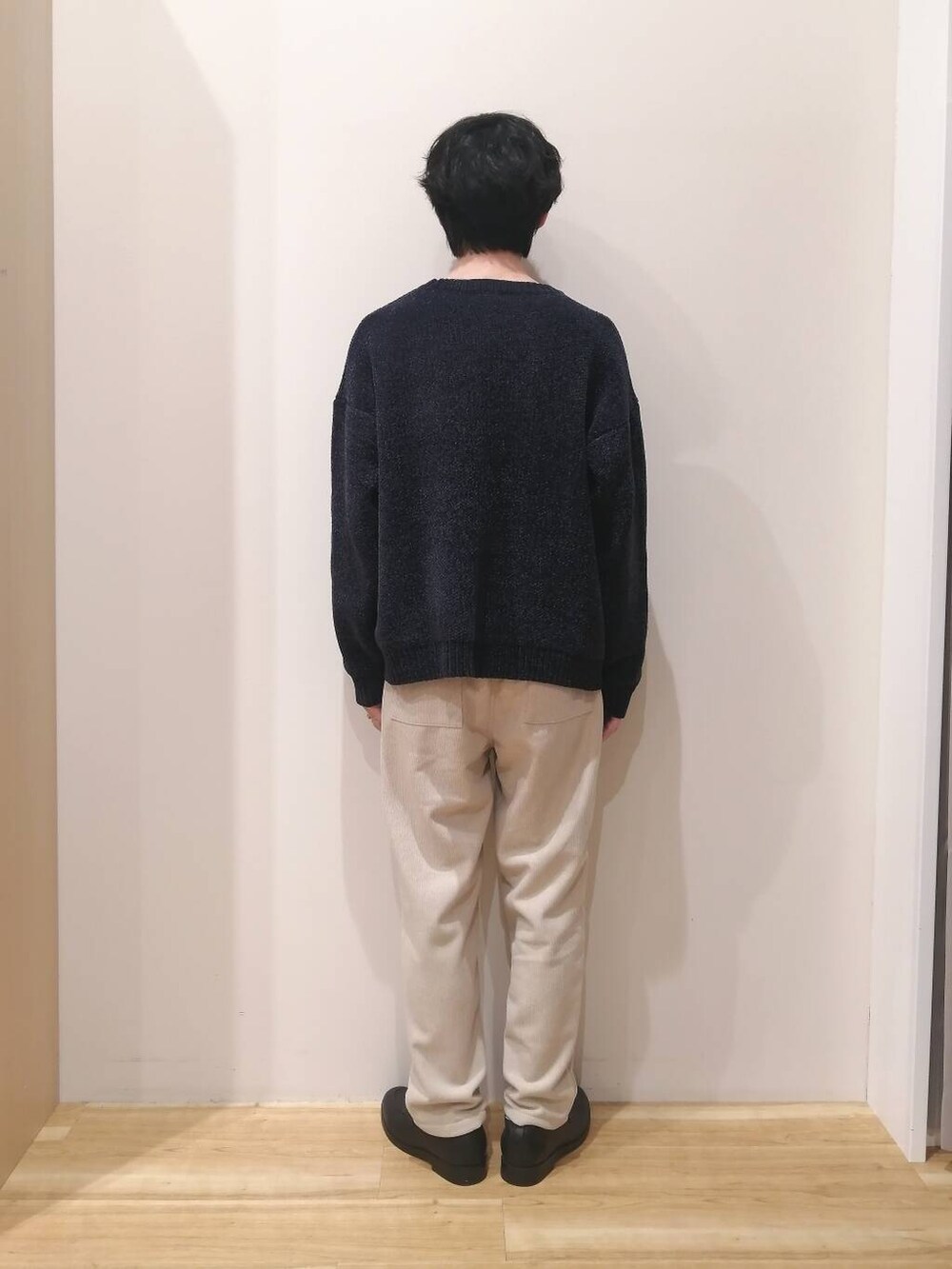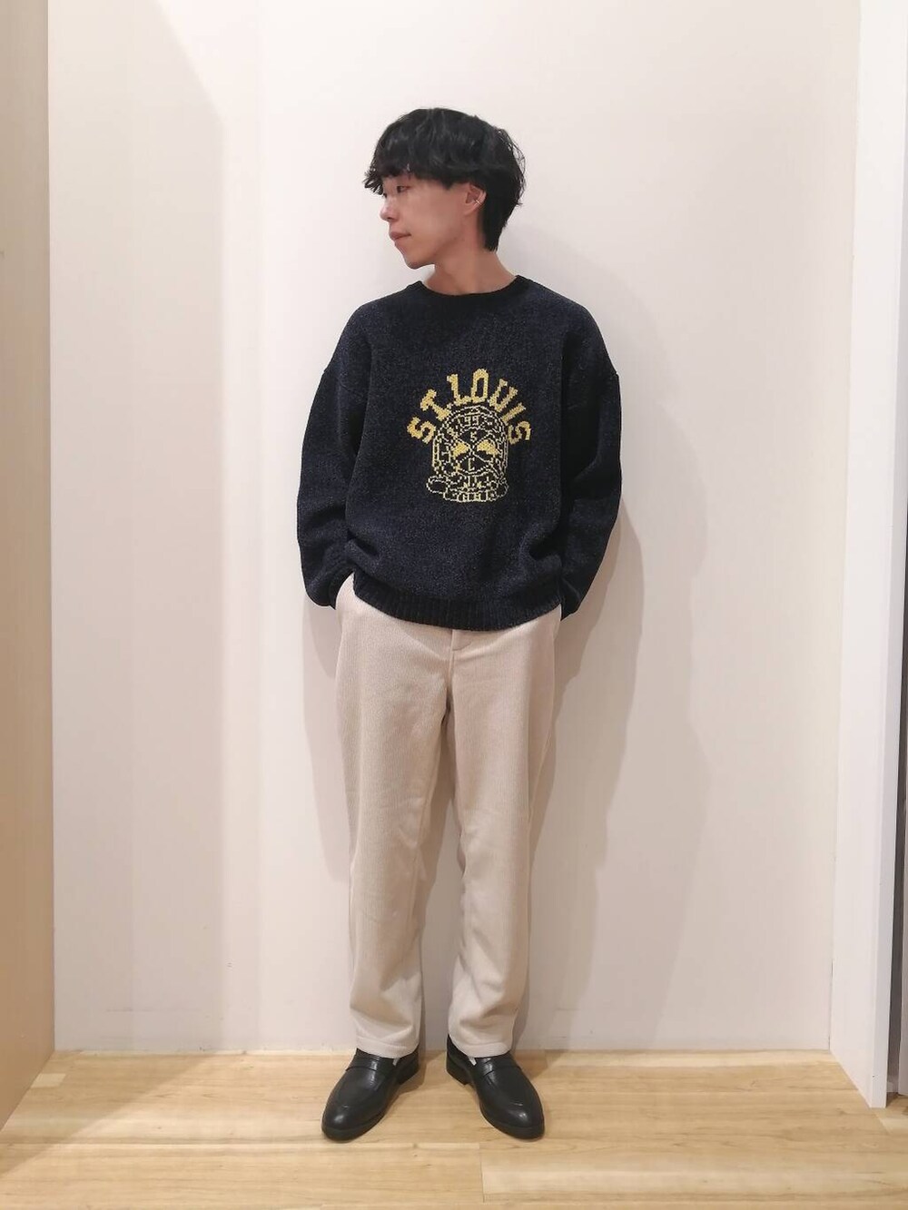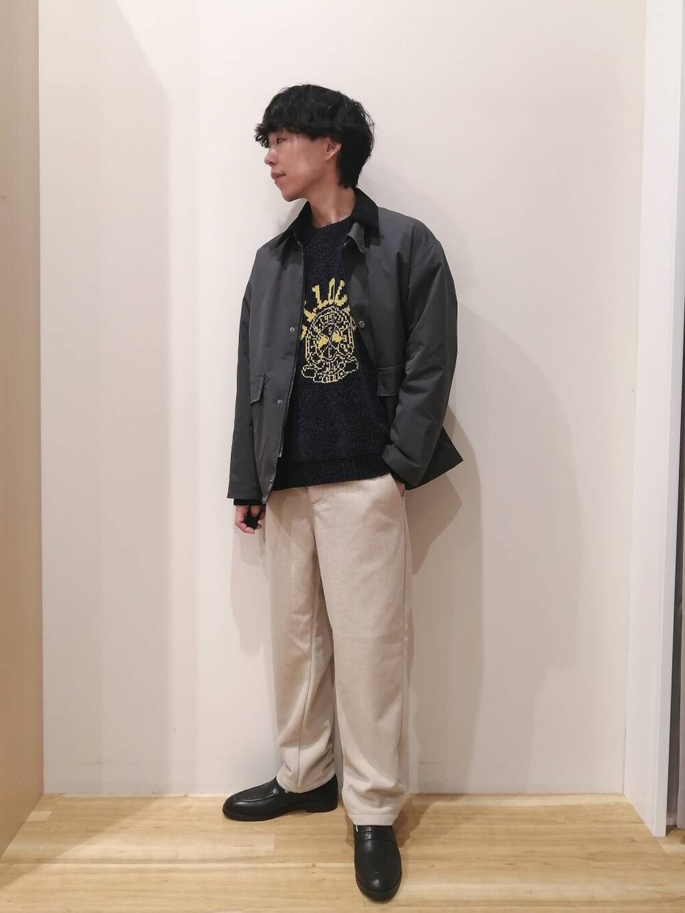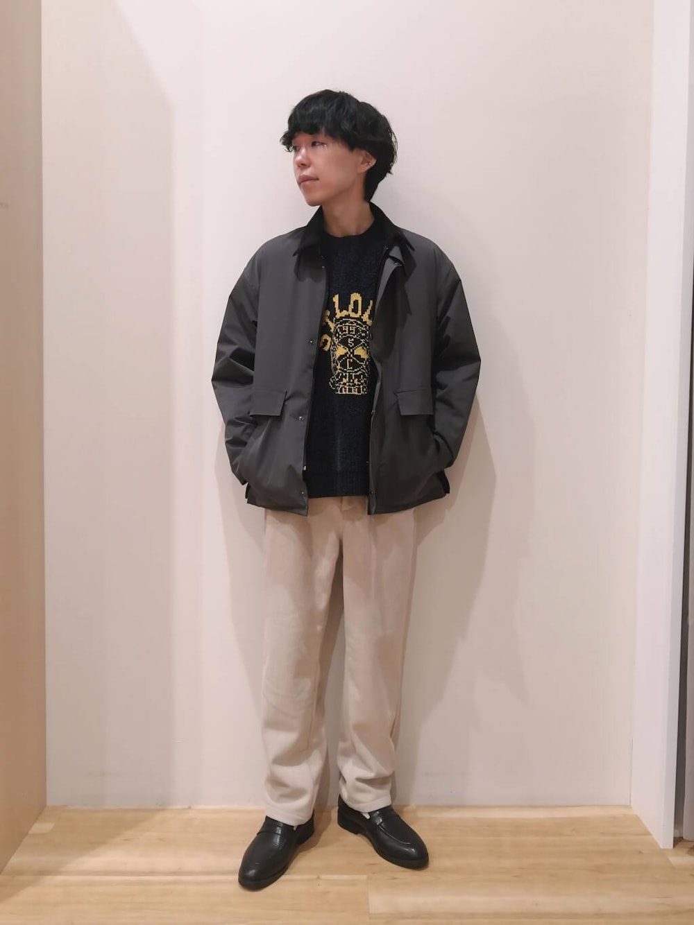 アウターとパンツはMサイズ、ニットはLサイズを着用しております。