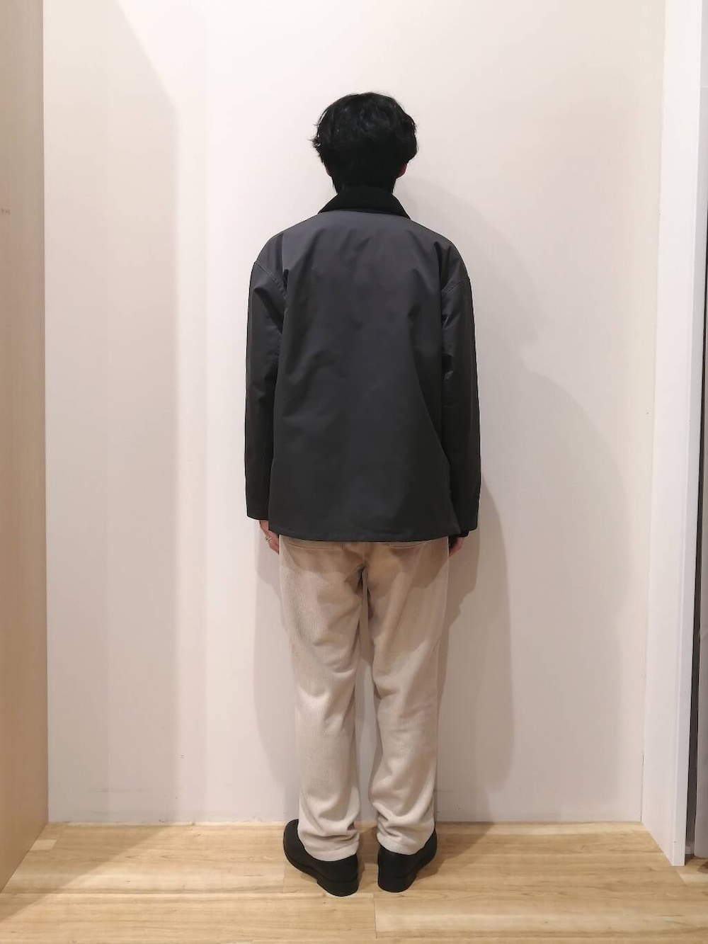 アウターはコーデュロイの襟と裏地のチェックがアクセントのジャケットになります。
