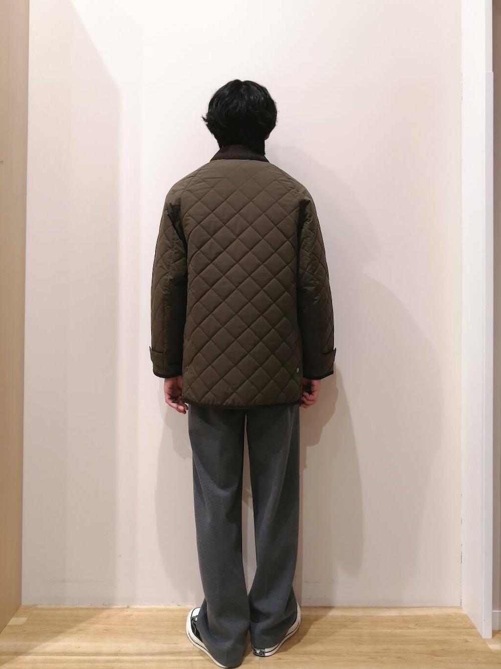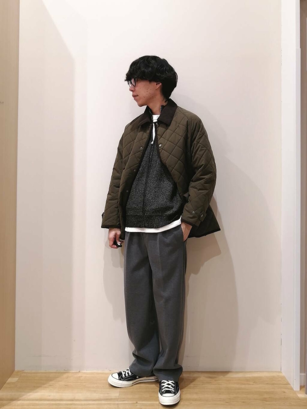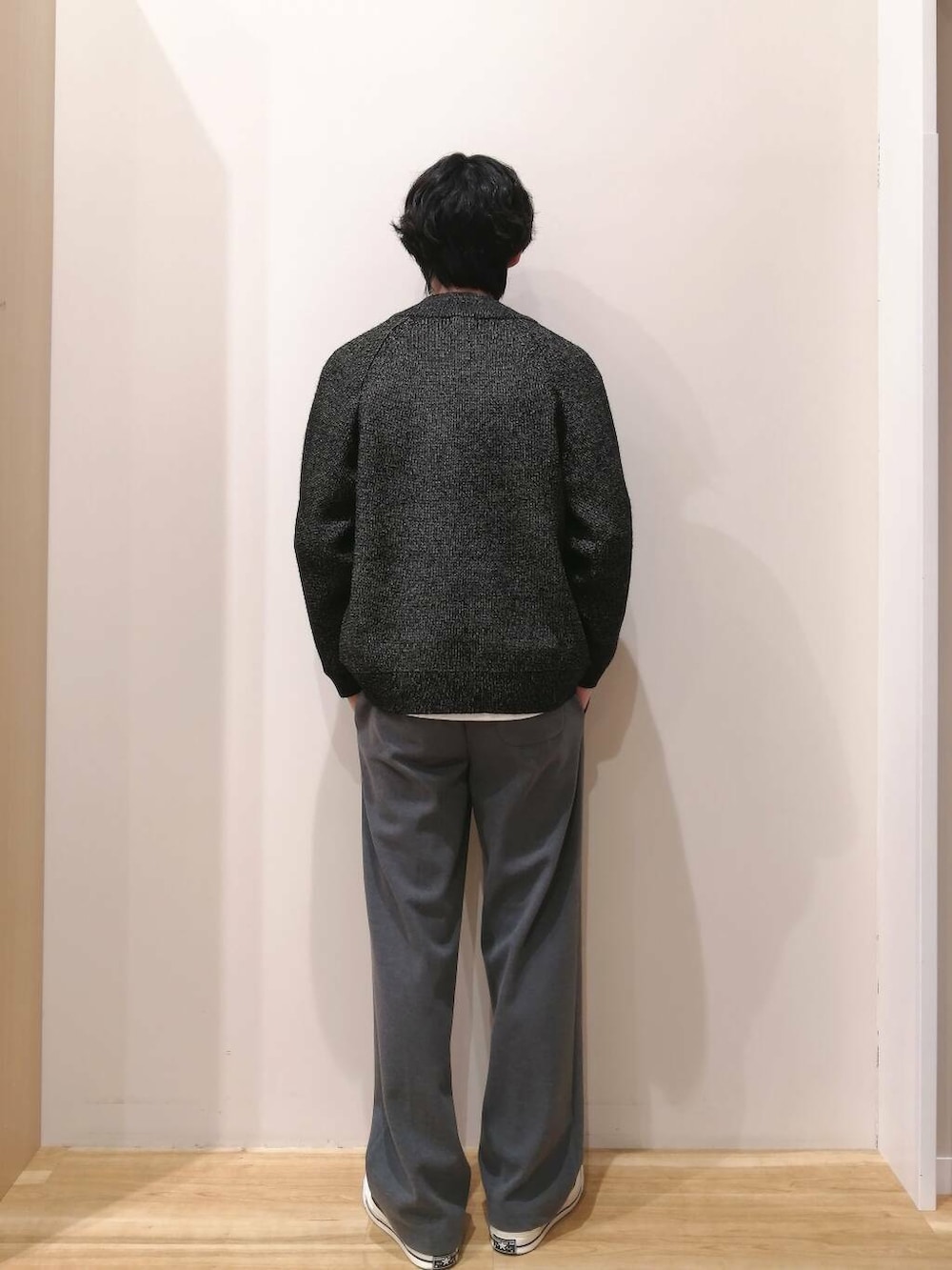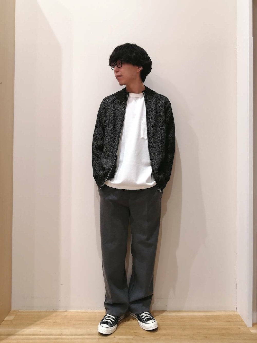 アウター、ニット、カットソーはMサイズ、パンツはLサイズを着用しております。