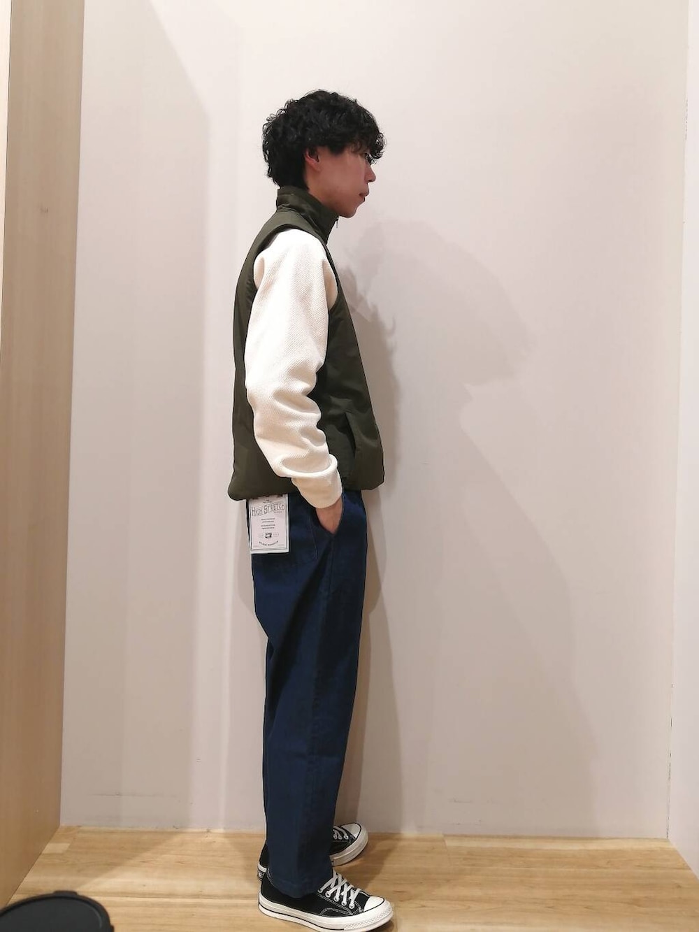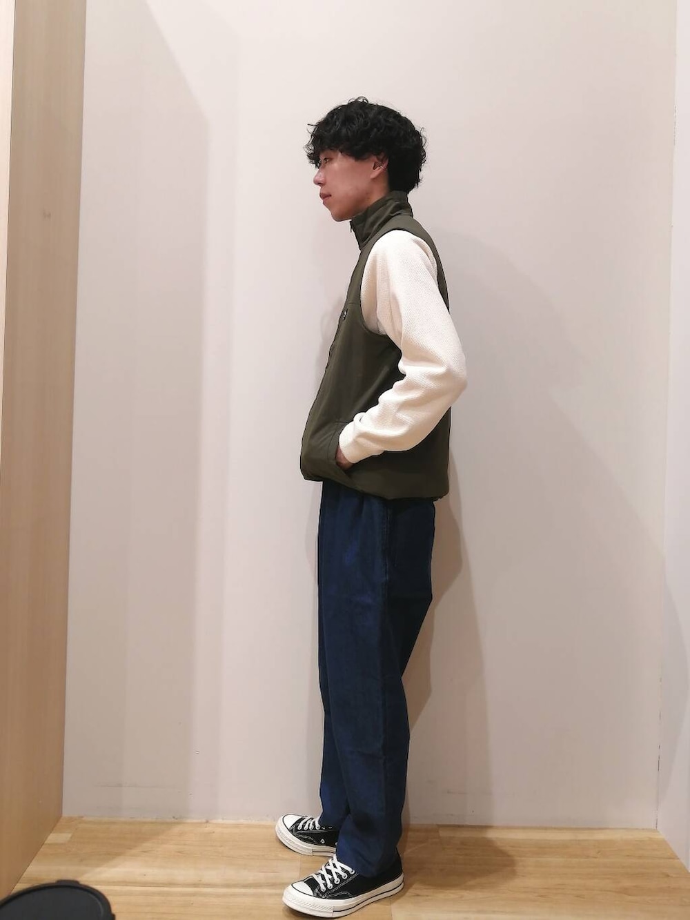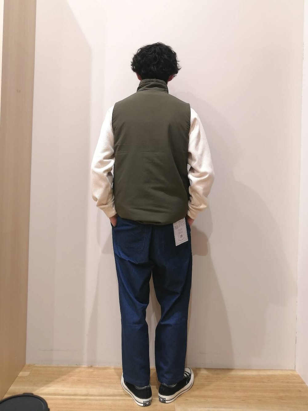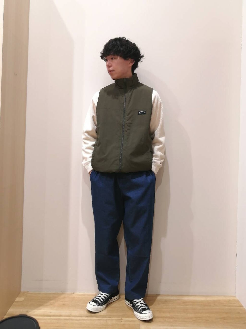 ベストとスウェットはMサイズ、パンツはLサイズを着用しております。