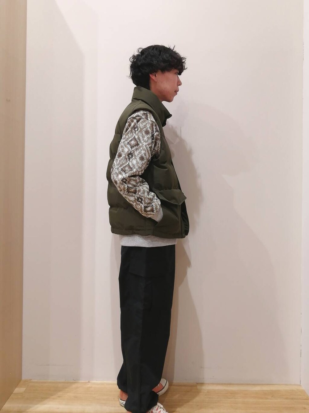 ベストはMサイズ、スウェットとパンツはLサイズを着用しております。