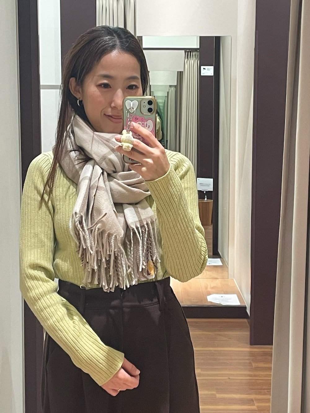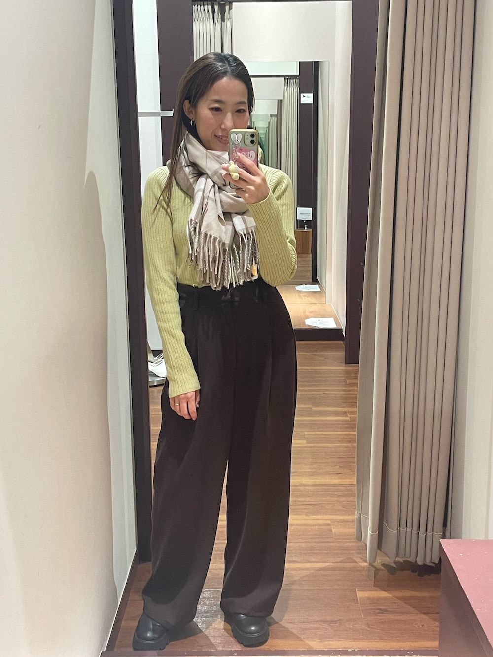 暗くなりがちな冬のコーデにポイントカラーのグリーンを合わせてみました‼︎