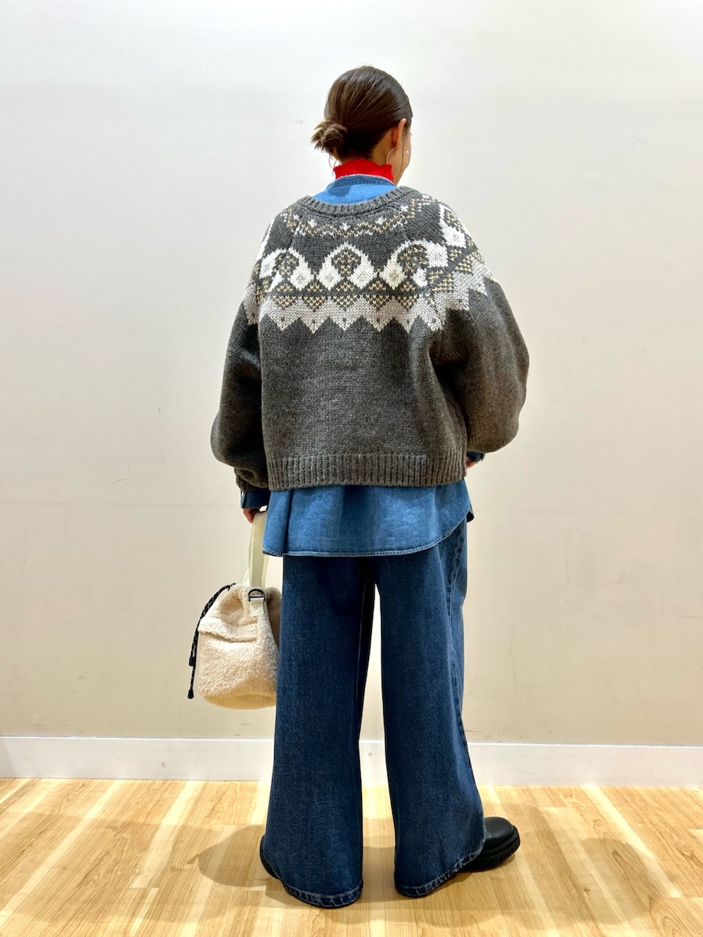 デニムシャツの中に覗かせた、赤のハイネックニットは