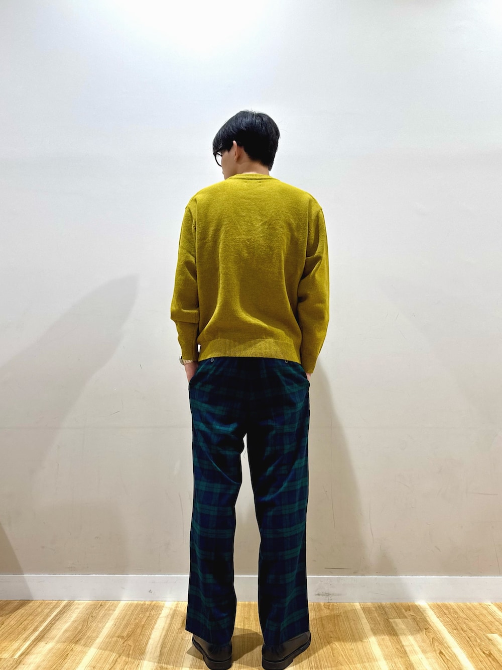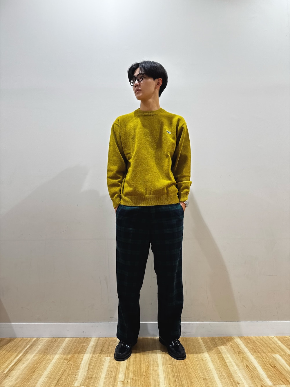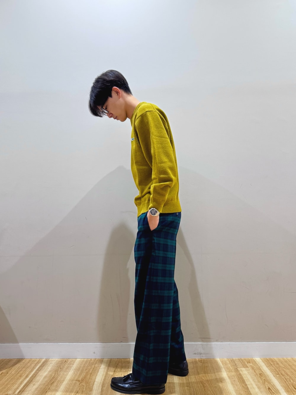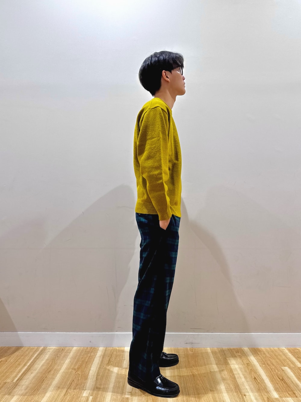 マスタードイエローのニットが主役でこれからの秋冬らしい季節感を感じさせてくれます。また、パンツはチェックパンツを組み合わせることでクラシックな雰囲気を演出でき、靴はレザーを使うことでちょうどいいフォーマル感も加わります。メガネをアクセントとして入れることで知的でプレッピーな印象になります。