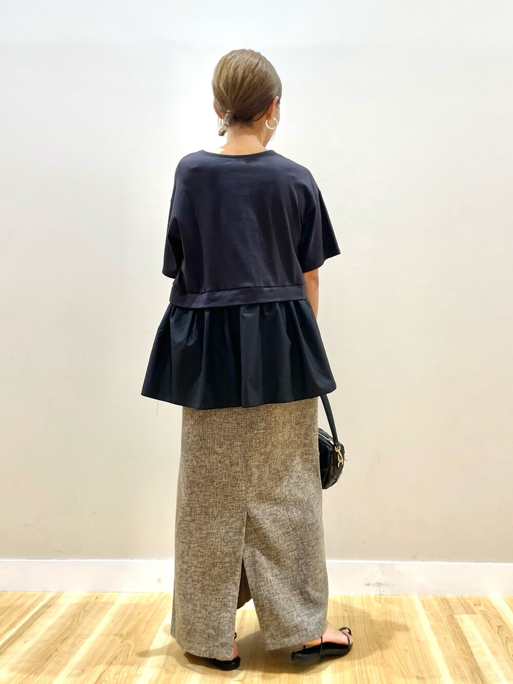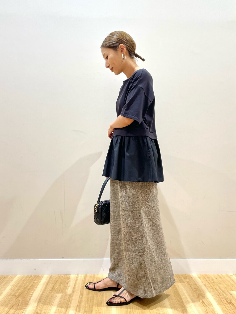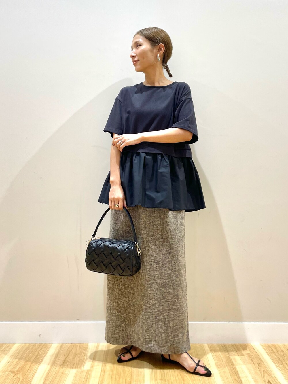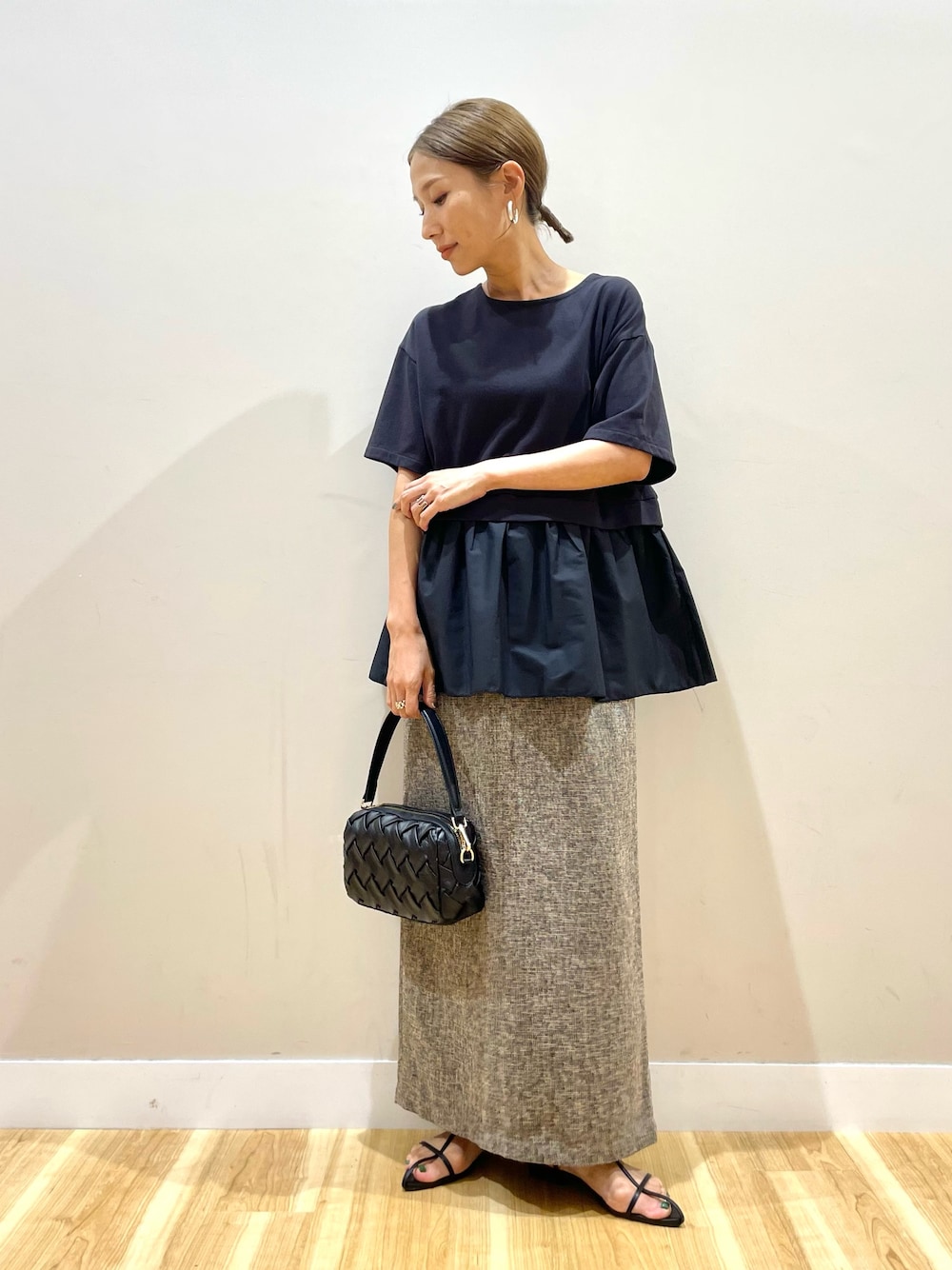 ペンシルスカートはしっかり丈感あるので高身長さんにも。ツイード風の素材で重たくなく、