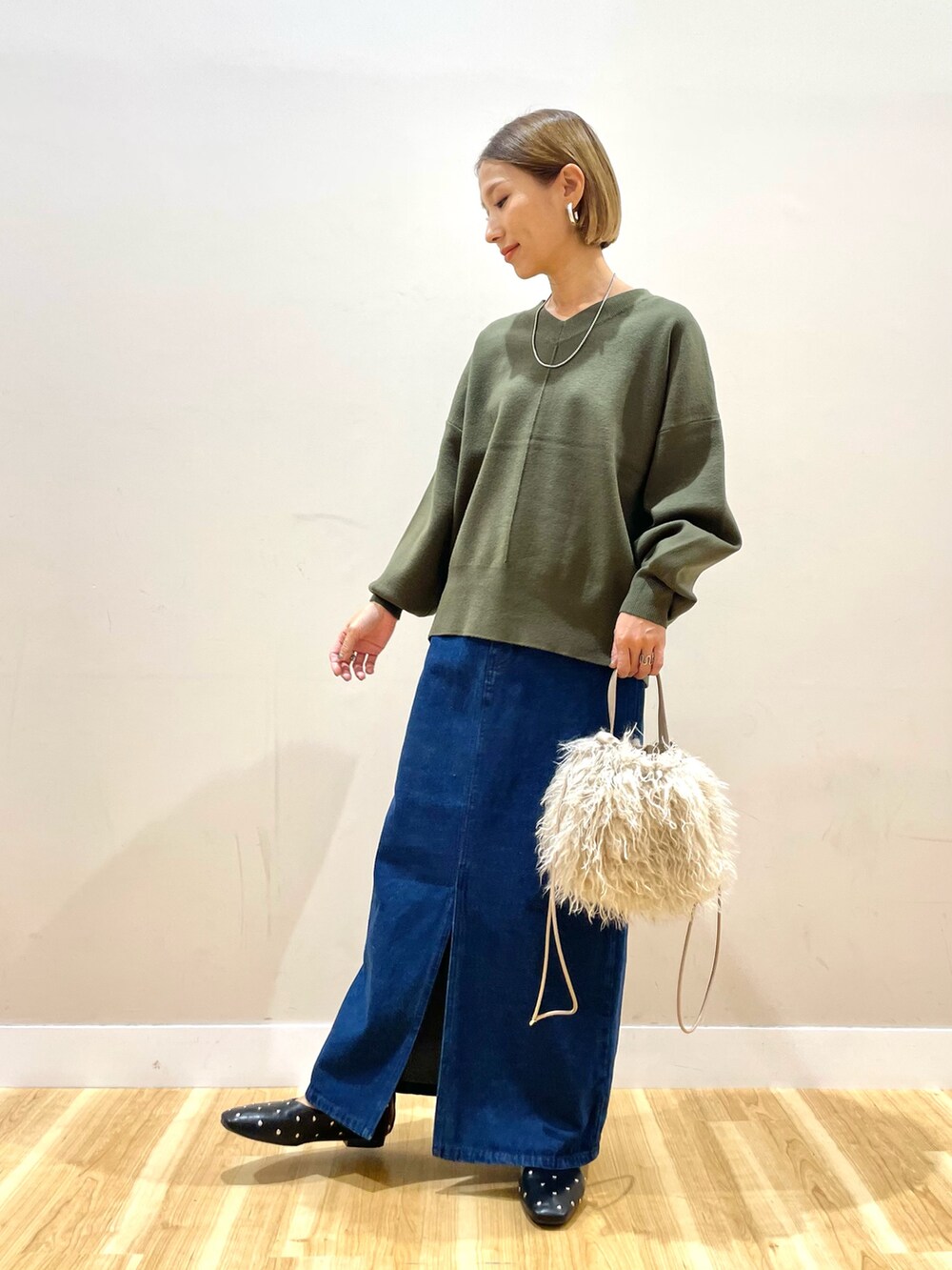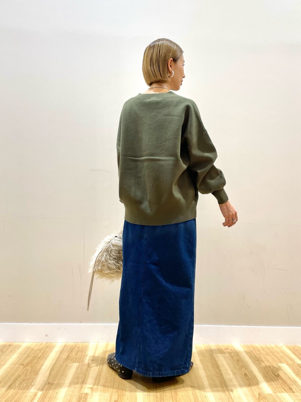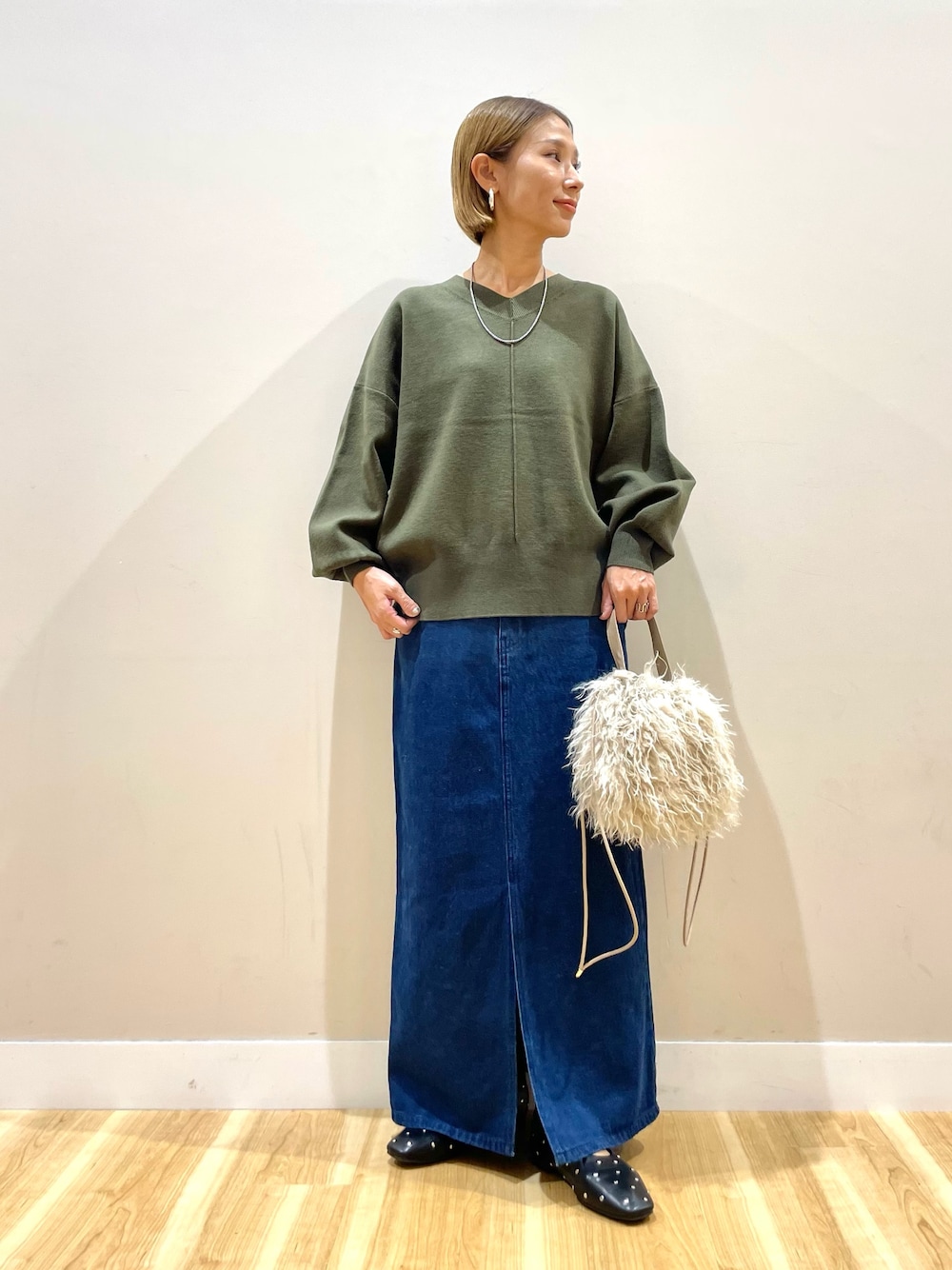 デニムタイトスカートはしっかり長さあり、